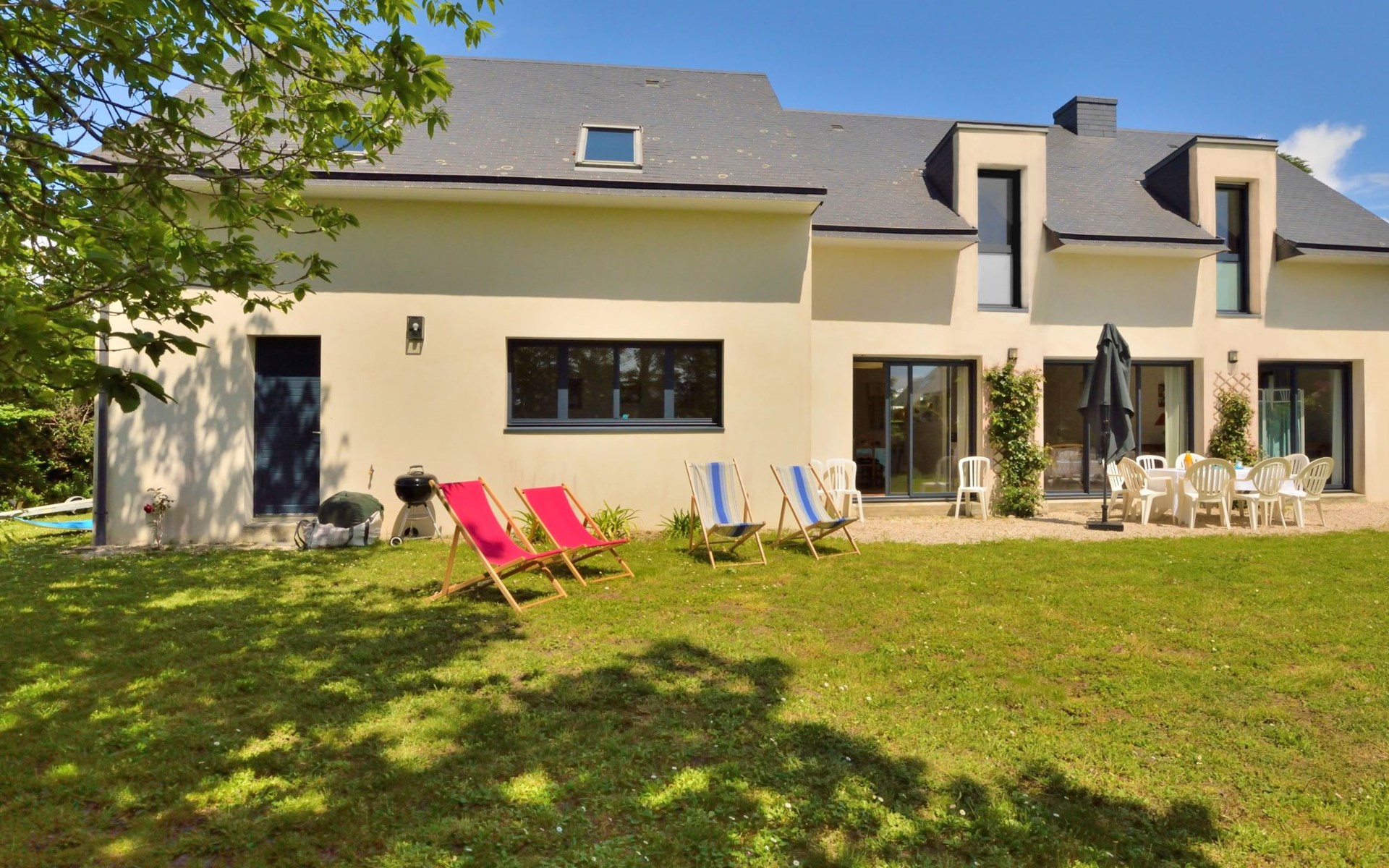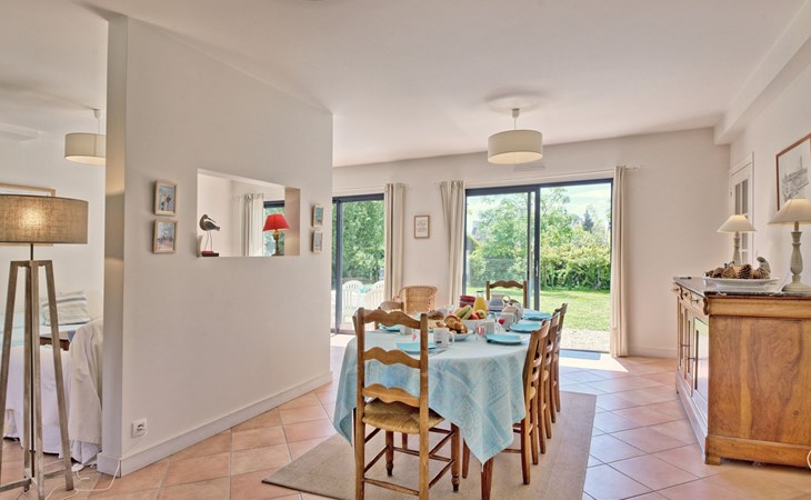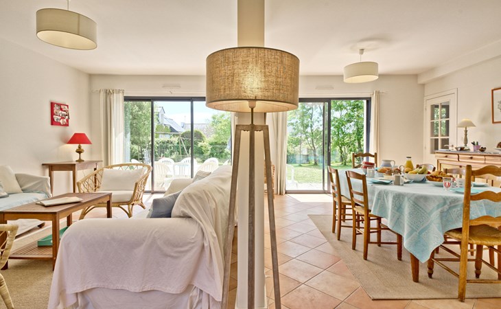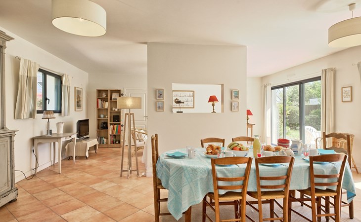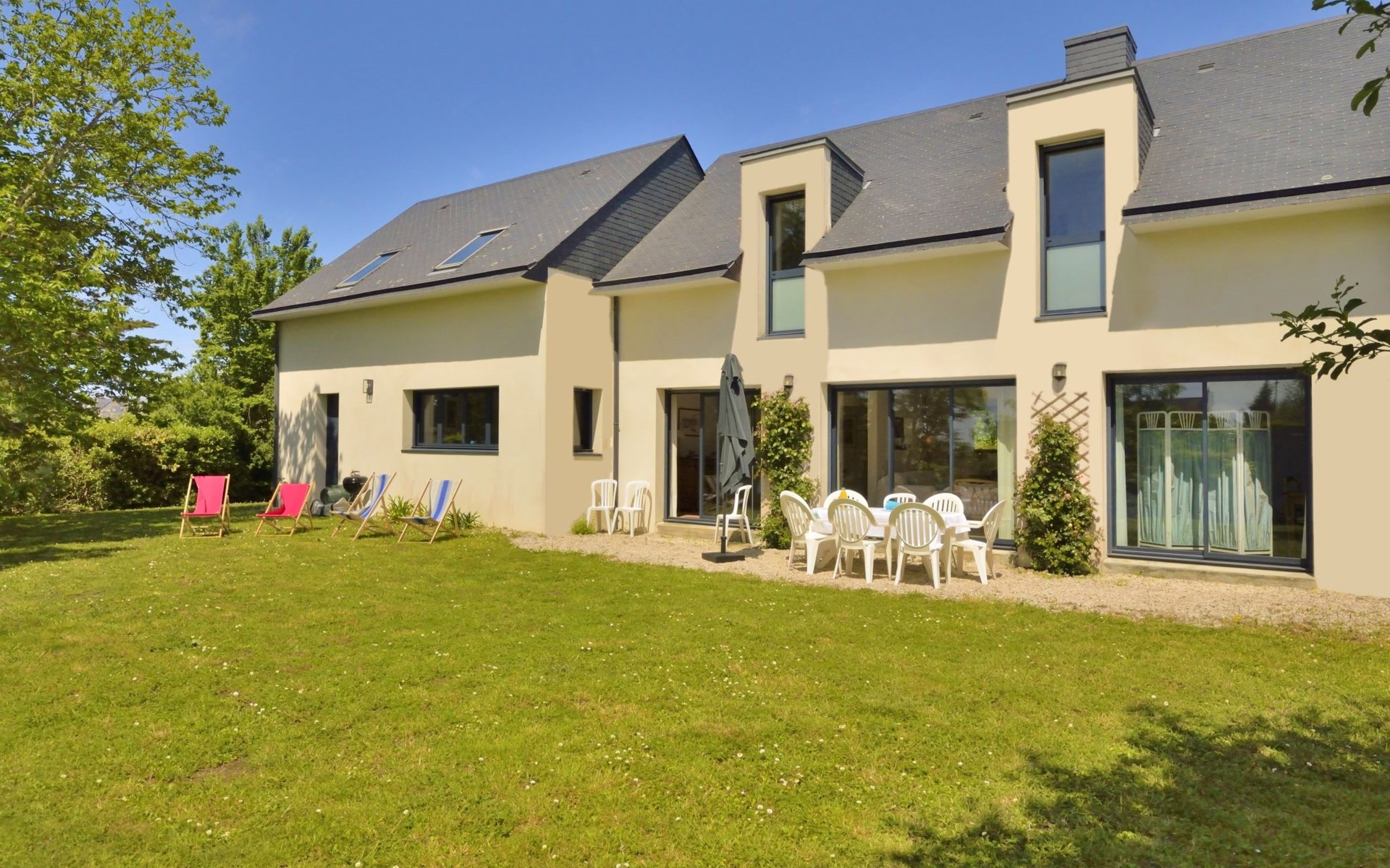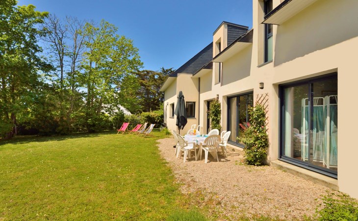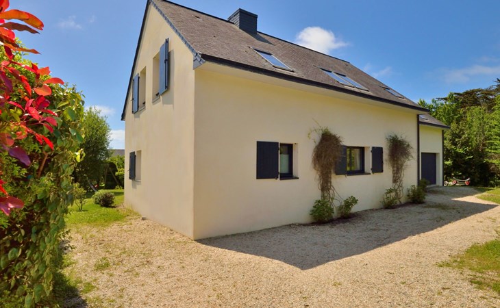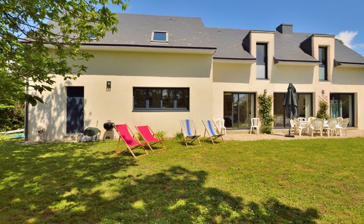 Large single-family house "Charme de Kerfago", built in 2013. In the district of Kerfago 800 m from the centre of Saint-Gildas-de-Rhuys, 7 km from the centre of Sarzeau, 350 m from the sea. Private: natural garden 850 m2 (fenced). In the house: storage room for bicycles. Storeroom available. Parking (for 3 cars) on the premises. Shop 800 m, supermarket 900 m, restaurant, bakery 600 m, bicycle rental 900 m, bus stop 800 m, sandy beach "Plage de Kerfago" 350 m. Sports harbour 400 m, sailing school 2 km, tennis 500 m. Nearby attractions: Golfe du Morbihan 5 km, Port-Crouesty-Arzon 9 km, Vannes 32 km, Carnac (Megalithes) 60 km. Hiking paths: GR34. The owner does not accept any youth groups.