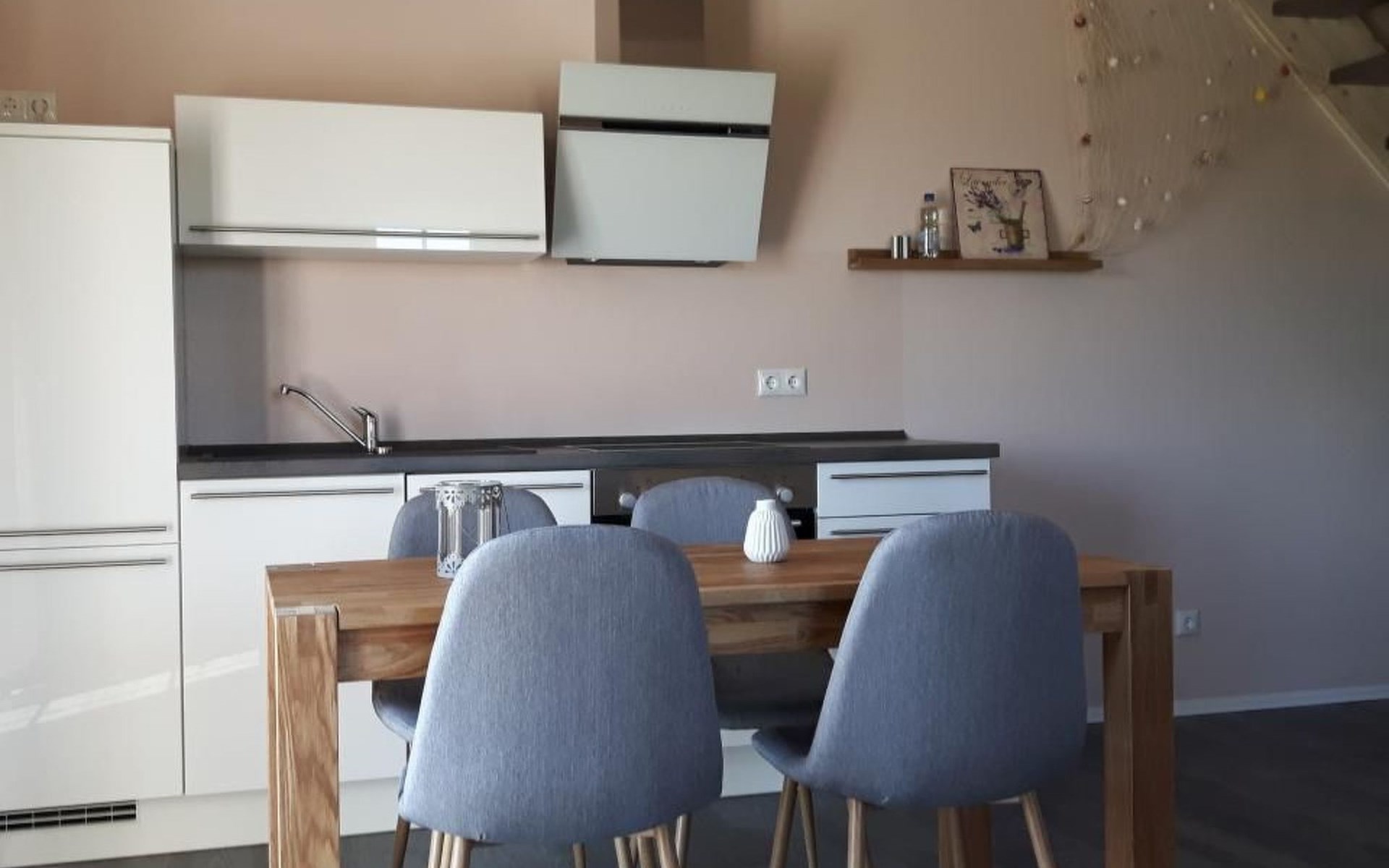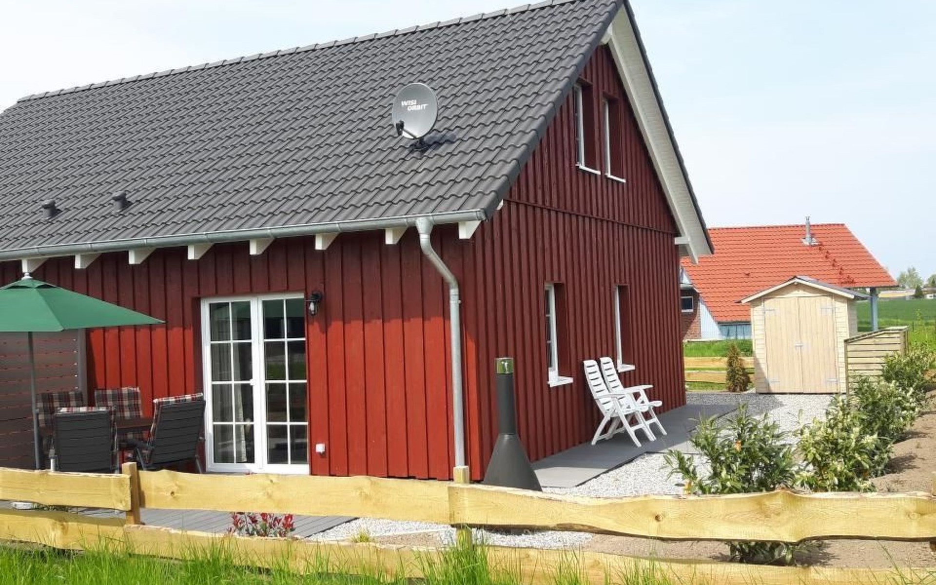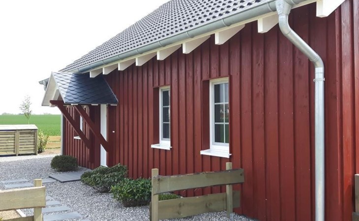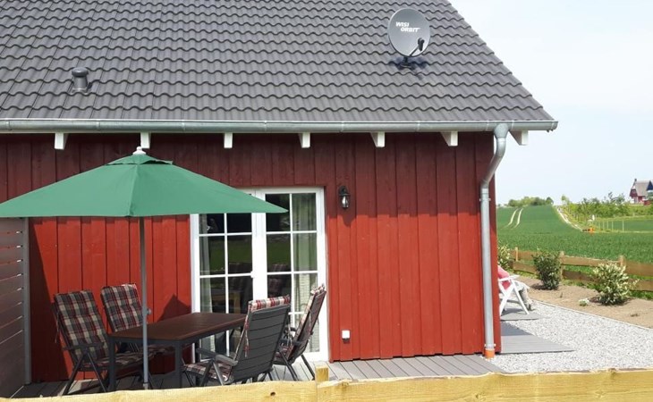 House 16b (semi-detached house) has a living space of approx. 52 square metres and is newly and modernly furnished. The original Swedish red (faluröd) wooden façade, the white doors and lattice windows and the lovingly landscaped outdoor area make the holiday home friendly and inviting. On the ground floor there is an open-plan living and dining room with kitchen, hallway and bathroom, upstairs there is a bedroom with a double bed and another bedroom with two single beds. There is a flat-screen TV with satellite reception in the living area. The bathroom has a large floor-to-ceiling/barrier-free shower.
