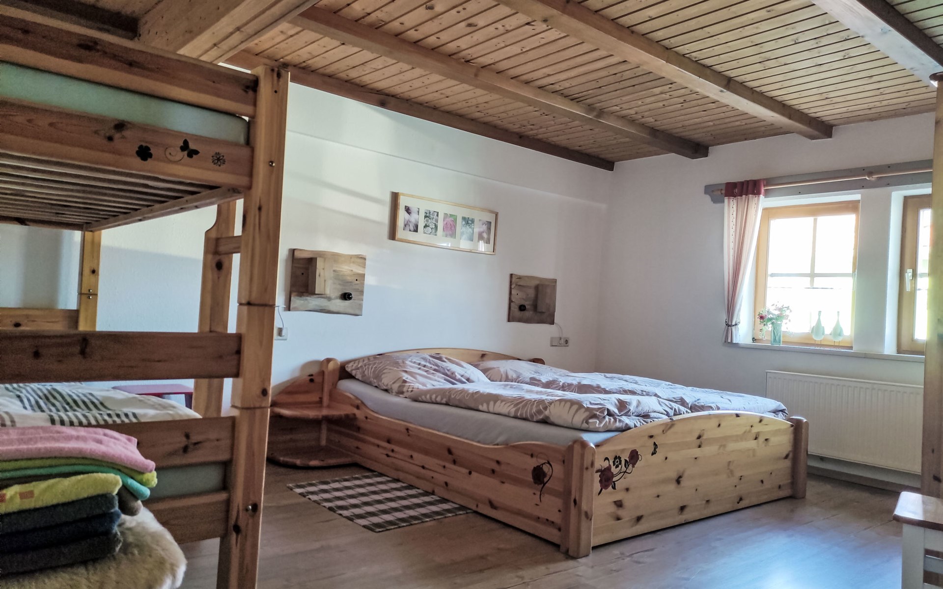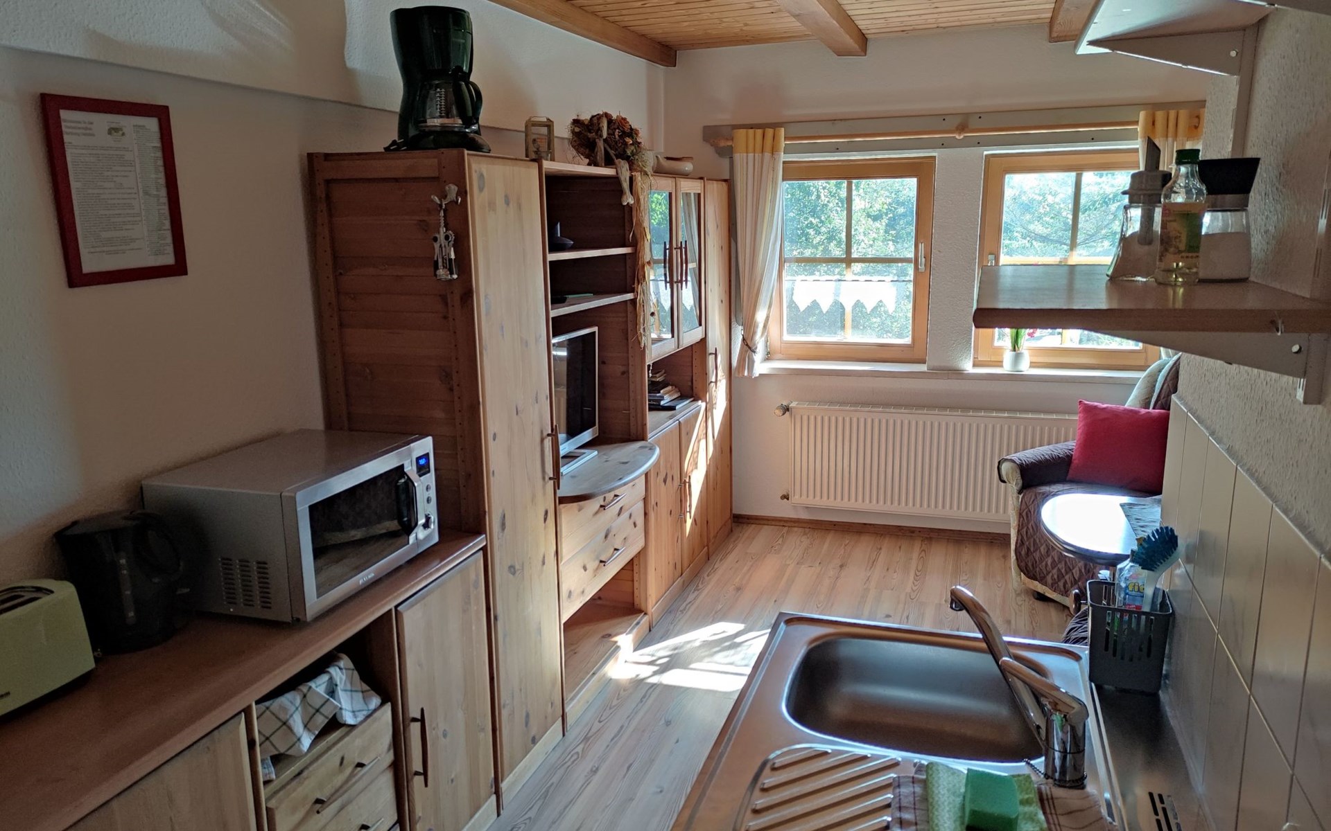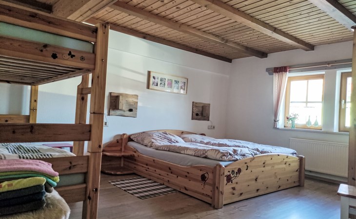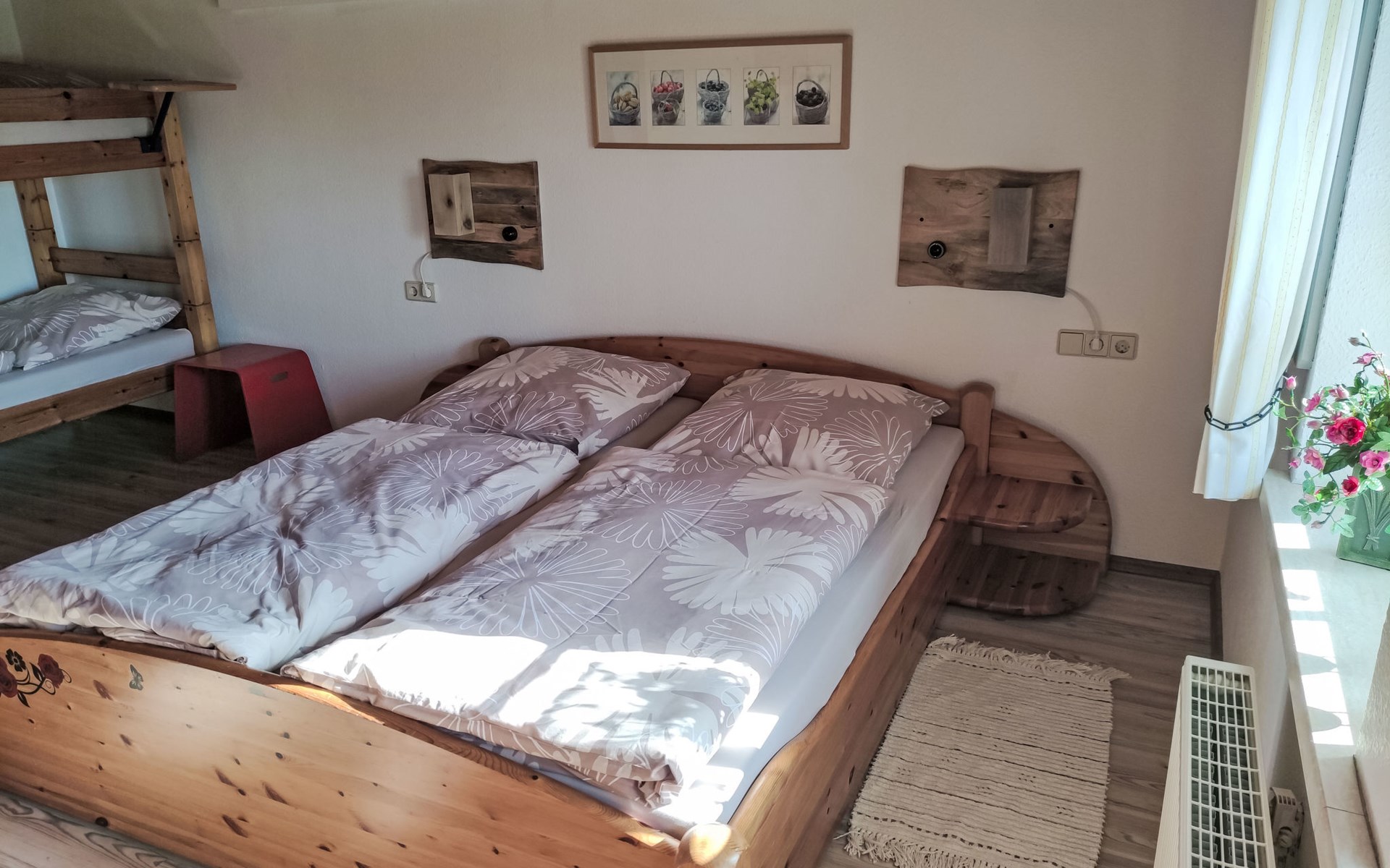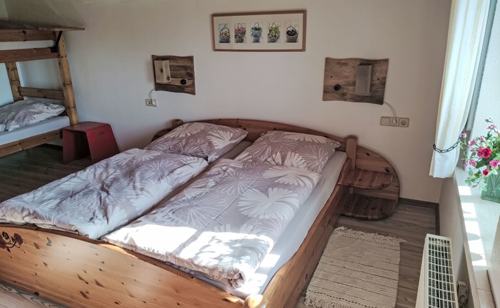 In the holiday flat there is a spacious bedroom with a 2.0*1.8 m double bed and a 2.0*0.9 m bunk bed as well as optional space for an extra bed or baby cot. The seating area in the living area is furnished with a sofa bed (approx. 0.8*1.75 m), sitting area and TV wall unit. There is a cooking area between the entrance to the flat and the living area. The cooking area is equipped with a single kitchen with refrigerator and 2 hobs, a microwave, coffee machine, toaster and other things for max. 4 persons. The sanitary facilities (shower/WC/washbasin) are located in the shower/WC room, which is adjacent to the cooking/living area.