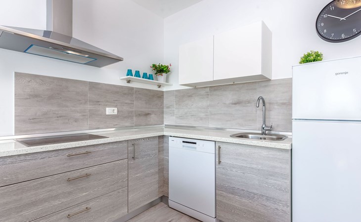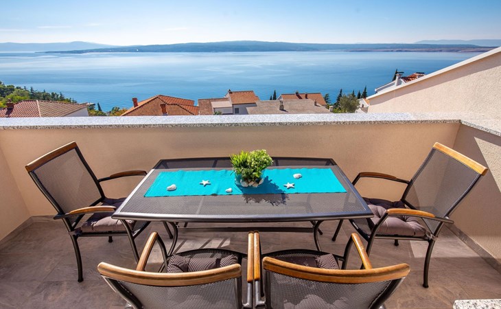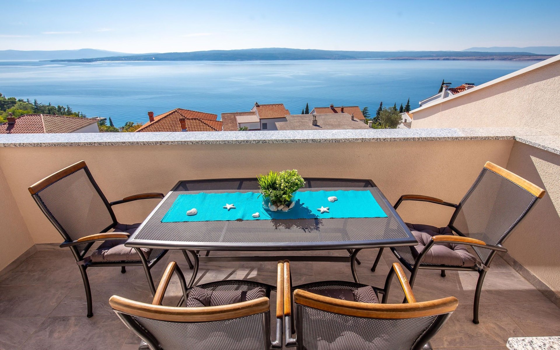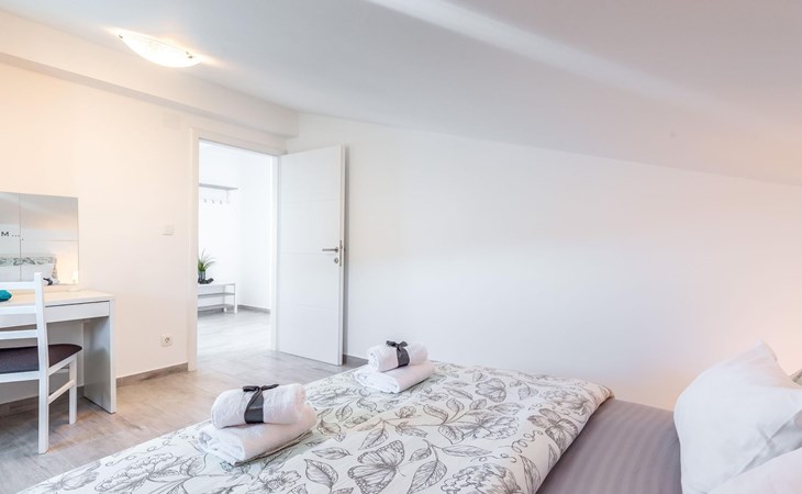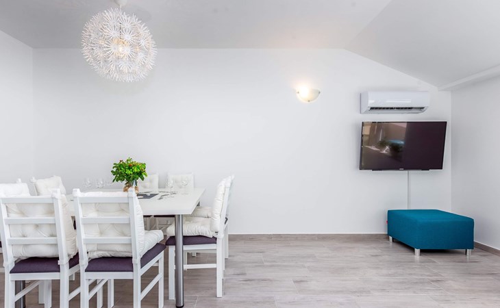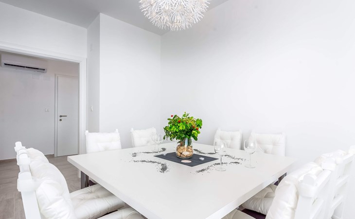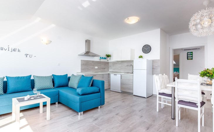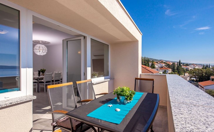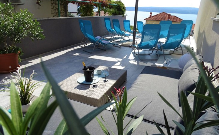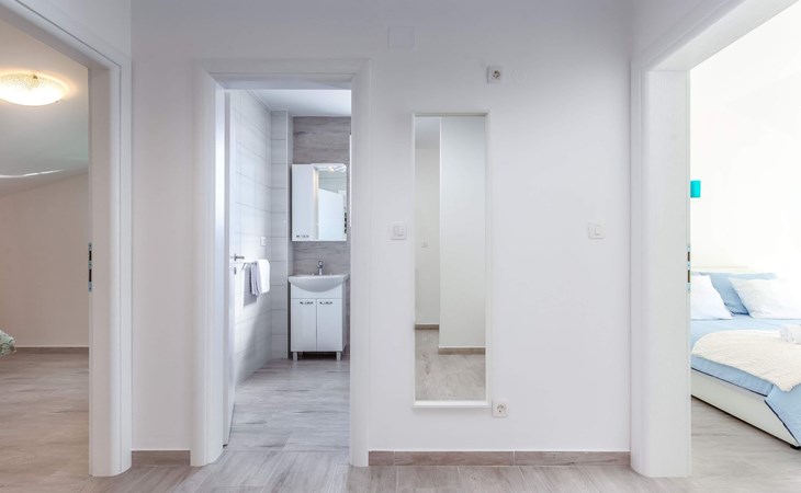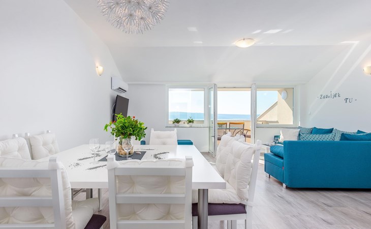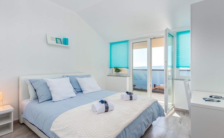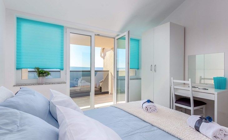 This apartment is located on the third floor and has three bedrooms – one with a double bed and a balcony with beautiful sea views, one with a double bed, and one with two box-spring beds. This apartment also has two bathrooms with shower and toilet, and a separate toilet. There is air conditioning in the living room, as well as in the hallway. From the living room, you have a balcony with stunning sea views.