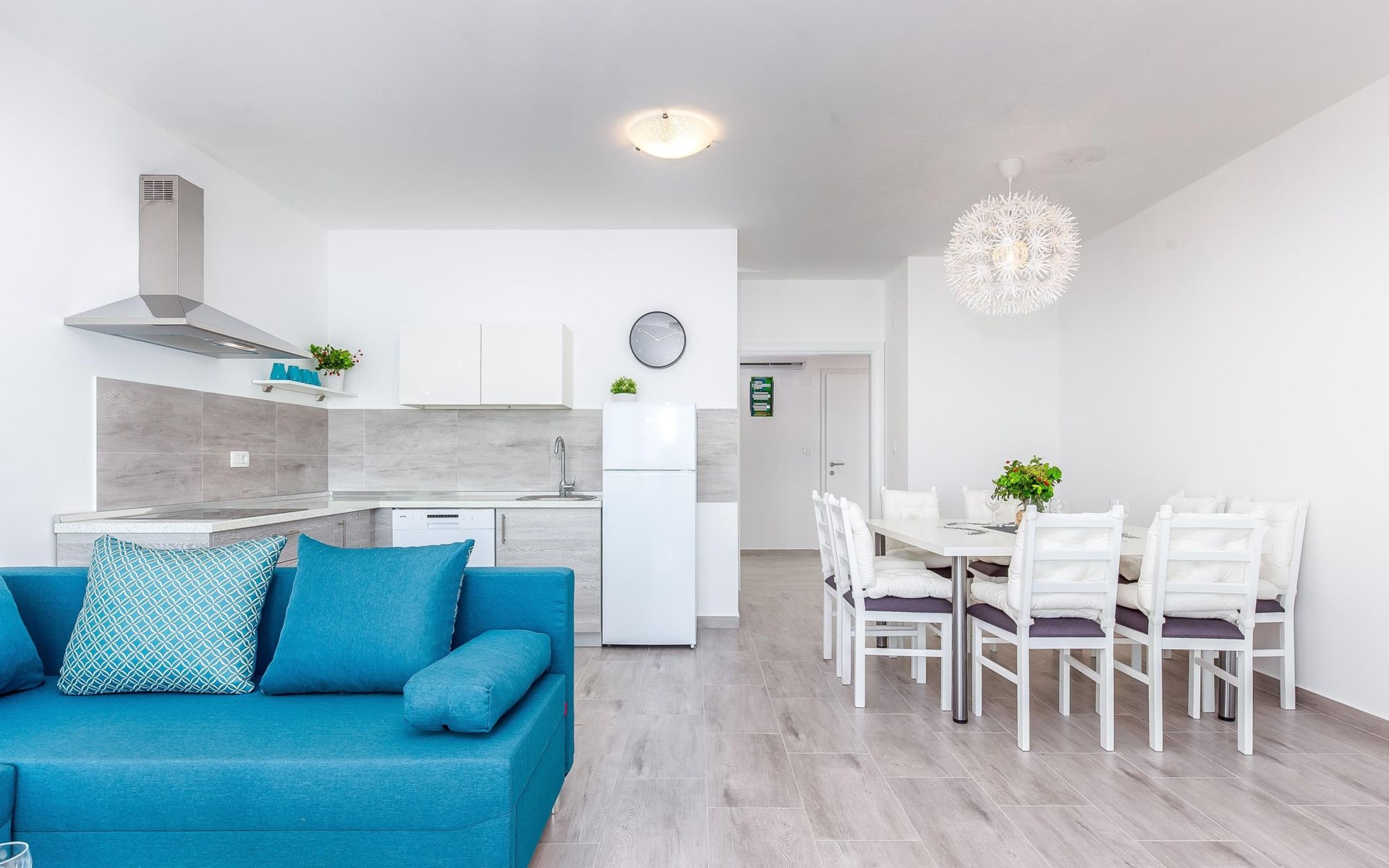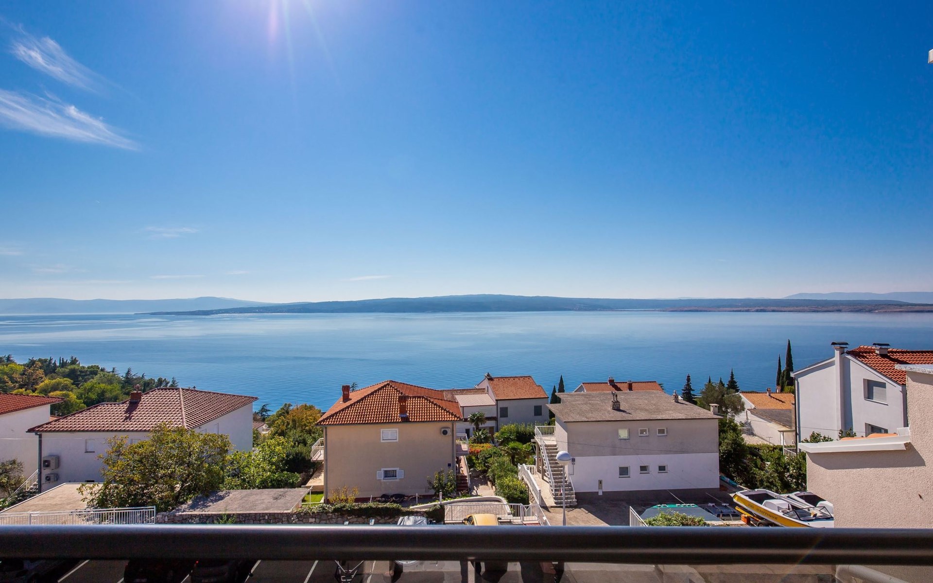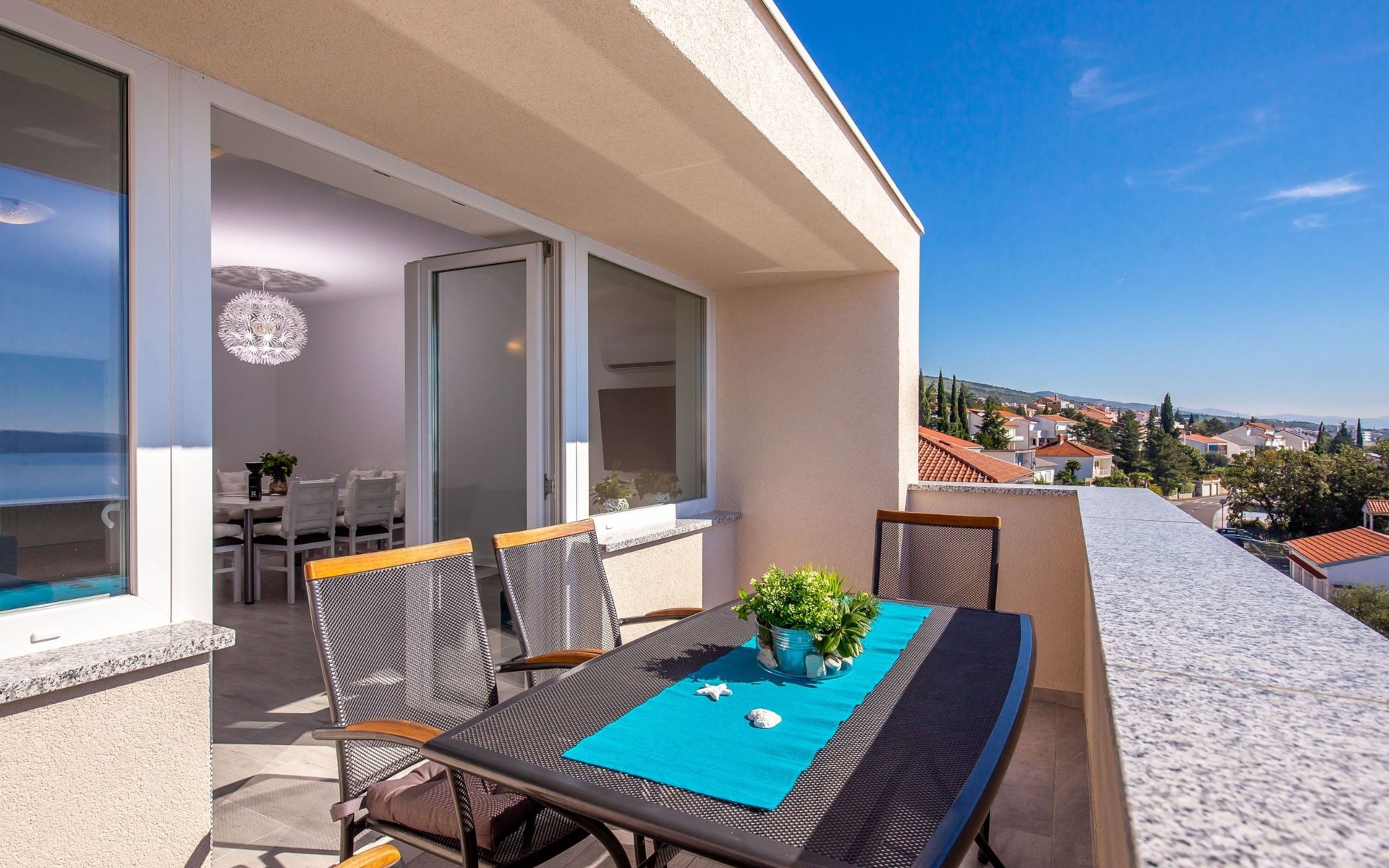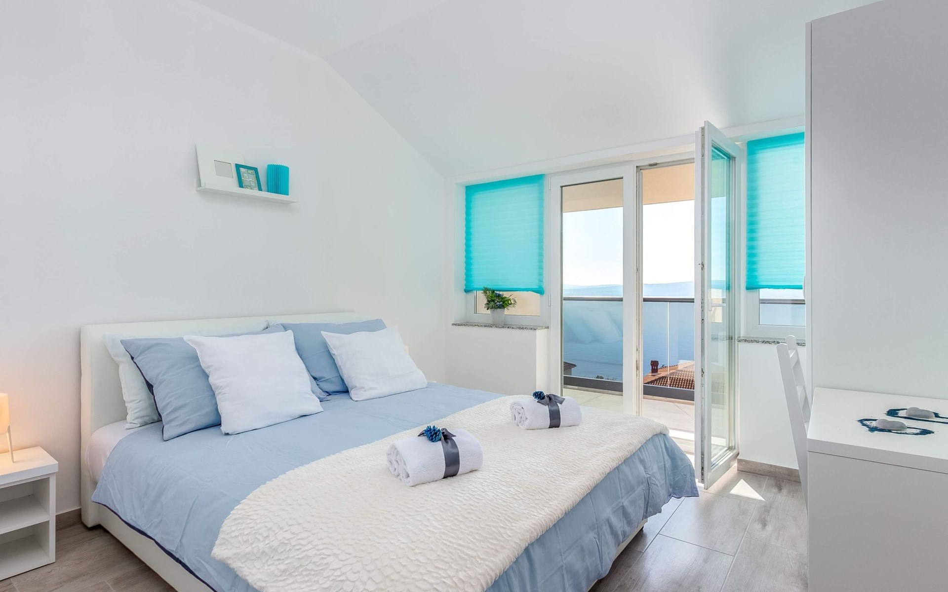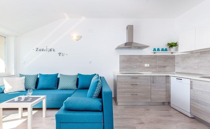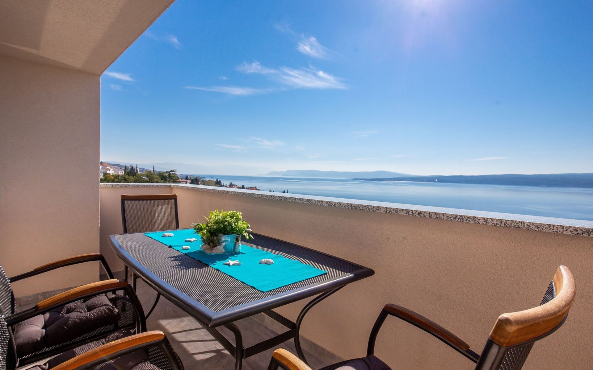 This apartment is located on the third floor and has three bedrooms – one with a double bed and a balcony with beautiful sea views, one with a double bed, and one with two box-spring beds. This apartment also has two bathrooms with shower and toilet, and a separate toilet. There is air conditioning in the living room, as well as in the hallway. From the living room, you have a balcony with stunning sea views.
