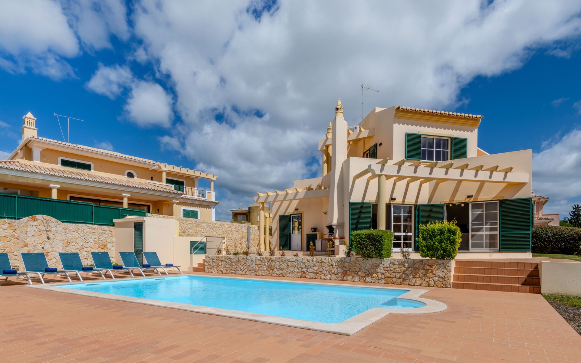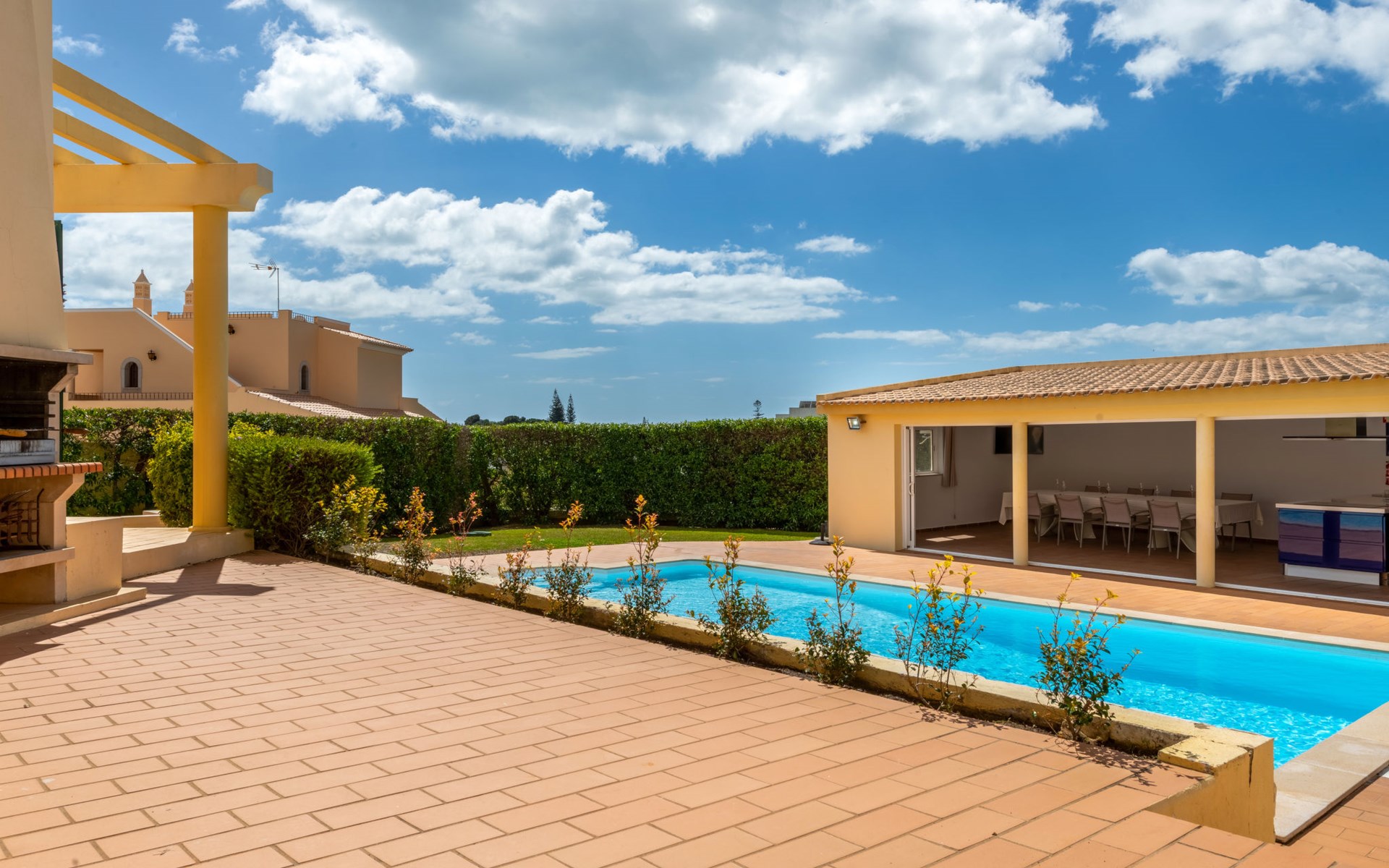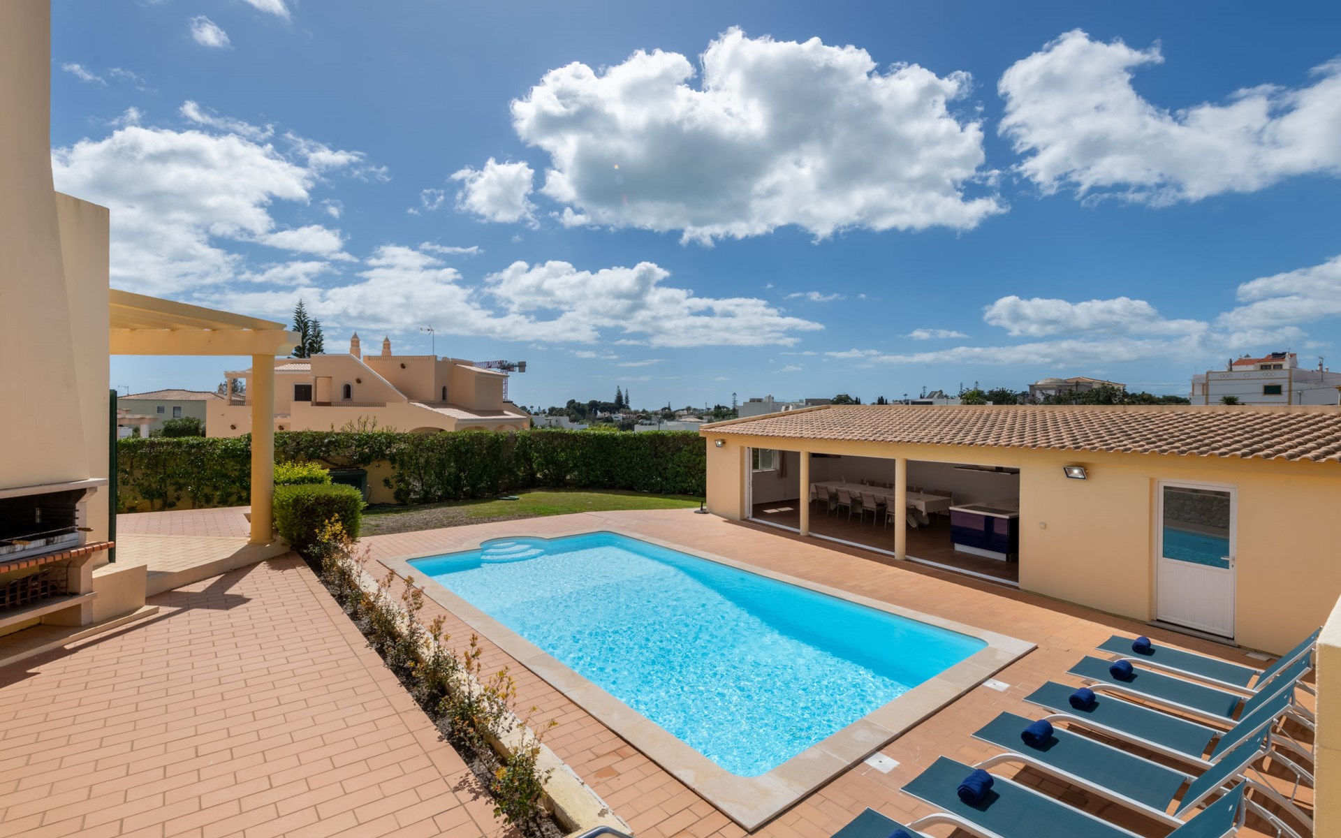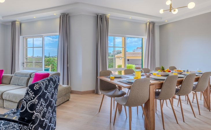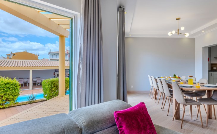 Very cosy villa "Mar", detached in 2025. Outside the resort, 1.7 km from the centre of Armação de Pêra, residential area (villas), 850 m from the sea. Private: natural state property (fenced), swimming pool angular (4 x 8 m, depth 80 - 190 cm, seasonal availability: 01.Jan. - 31.Dec.). Barbecue. In the house: WiFi, washing machine. Shop 1.3 km, grocery 1.3 km, supermarket 1.3 km, shopping centre 9.8 km, restaurant 700 m, bar 950 m, bakery 1.9 km, café 700 m, pedestrian zone 900 m, bicycle rental 10.2 km, bus stop 750 m, sandy beach "Praia do Olival" 850 m. Marina 11.7 km, golf course (18 hole) 7.2 km, surf school 8.8 km, tennis 1.4 km, children's playground 1.3 km. Nearby attractions: Zoomarine 10.3 km, Banzai boggan 6.6 km, Krazy World 14.9 km, Sand City 6.9 km, Algarve Shopping 11.1 km, Bowling Marina Albufeira 12.9 km. Hiking paths: Lagoa dos Salgados 7.4 km. Please note: car recommended. Suitable for families. Loading and unloading of baggage is possible at the holiday house. This house has a second kitchen that supports the pool.