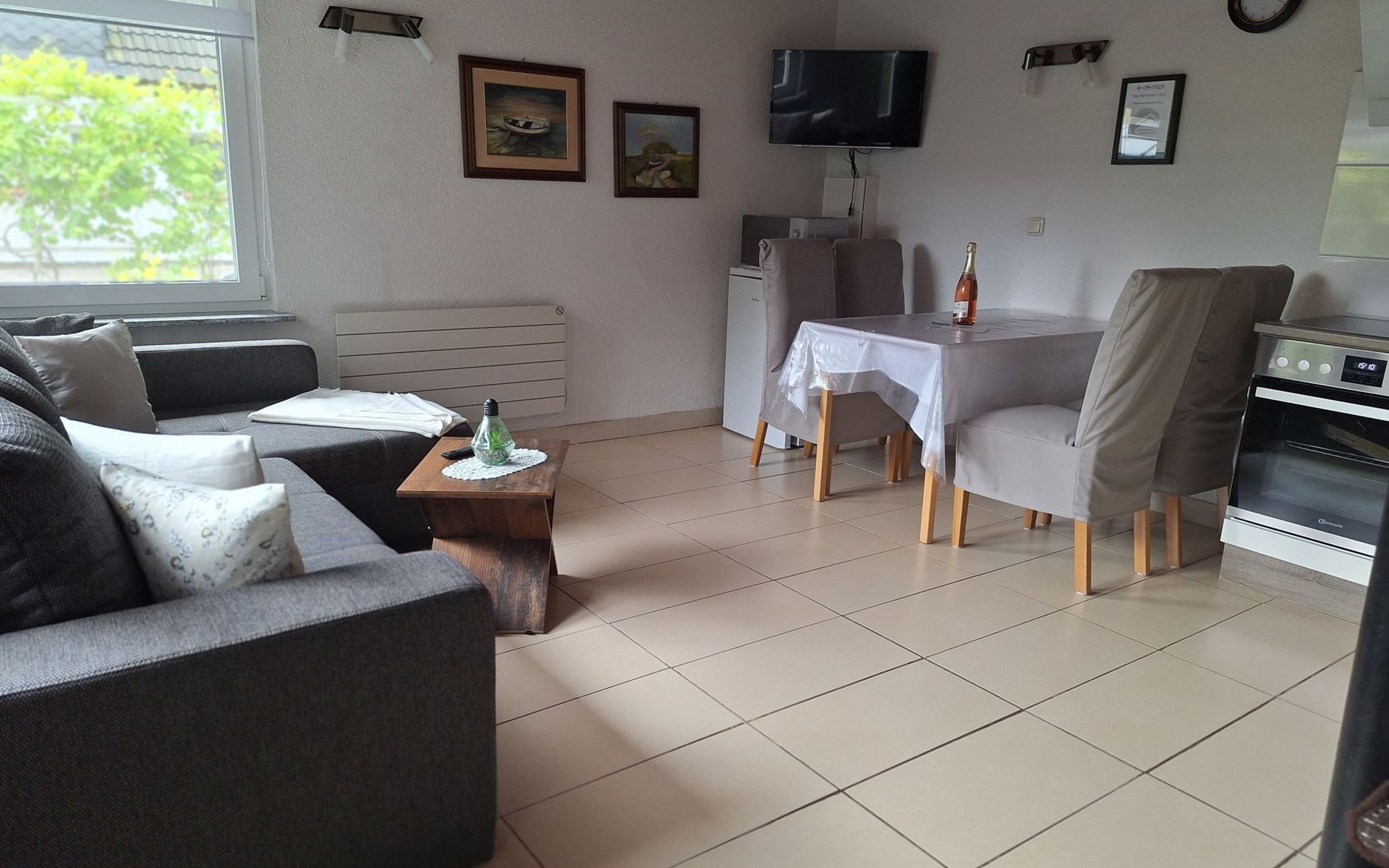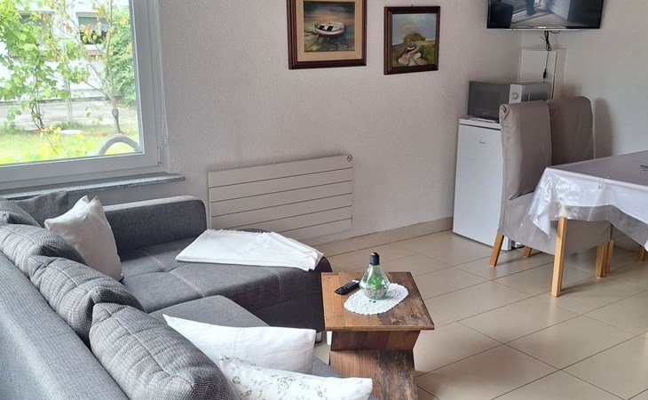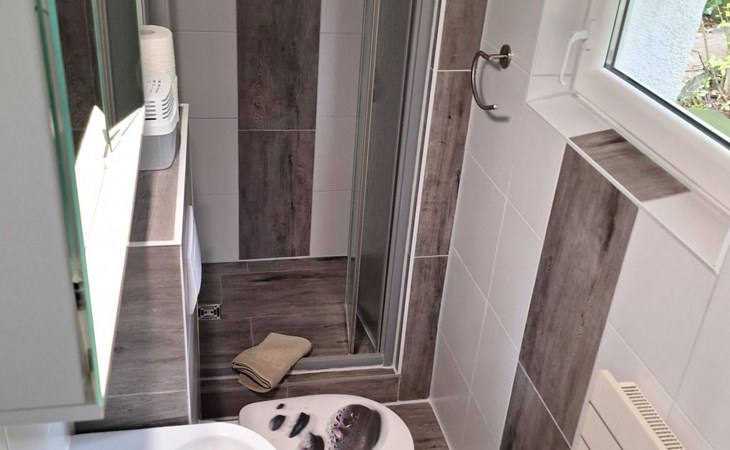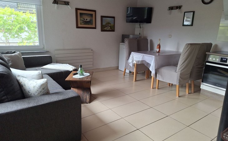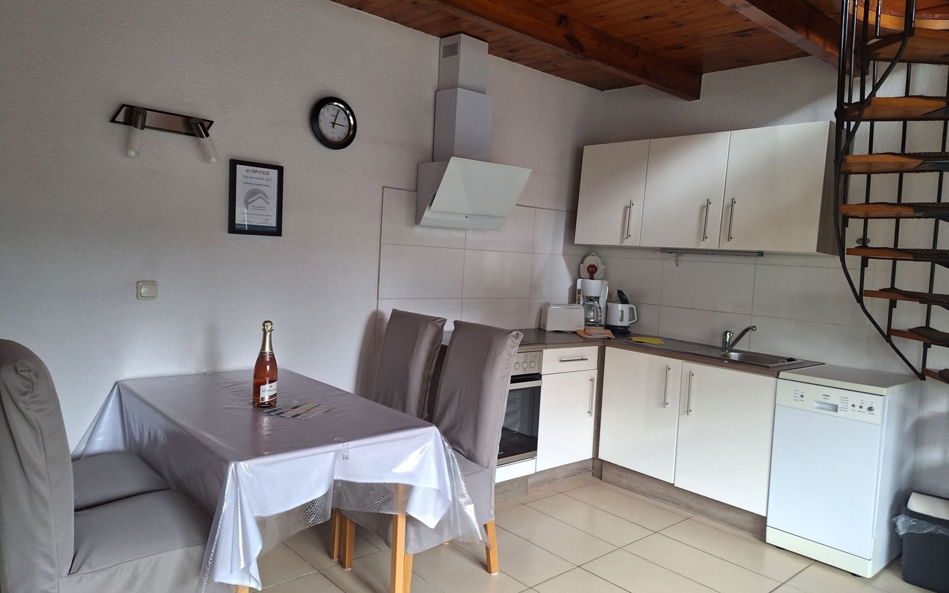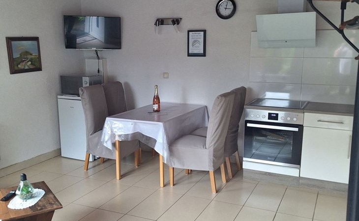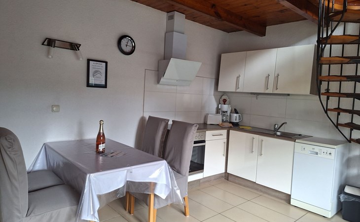 On the ground floor, a cosy living room with satellite TV invites you to spend relaxing hours. A fully equipped fitted kitchen with dishwasher and adjoining dining area allows you to enjoy meals together in a warm and inviting atmosphere. A modern bathroom with newly renovated fittings will make you feel right at home. A spiral staircase takes you to the first floor, where you will find two cosy bedrooms. The entire accommodation is heated by a new soapstone heating system and offers free Wi-Fi to make your stay as comfortable as possible.