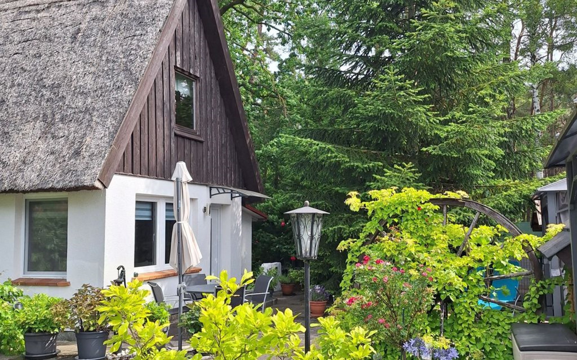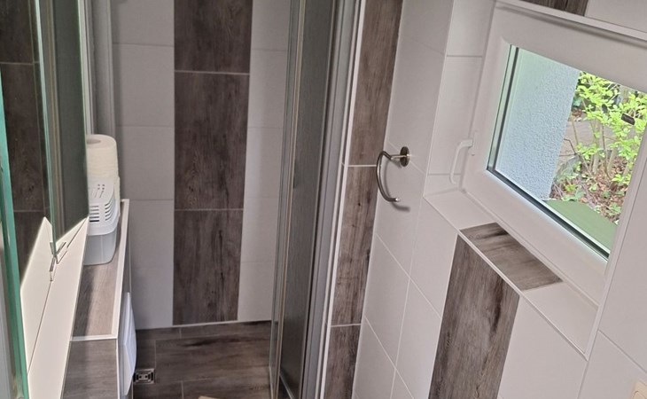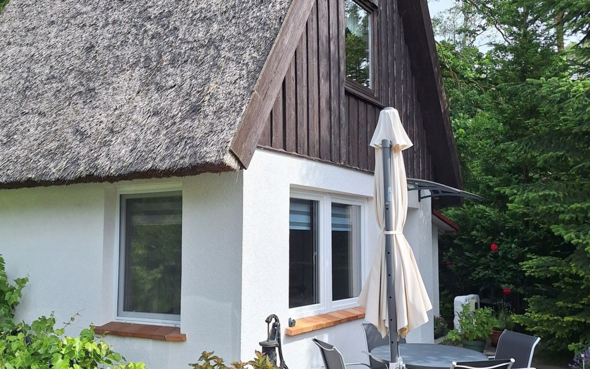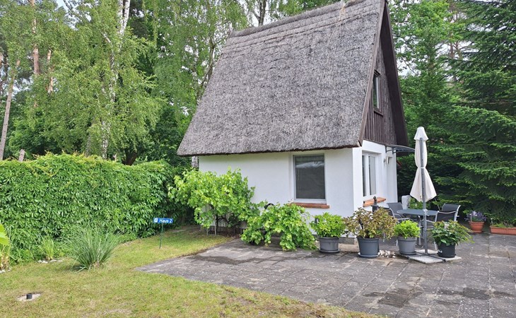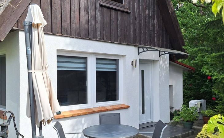 The holiday home is located on a spacious 1000m² plot right on the edge of the forest, where peace and relaxation are paramount. A large, covered terrace and a separate sun terrace are at your exclusive disposal. Both terraces are furnished and promise private hours in the open air. Barbecue fans have the option of using an electric barbecue. You can park your car right next to the holiday home.