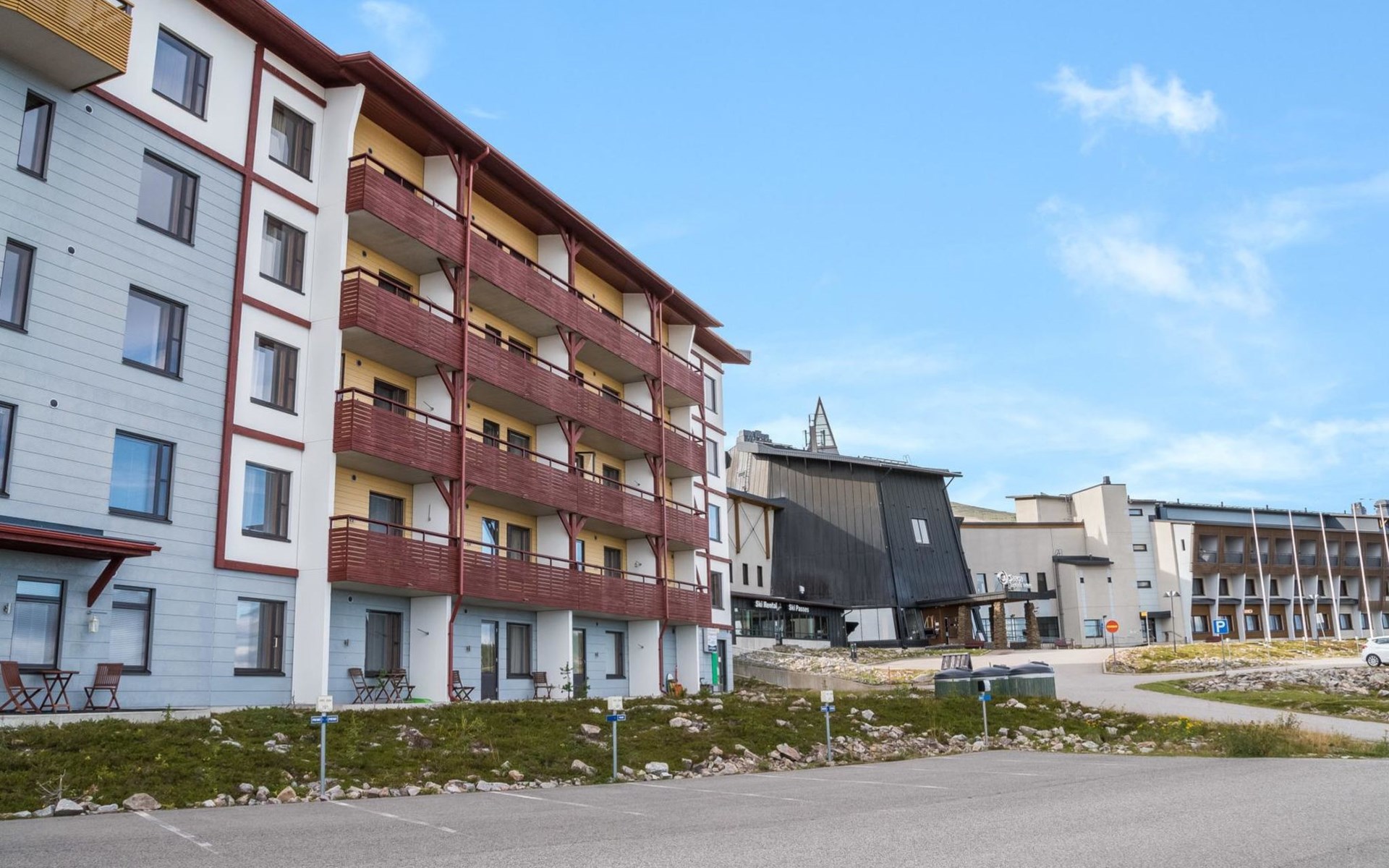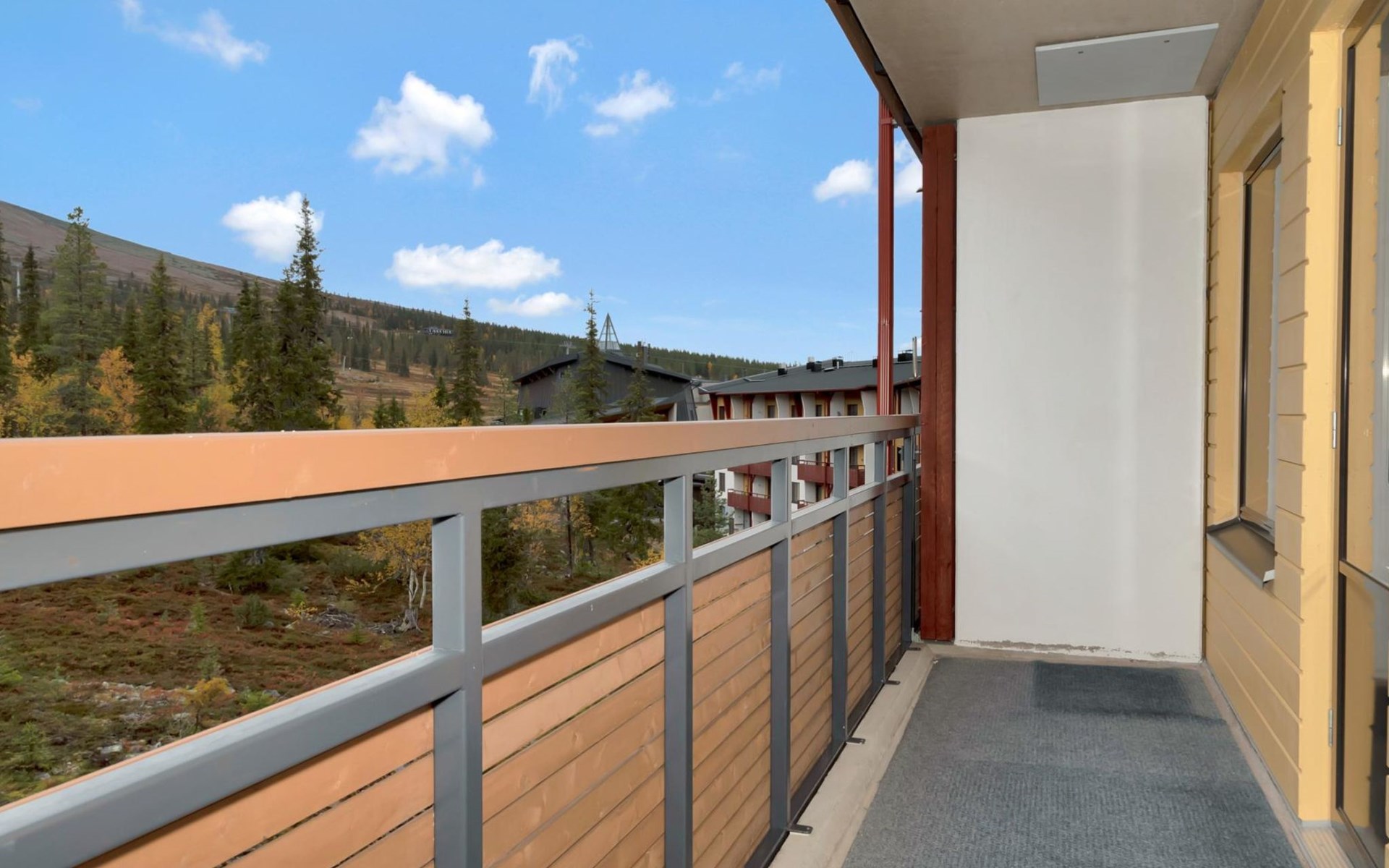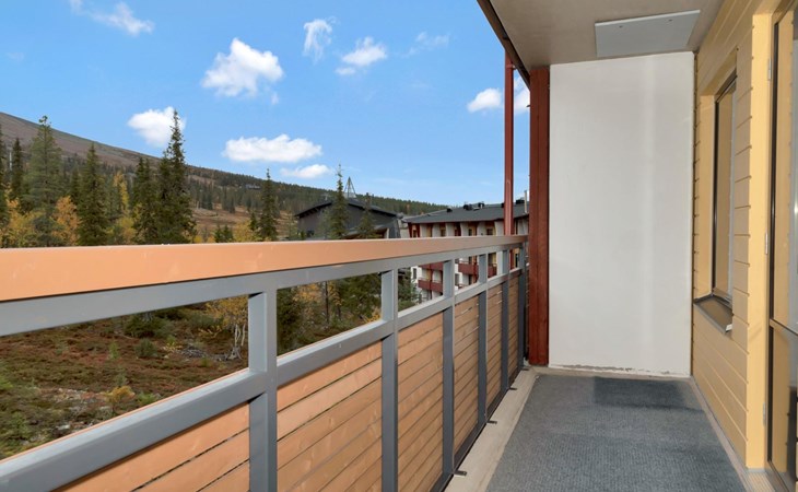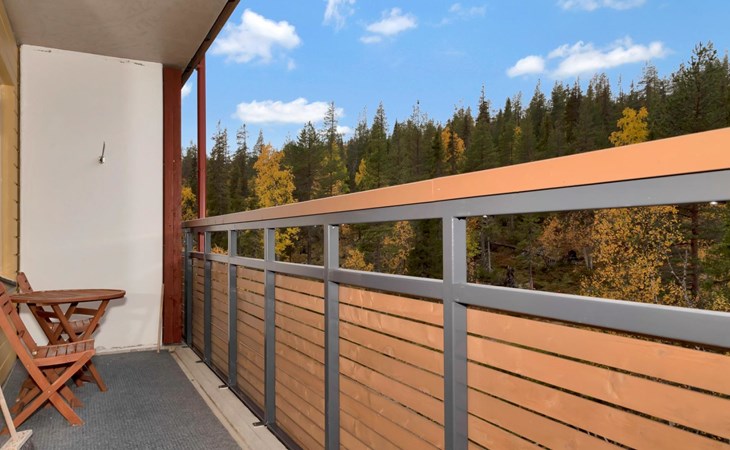 View of Ylläs fell, ski maintenance space, lockable ski storage.