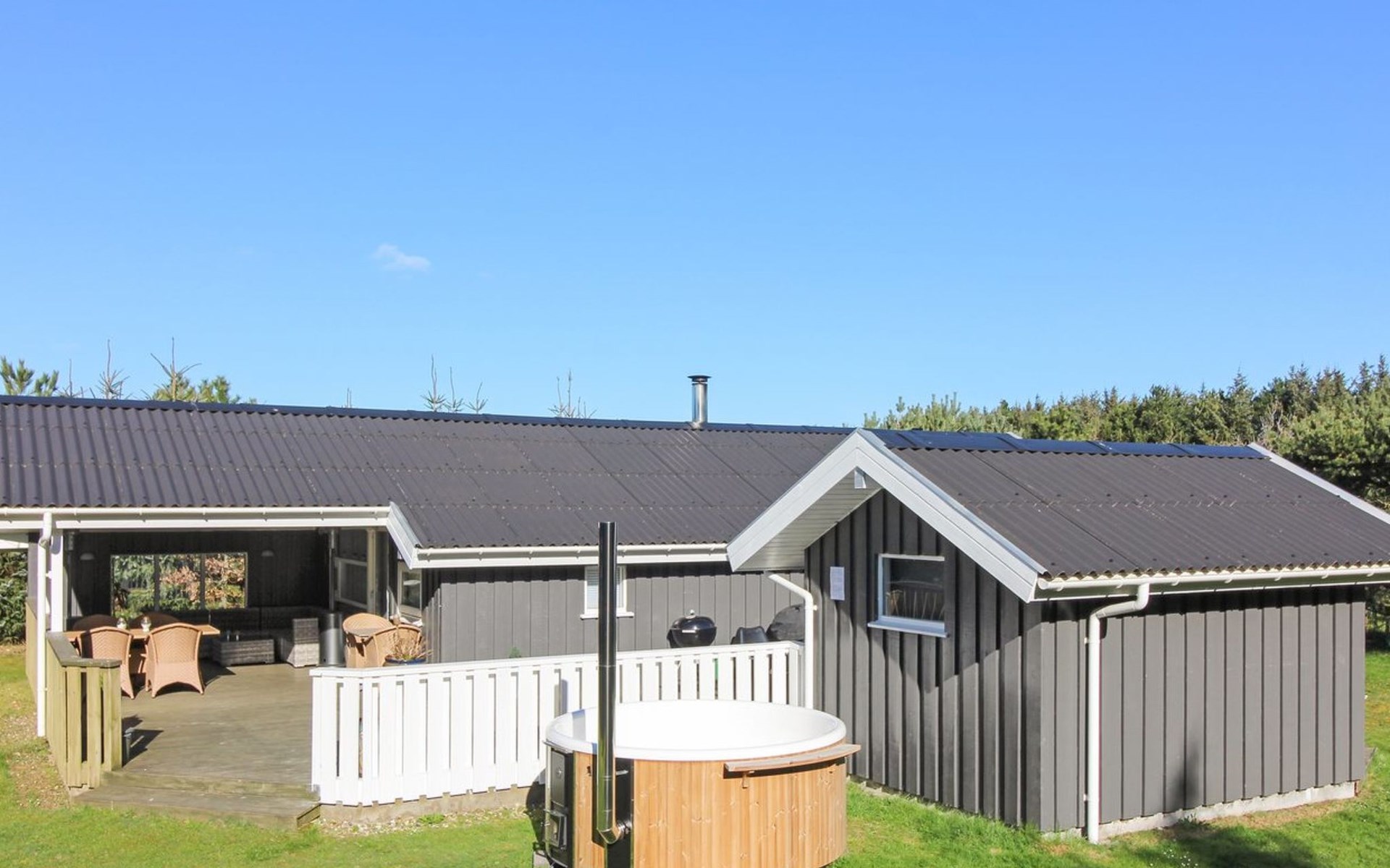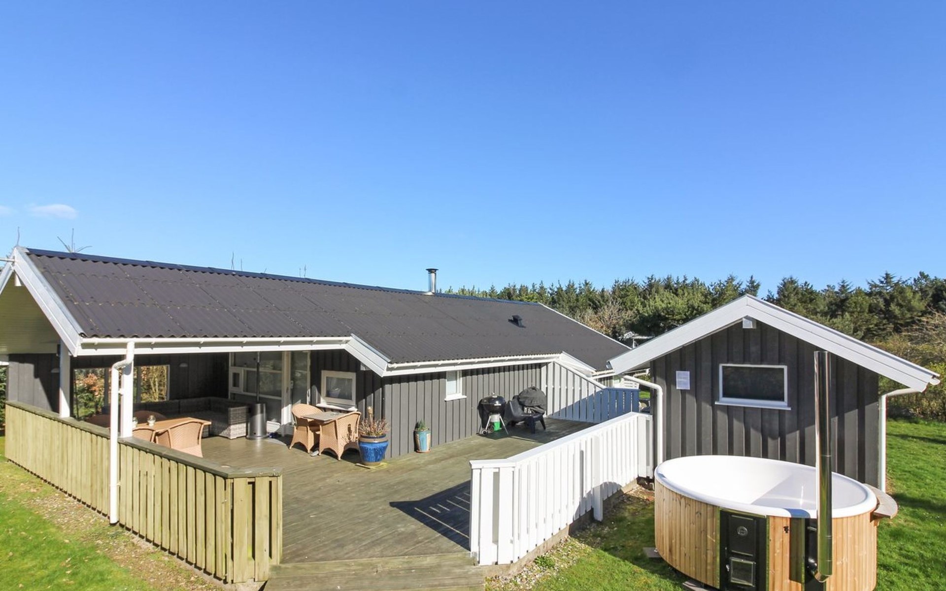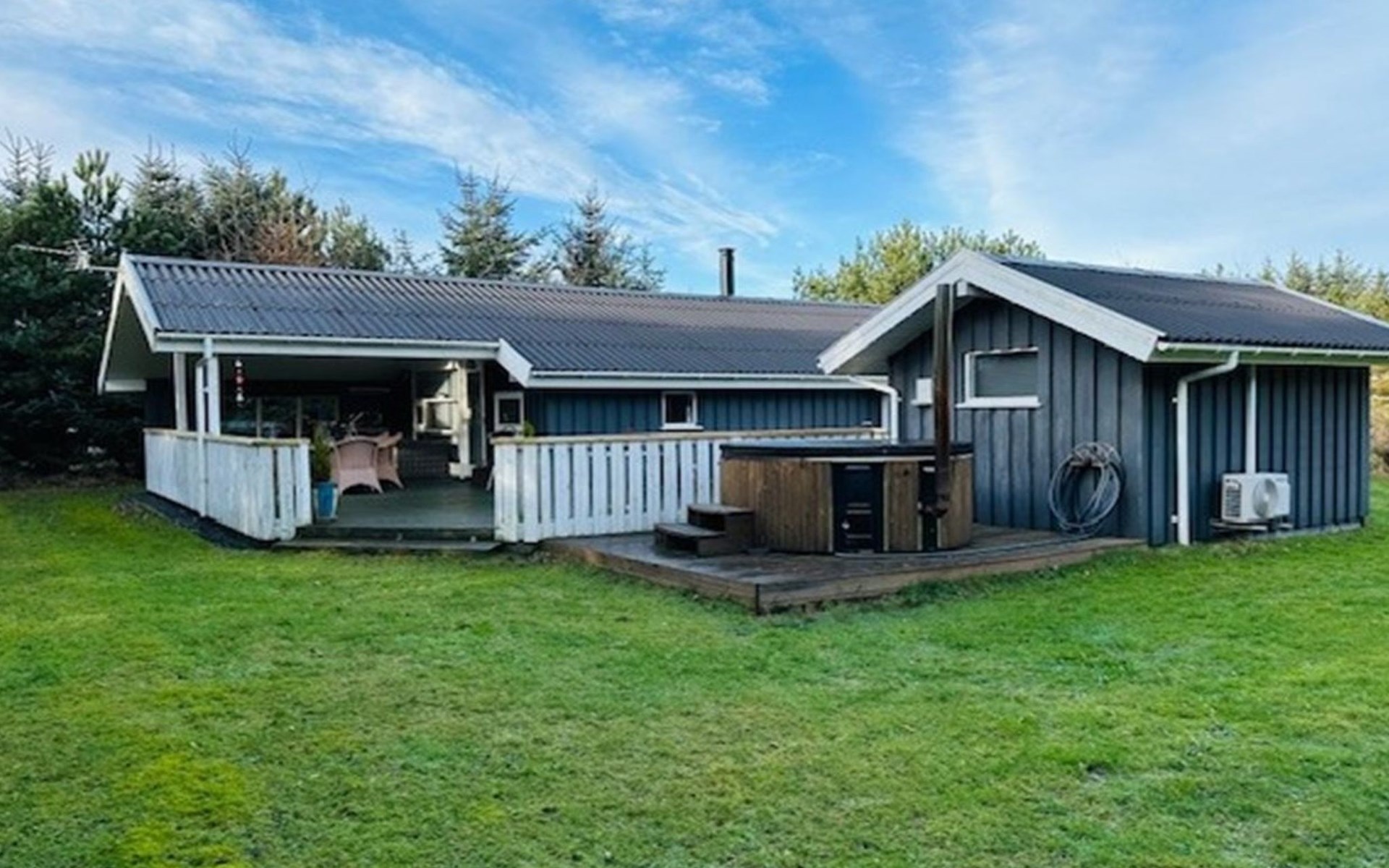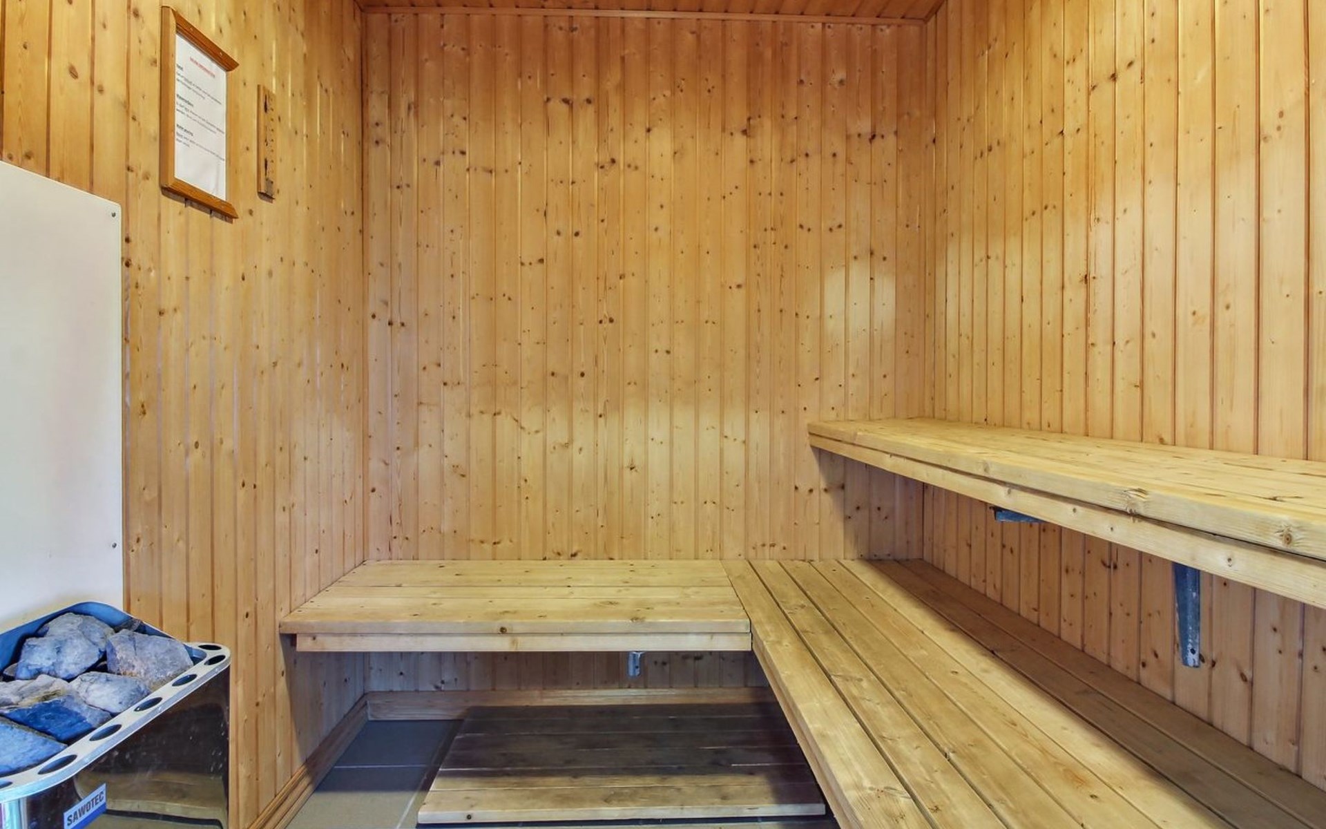 Single-family house, built in 1988. 1.3 km from the sea. For shared use: indoor pool (5 x 9 m, 45 m2, depth 132 - 132 cm). Private: natural state property 1'260 m2. Terrace (40 m2). In the house: washing machine, tumble dryer. Parking at the house. Grocery 500 m. The owner does not accept any youth groups.