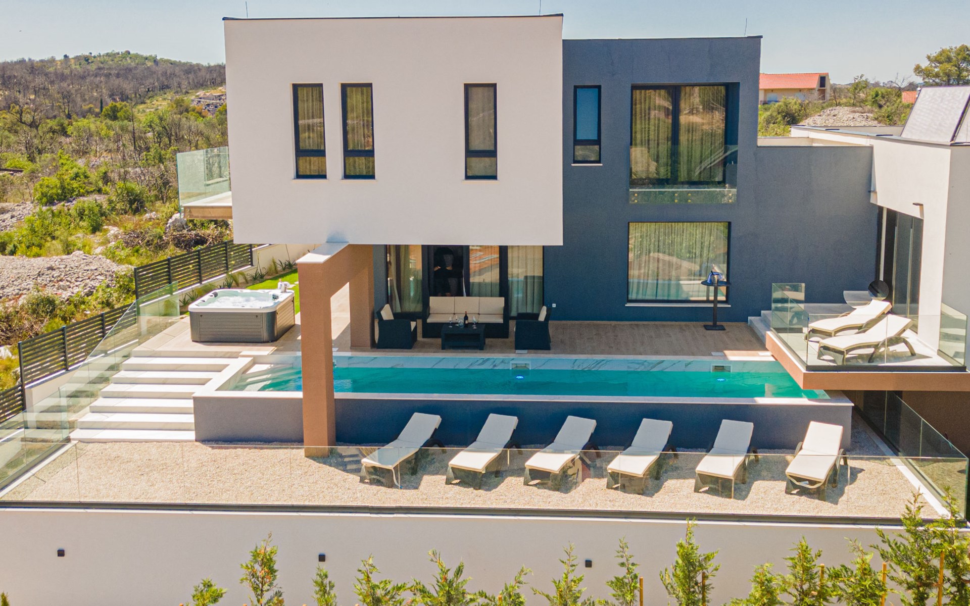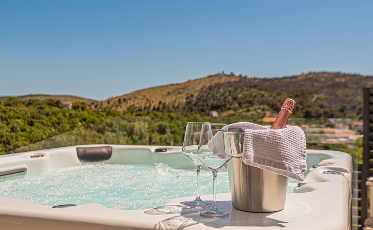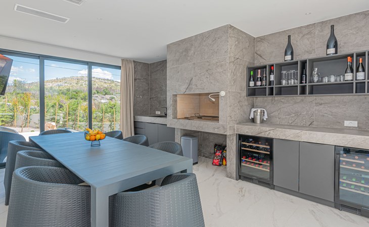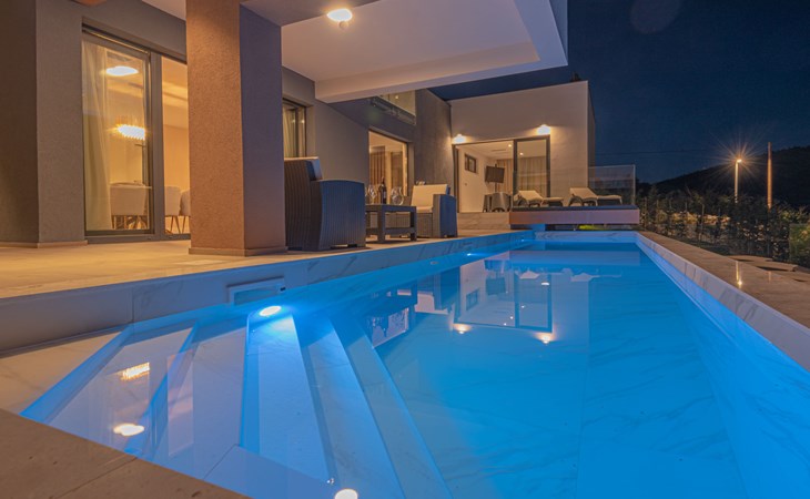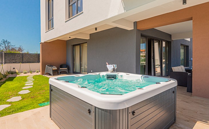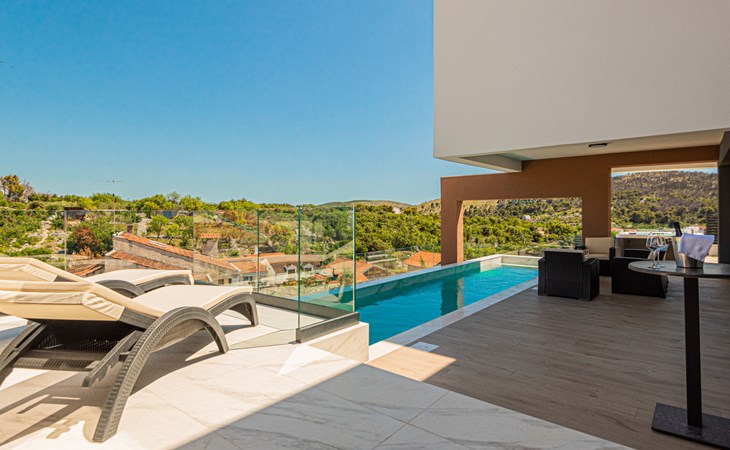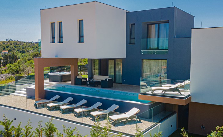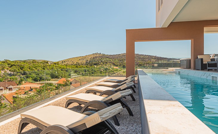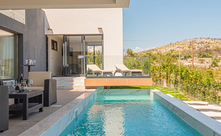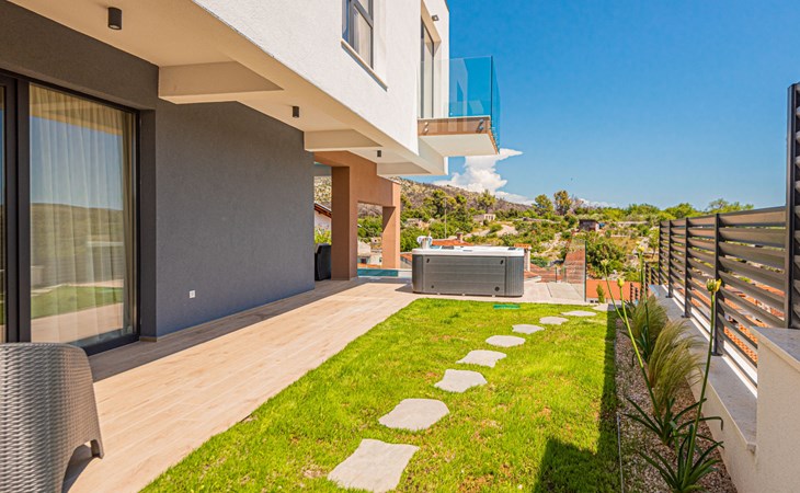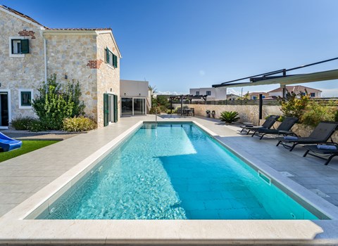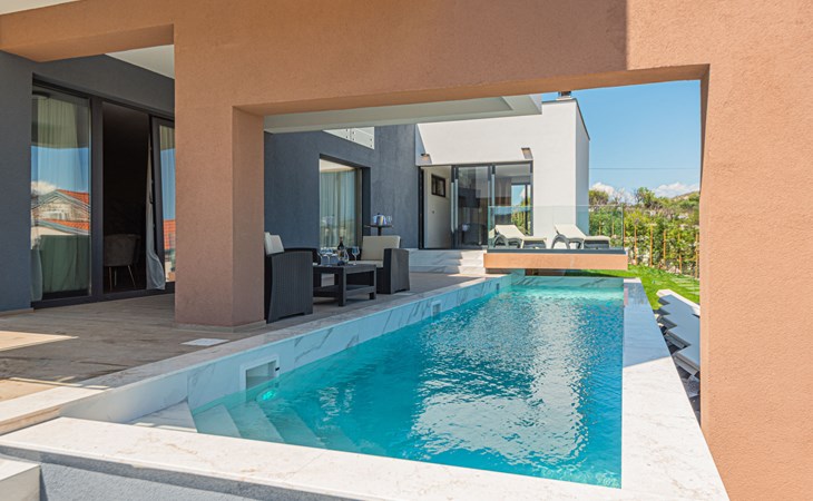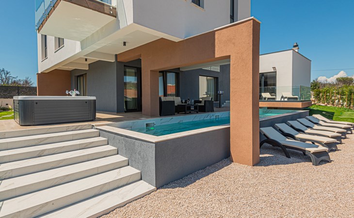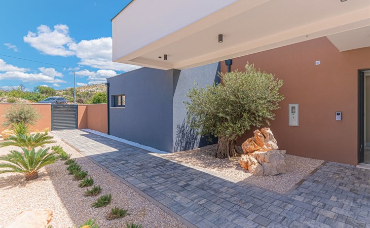 Luxurious villa "Šimun", built in 2024. In a quiet, sunny position, 500 m from the sea, 1.5 km from the beach. Private: property 850 m2 (fenced), swimming pool angular (13 x 3 m, depth 150 cm, seasonal availability: 15.May. - 01.Nov.) with internal staircase. Outdoor shower, hot tub, terrace (50 m2), garden furniture, barbecue. In the house: internet access, sauna, washing machine, tumble dryer. Parking (for 2 cars) at the house on the premises. Shop, restaurant, café 500 m, bus stop 350 m, pebble beach 2 km, concrete beach 1.5 km. Marina 2 km. Nearby attractions: Aquapark 15 km, NP Krka 20 km. The owner does not accept any youth groups.