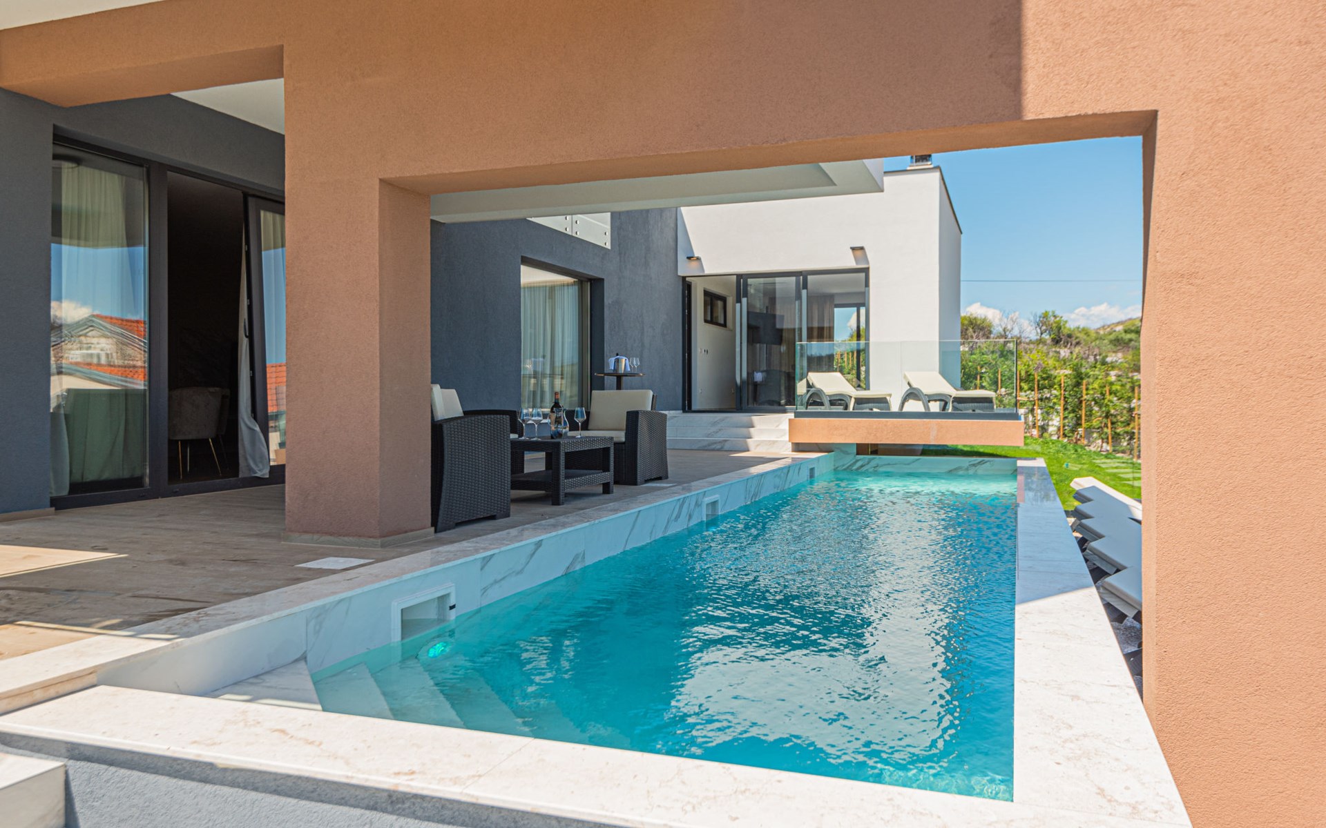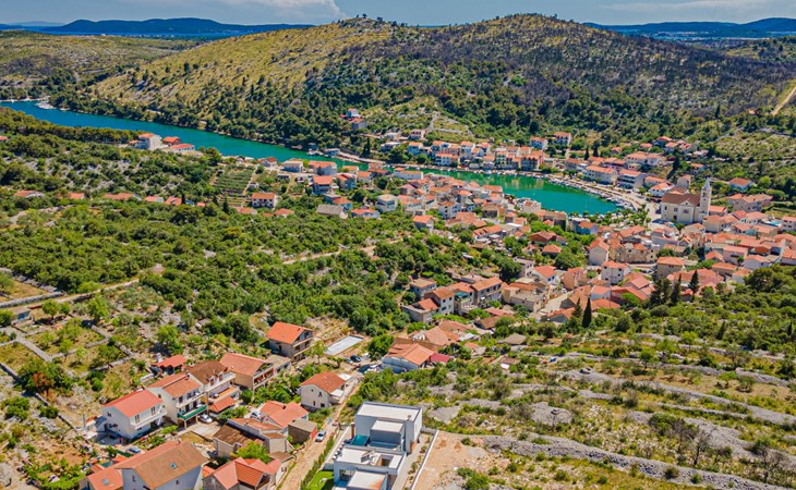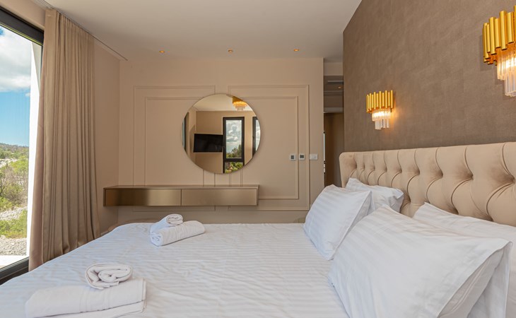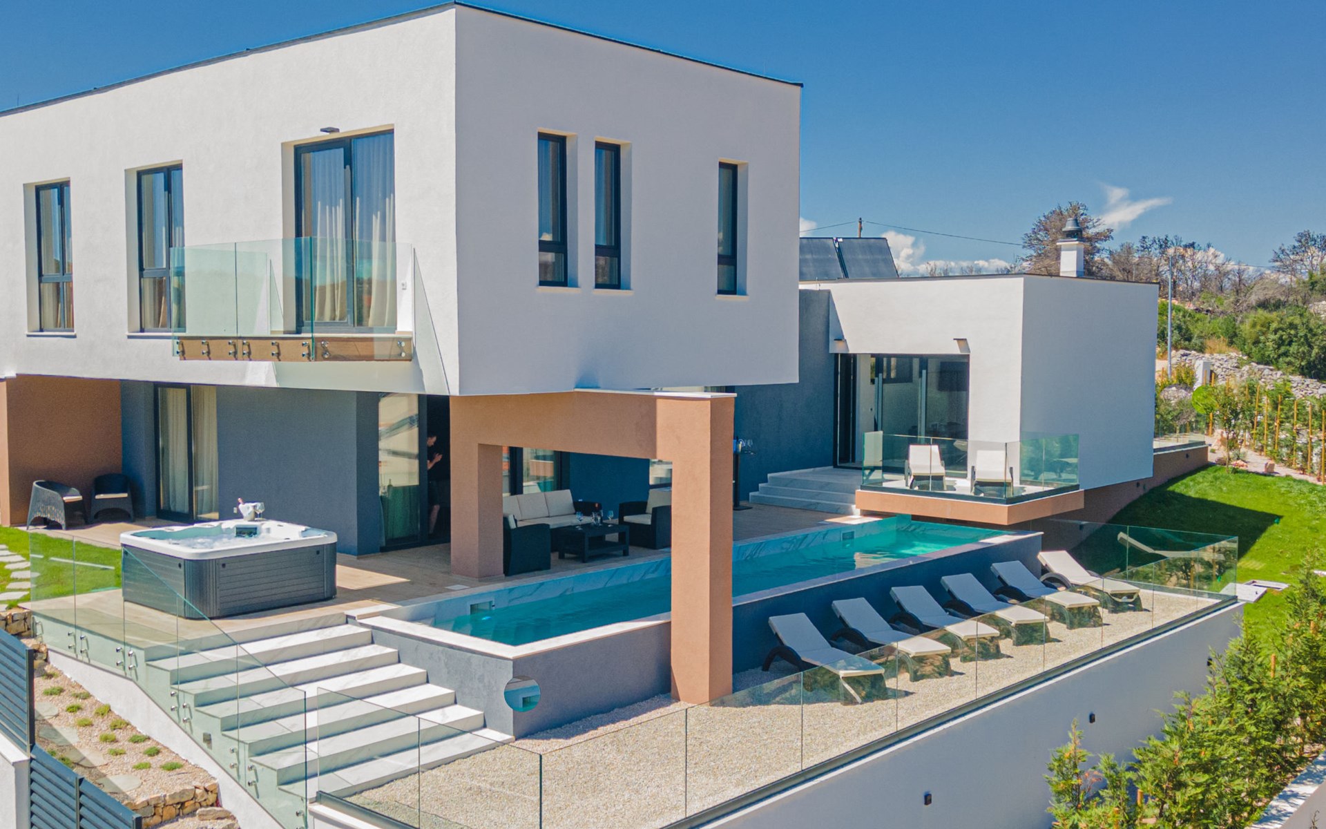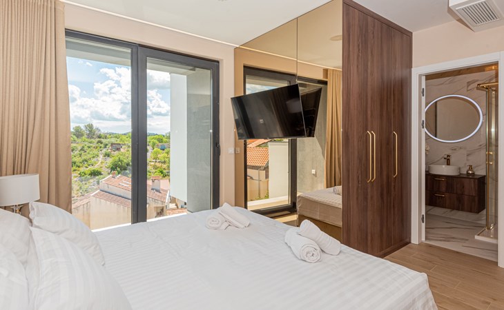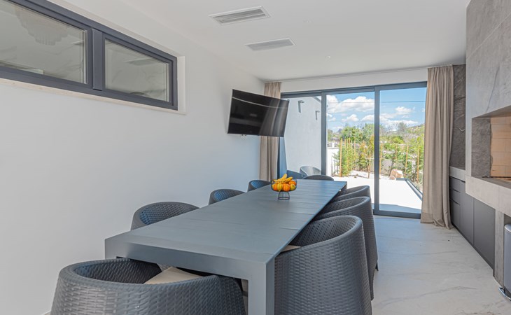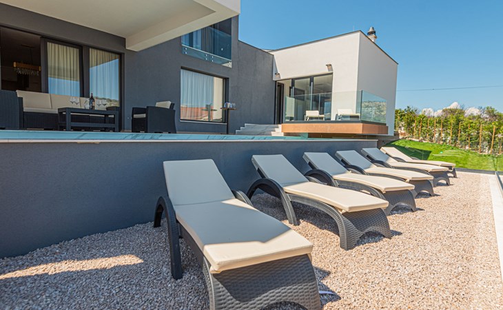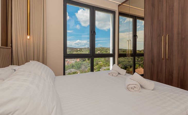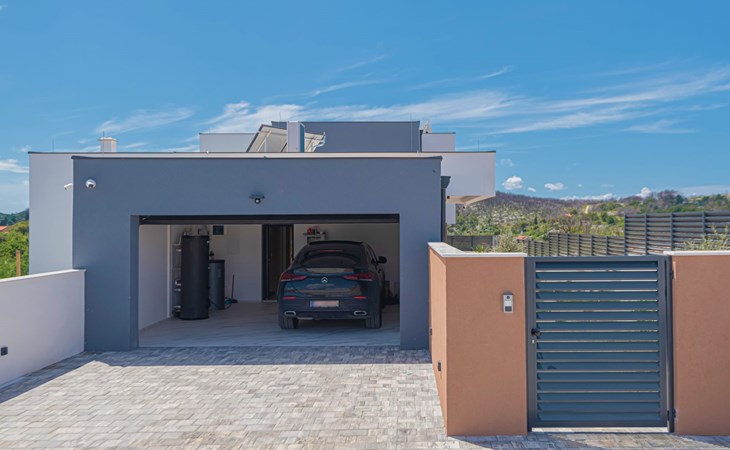 Luxurious villa "Šimun", built in 2024. In a quiet, sunny position, 500 m from the sea, 1.5 km from the beach. Private: property 850 m2 (fenced), swimming pool angular (13 x 3 m, depth 150 cm, seasonal availability: 15.May. - 01.Nov.) with internal staircase. Outdoor shower, hot tub, terrace (50 m2), garden furniture, barbecue. In the house: internet access, sauna, washing machine, tumble dryer. Parking (for 2 cars) at the house on the premises. Shop, restaurant, café 500 m, bus stop 350 m, pebble beach 2 km, concrete beach 1.5 km. Marina 2 km. Nearby attractions: Aquapark 15 km, NP Krka 20 km. The owner does not accept any youth groups.