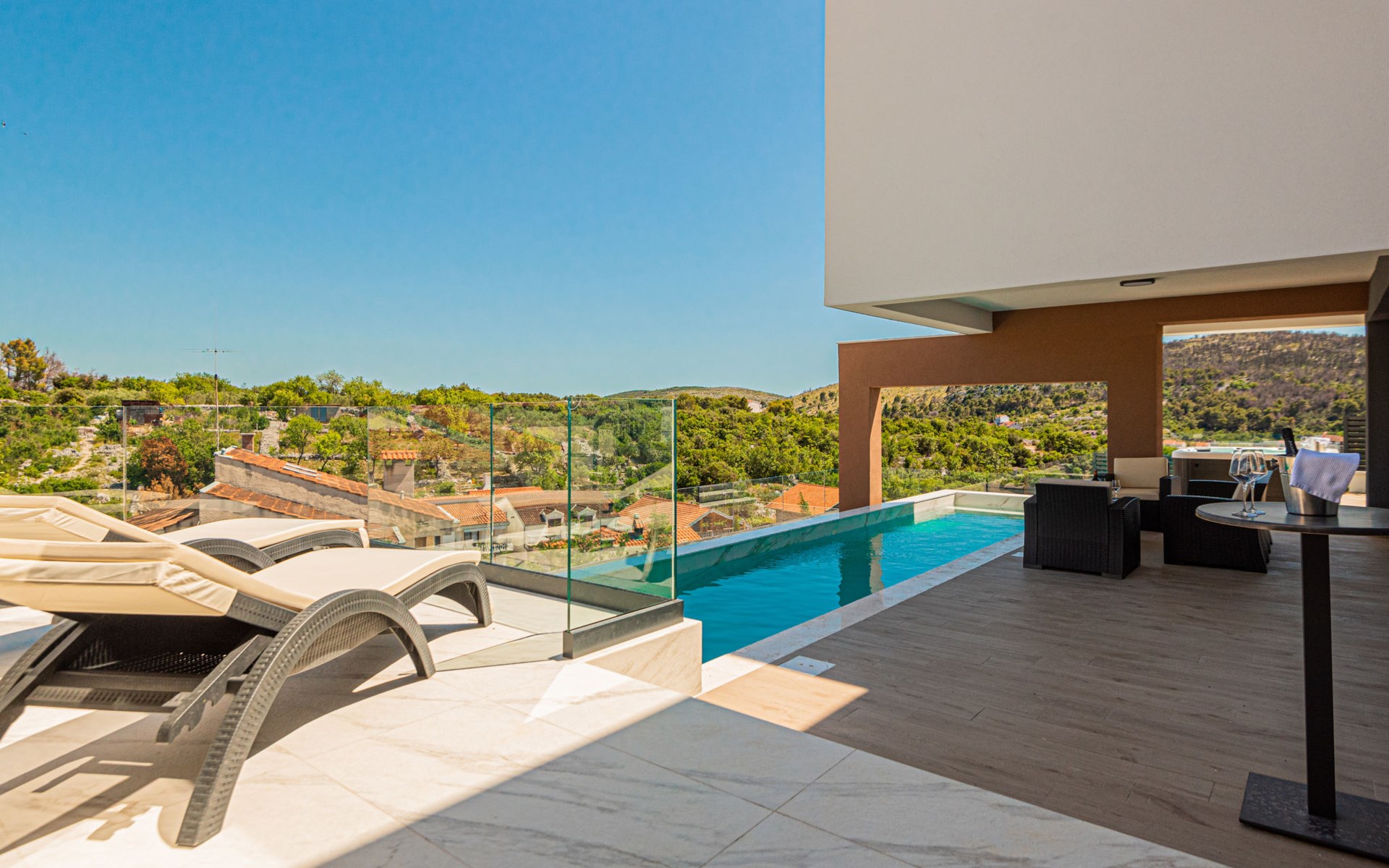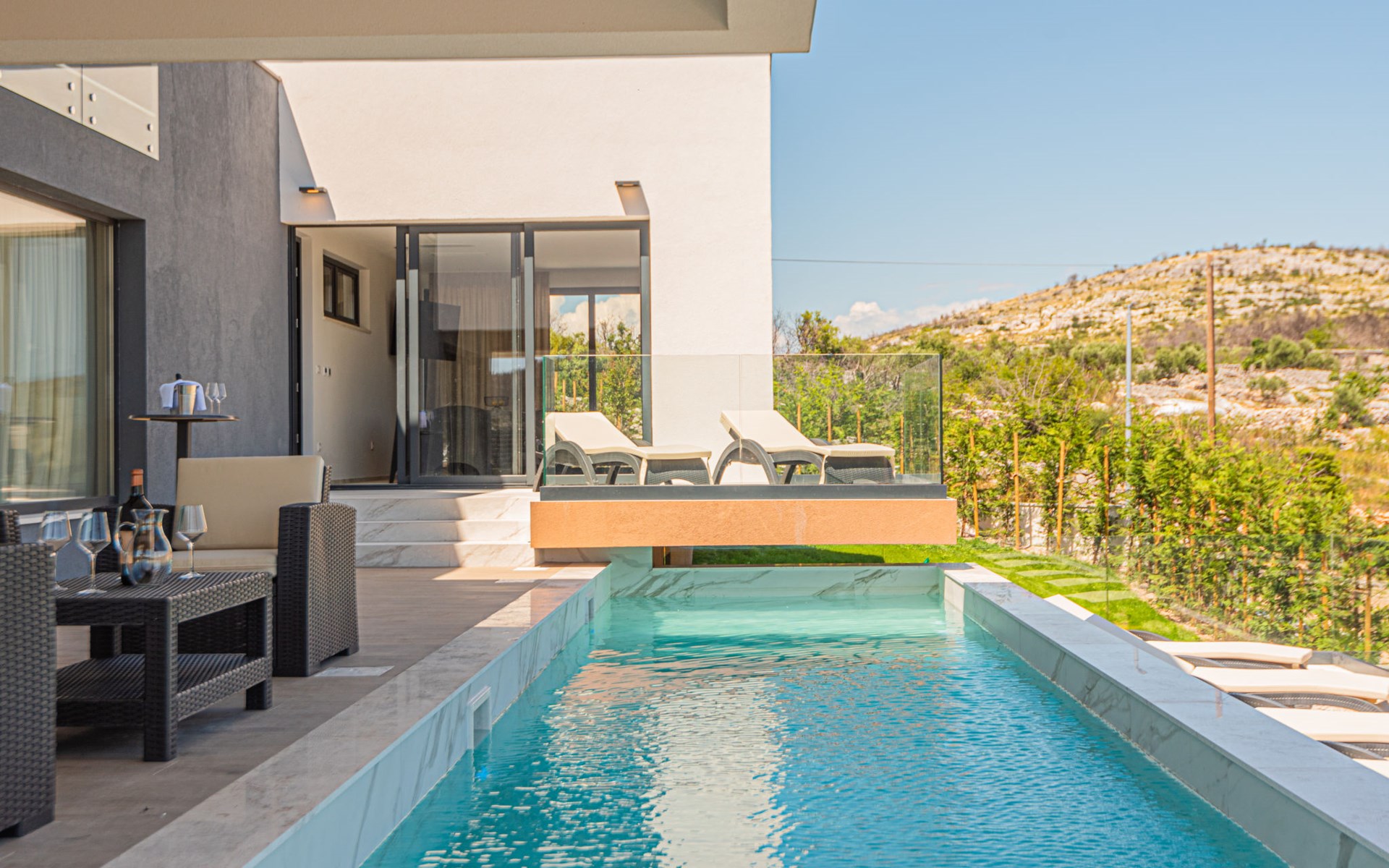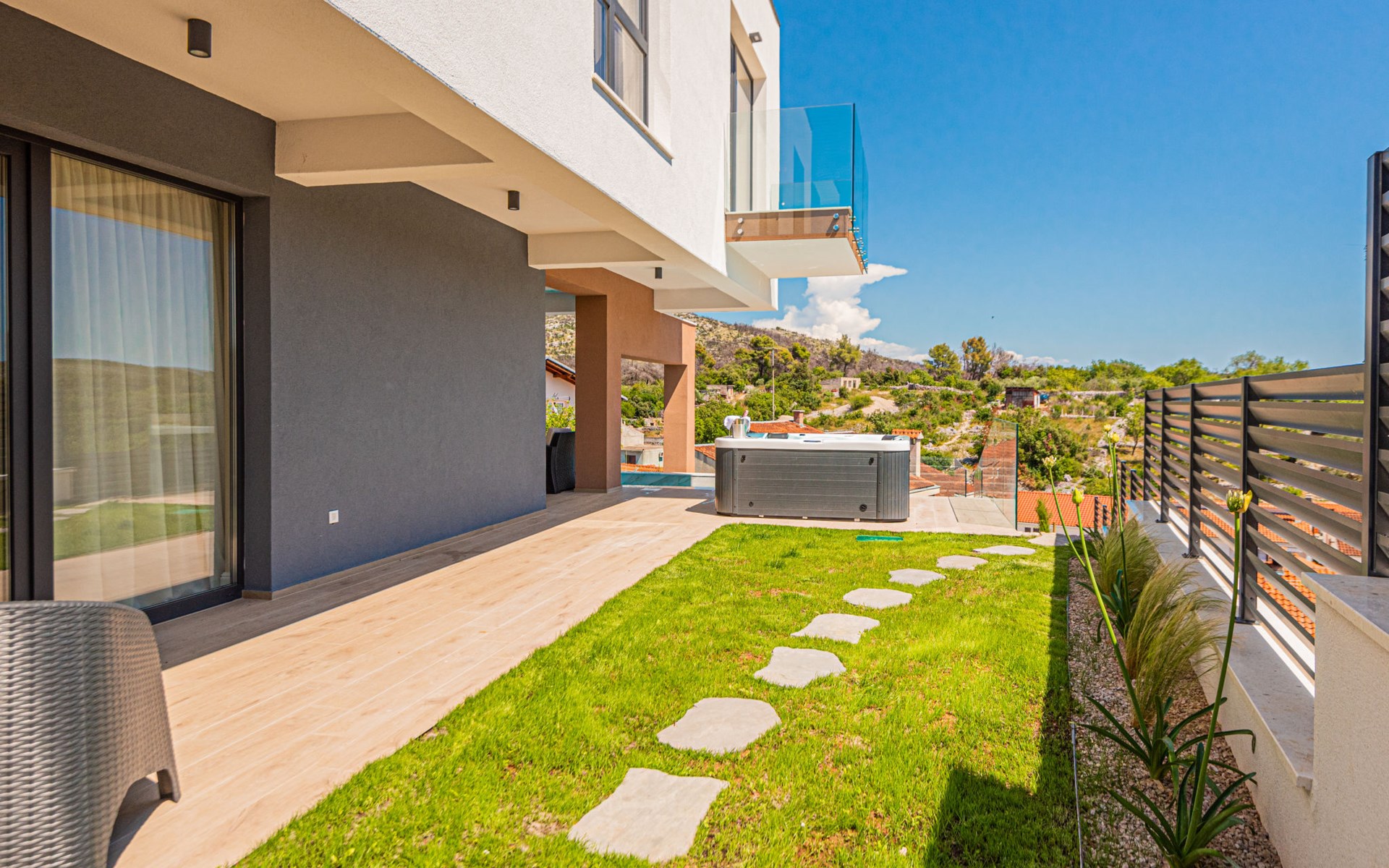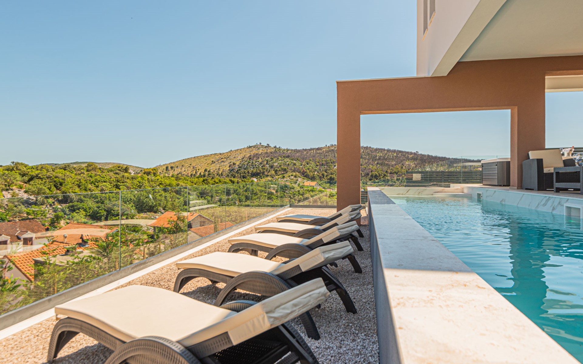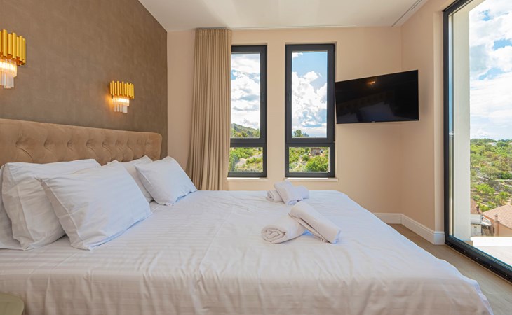 Luxurious villa "Šimun", built in 2024. In a quiet, sunny position, 500 m from the sea, 1.5 km from the beach. Private: property 850 m2 (fenced), swimming pool angular (13 x 3 m, depth 150 cm, seasonal availability: 15.May. - 01.Nov.) with internal staircase. Outdoor shower, hot tub, terrace (50 m2), garden furniture, barbecue. In the house: internet access, sauna, washing machine, tumble dryer. Parking (for 2 cars) at the house on the premises. Shop, restaurant, café 500 m, bus stop 350 m, pebble beach 2 km, concrete beach 1.5 km. Marina 2 km. Nearby attractions: Aquapark 15 km, NP Krka 20 km. The owner does not accept any youth groups.