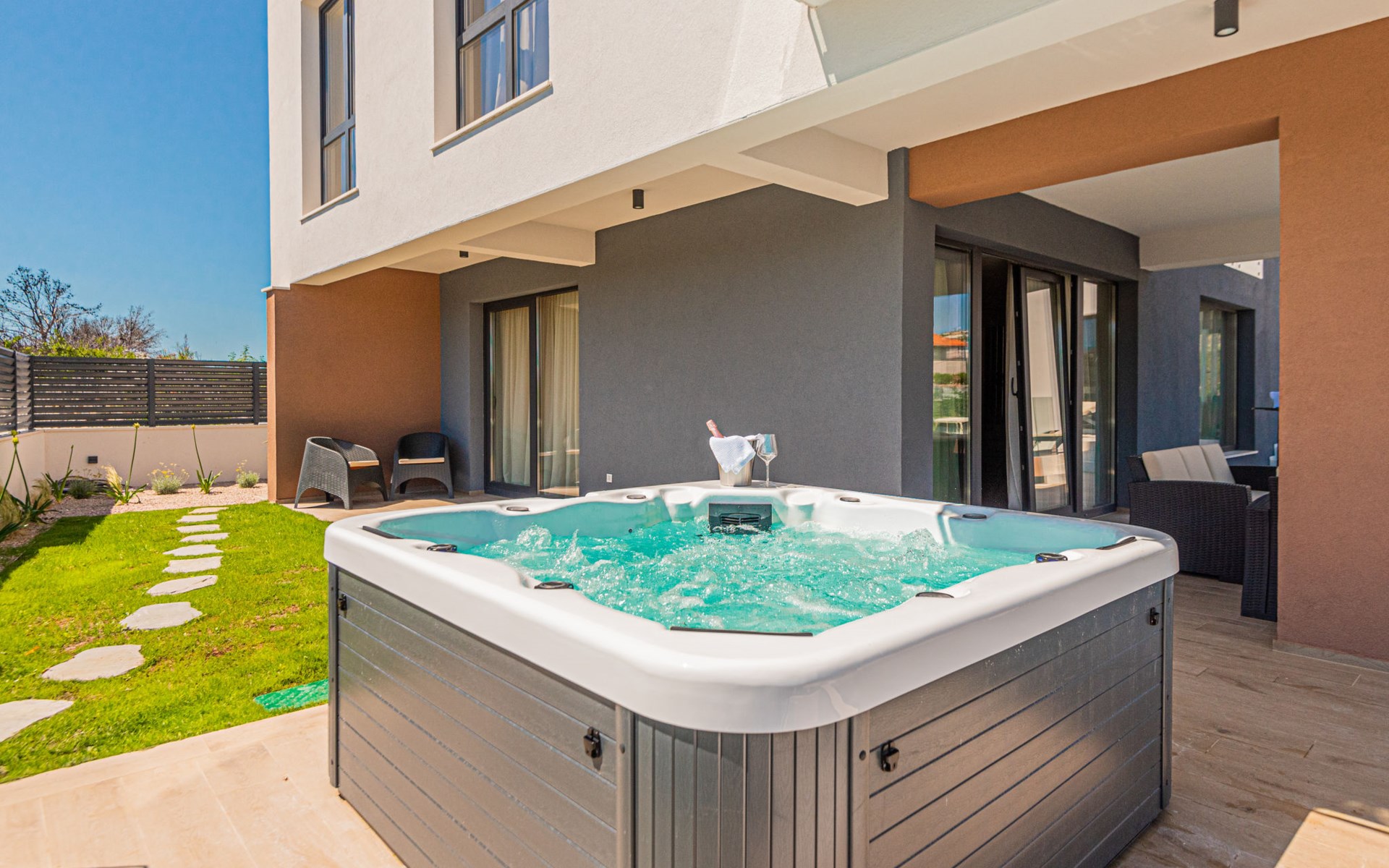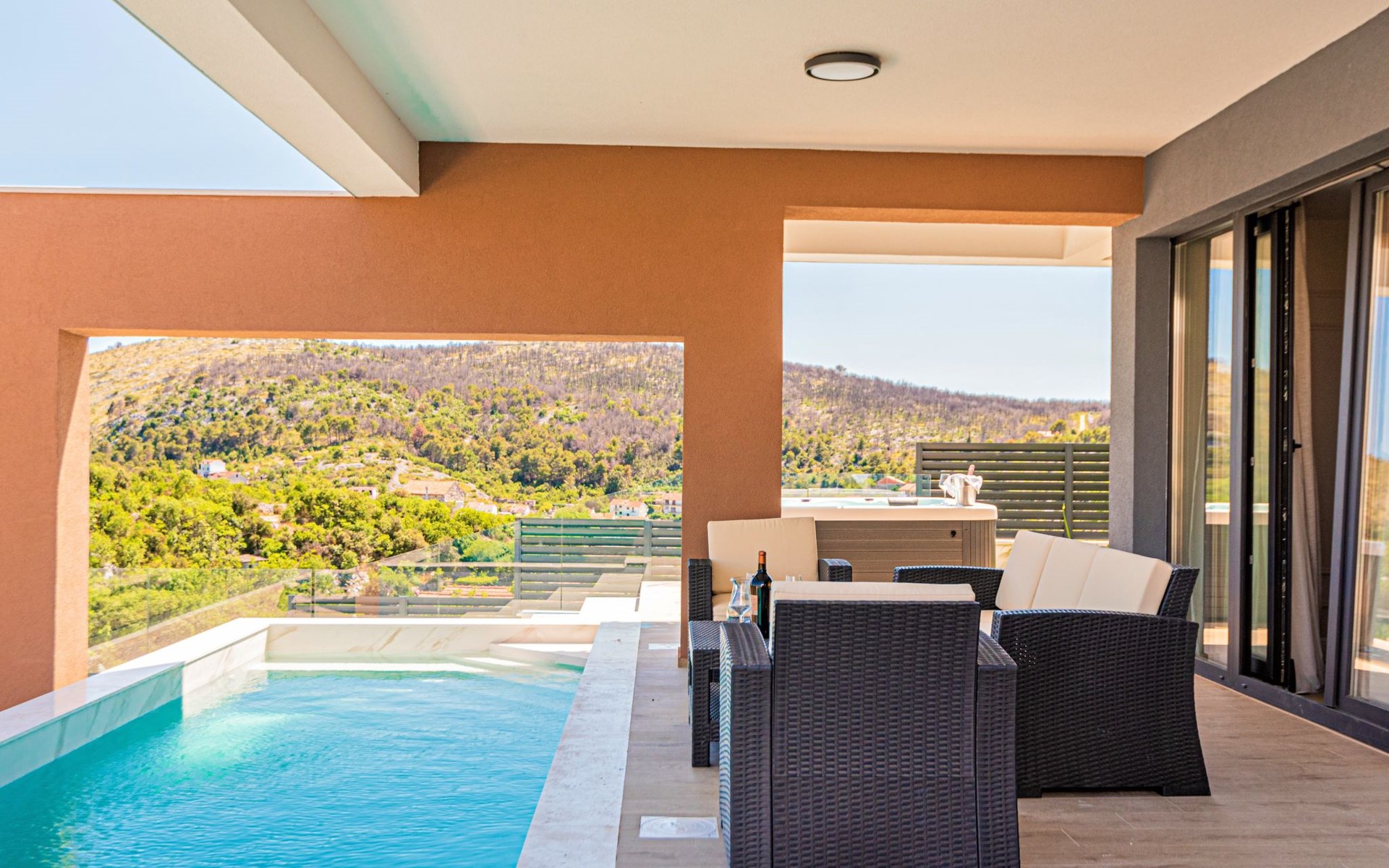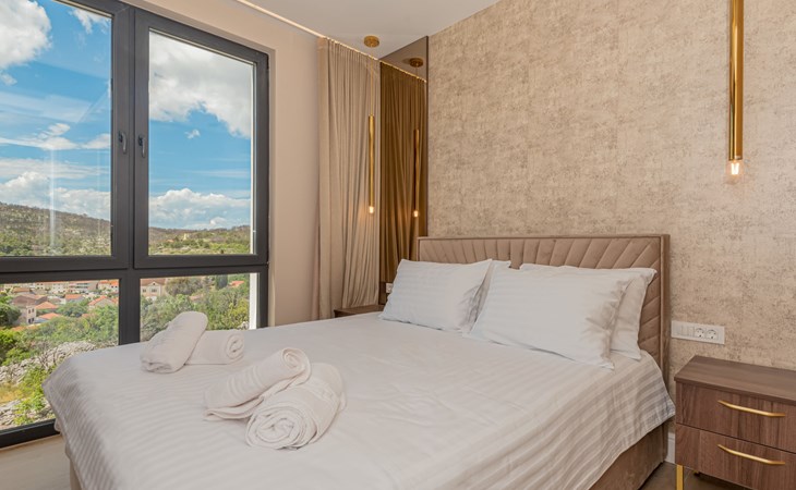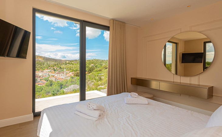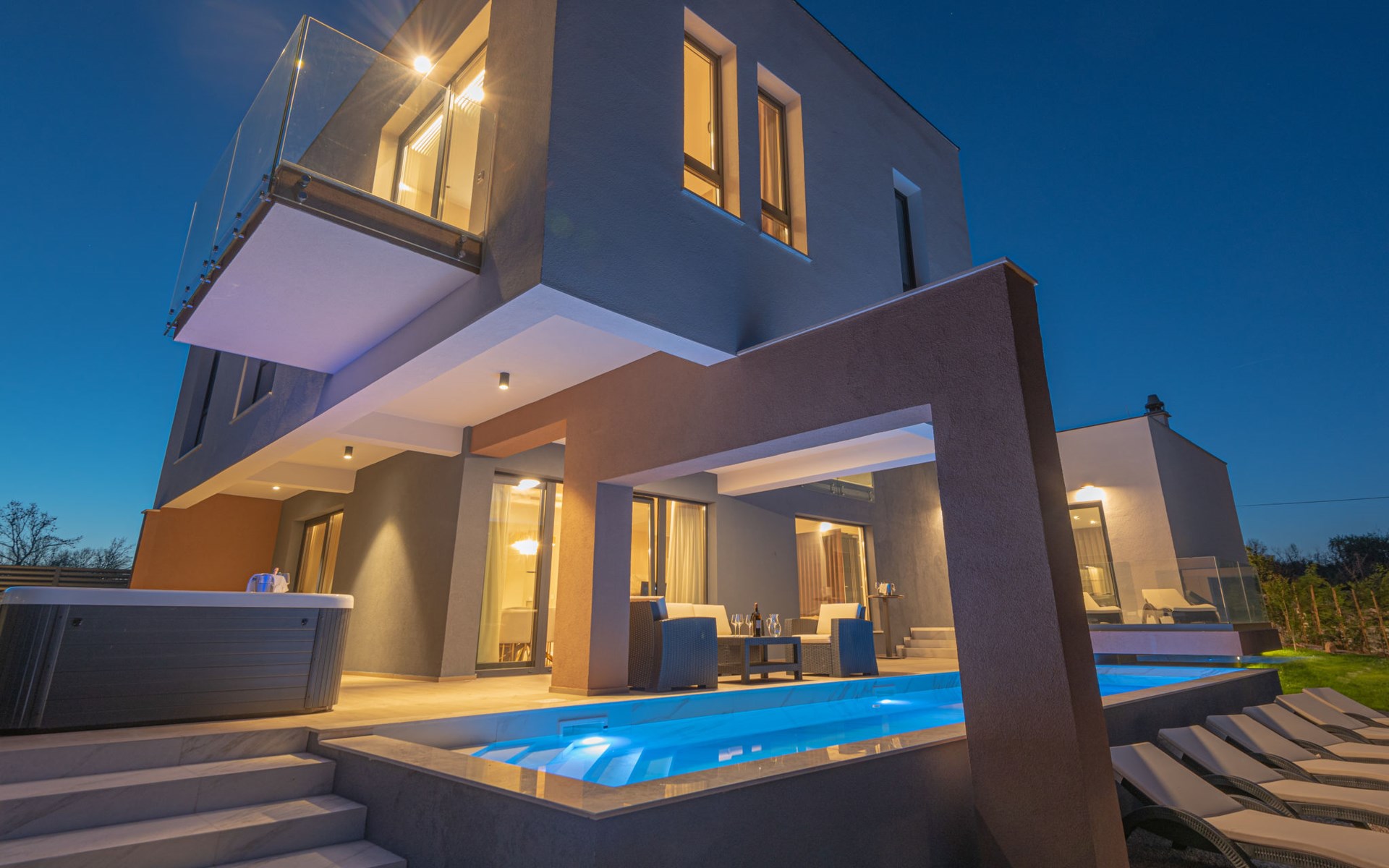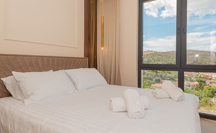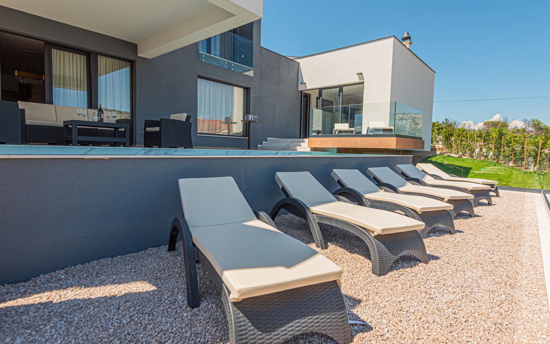 Luxurious villa "Šimun", built in 2024. In a quiet, sunny position, 500 m from the sea, 1.5 km from the beach. Private: property 850 m2 (fenced), swimming pool angular (13 x 3 m, depth 150 cm, seasonal availability: 15.May. - 01.Nov.) with internal staircase. Outdoor shower, hot tub, terrace (50 m2), garden furniture, barbecue. In the house: internet access, sauna, washing machine, tumble dryer. Parking (for 2 cars) at the house on the premises. Shop, restaurant, café 500 m, bus stop 350 m, pebble beach 2 km, concrete beach 1.5 km. Marina 2 km. Nearby attractions: Aquapark 15 km, NP Krka 20 km. The owner does not accept any youth groups.