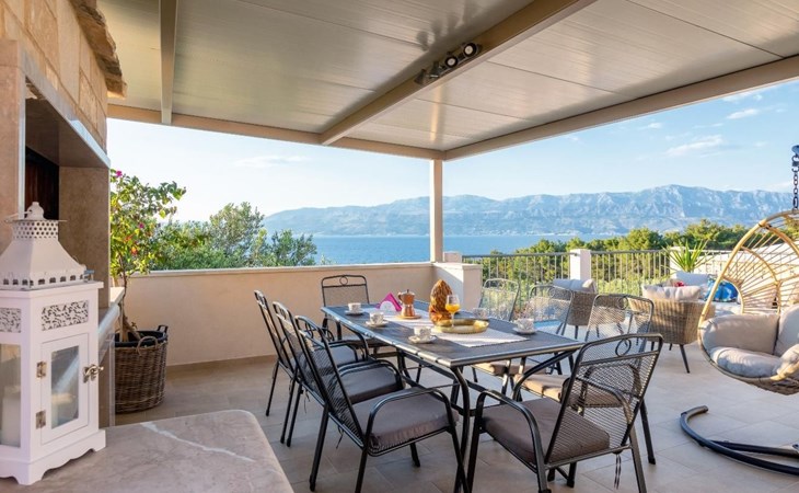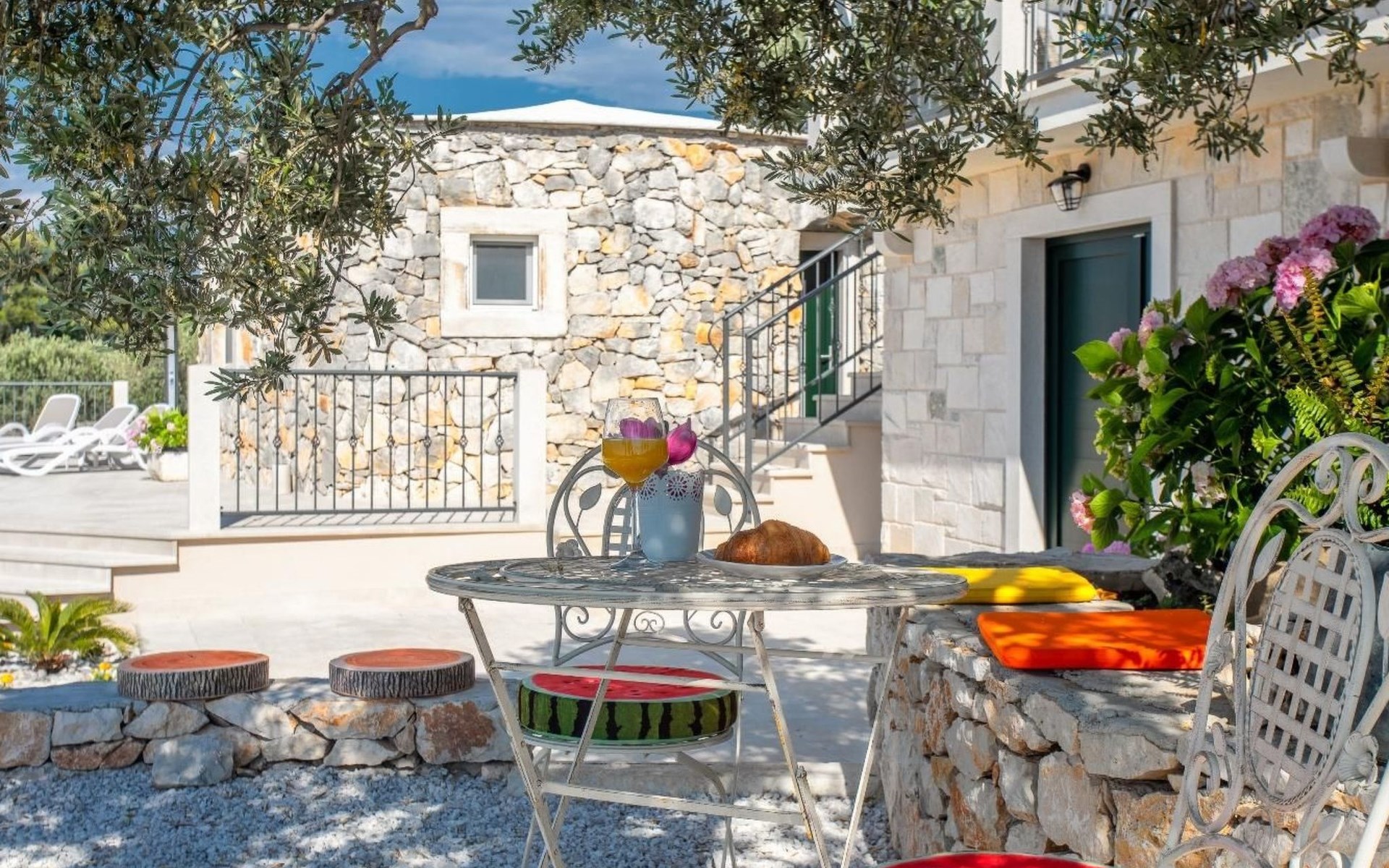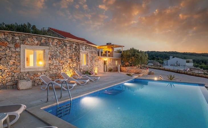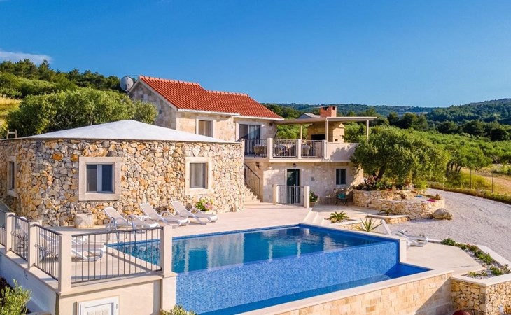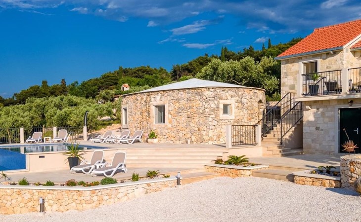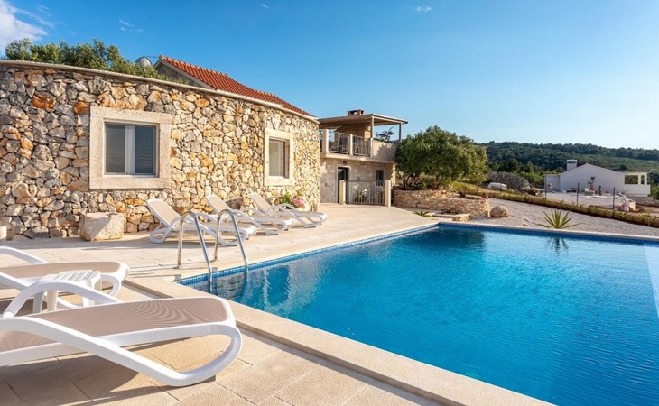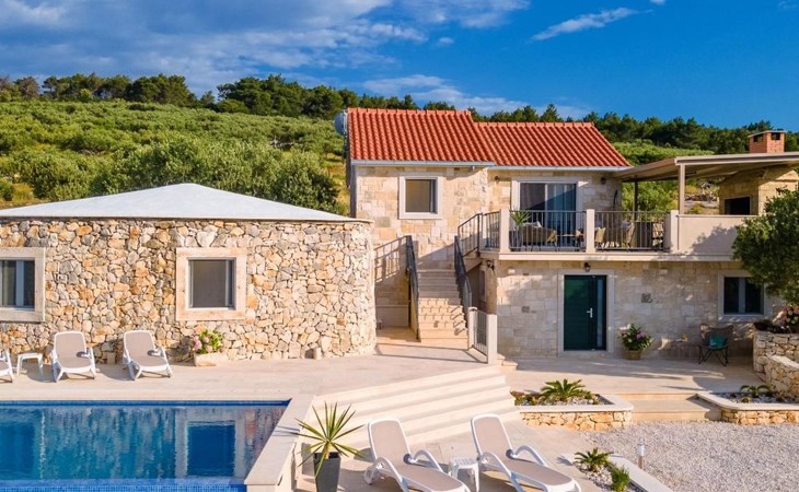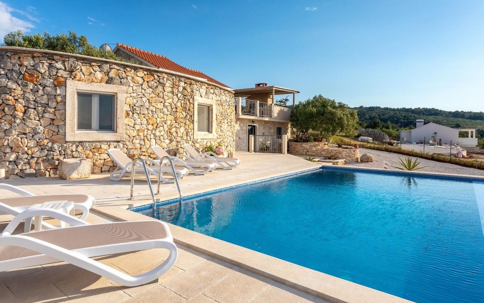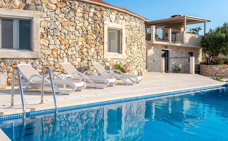 The outside area is not only filled with so many things, but also beautiful to look at. The entire villa is finished with stone cladding, which is very typical for the island of Brač, which is famous for its natural stone production. A pool is waiting for you if you don't feel like a beach holiday. There is no great pool without loungers and parasols, and there is even an outdoor shower here.