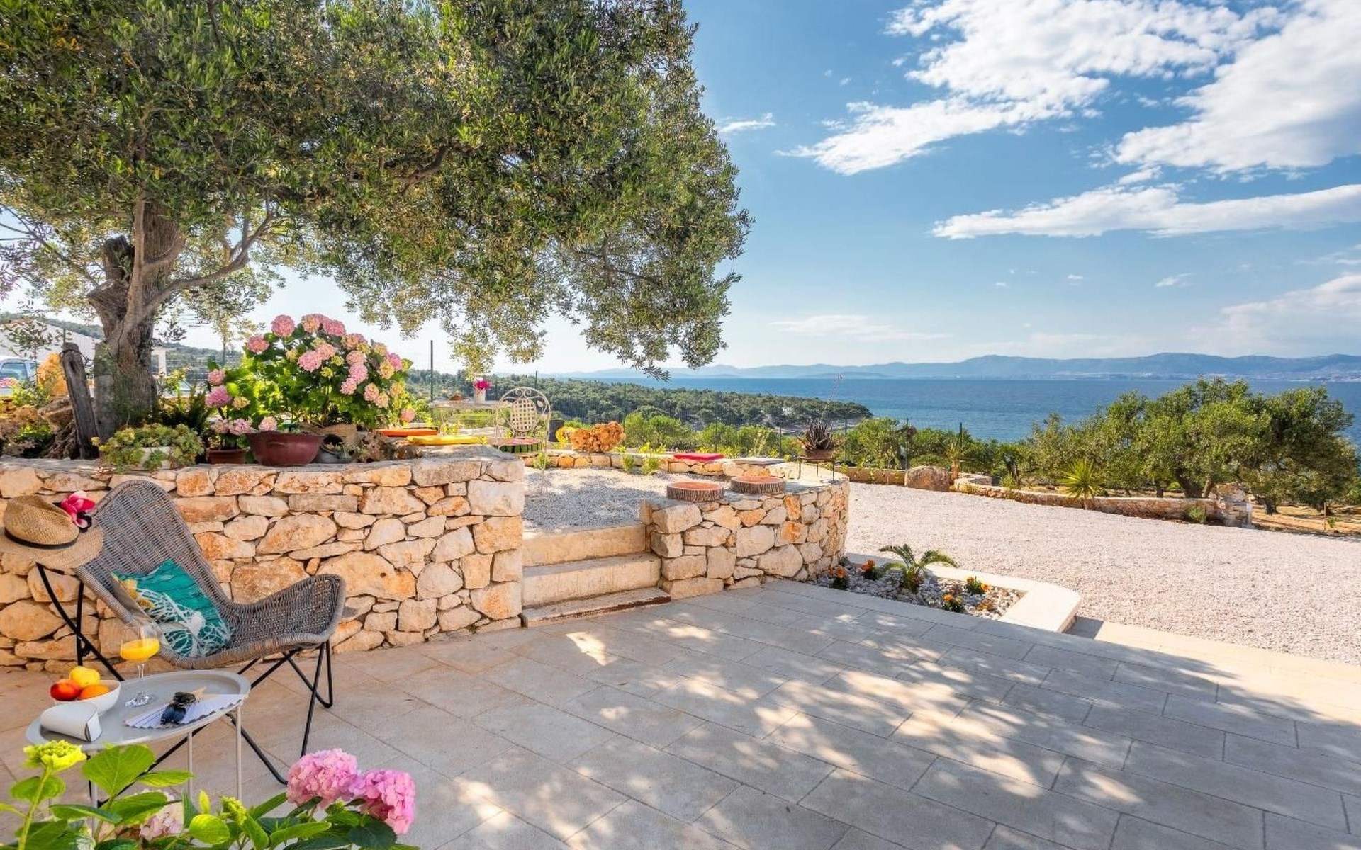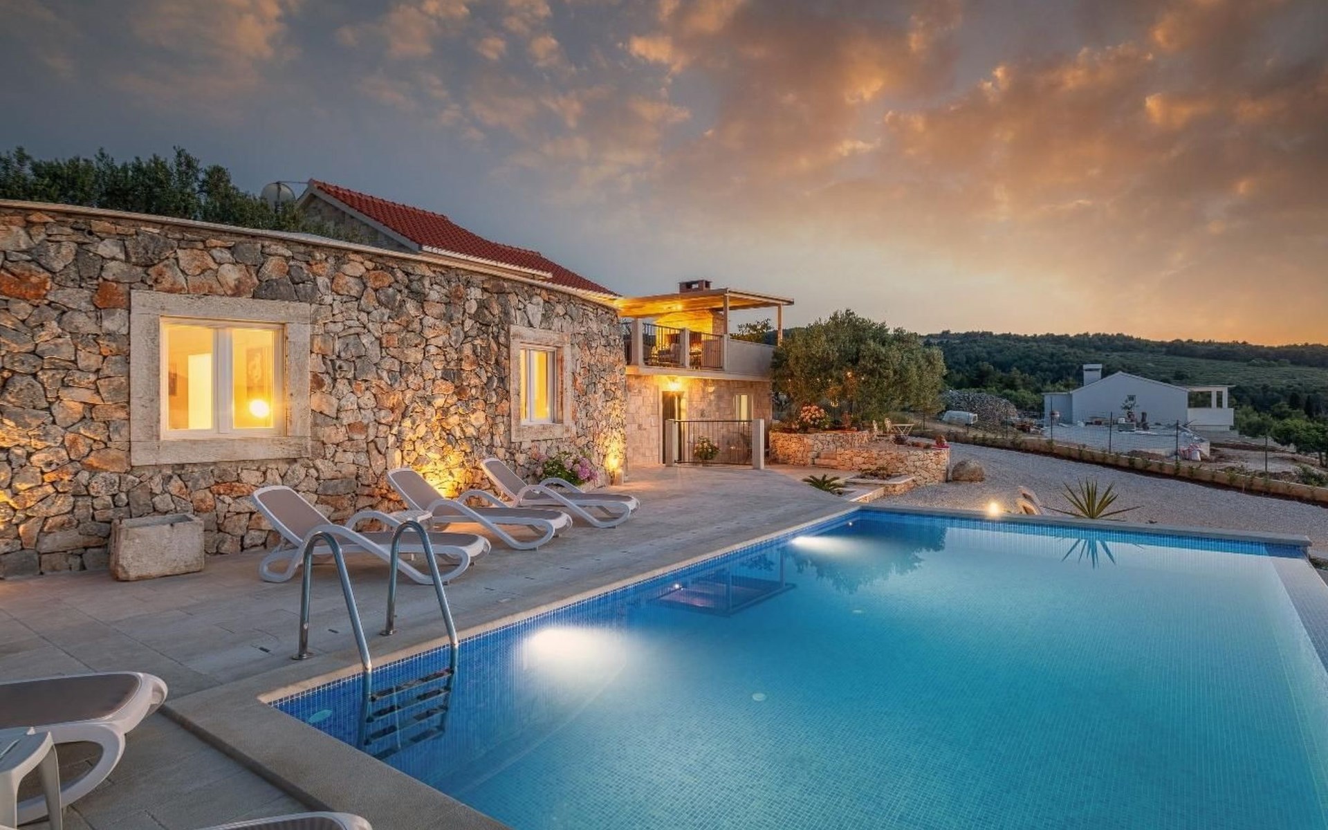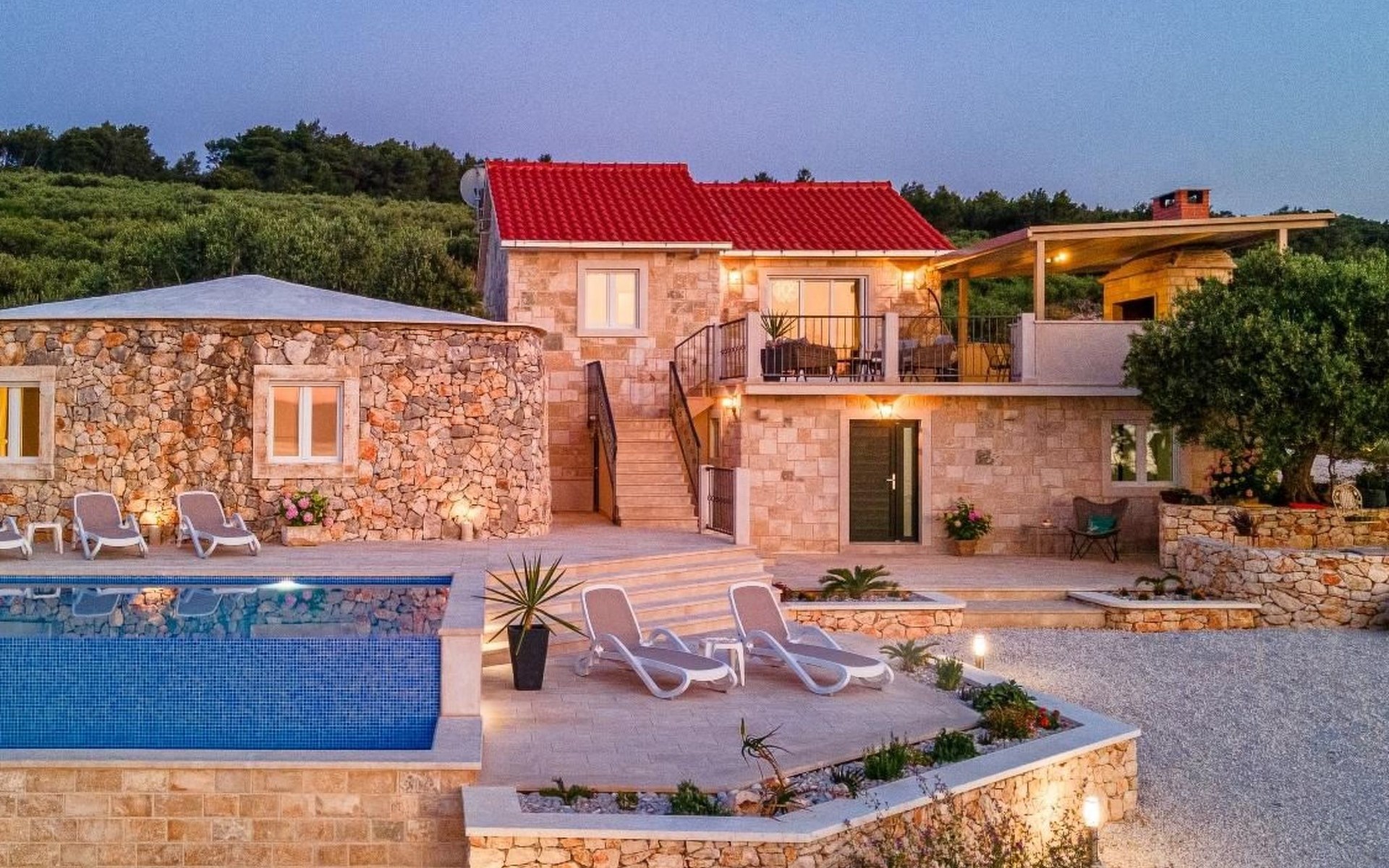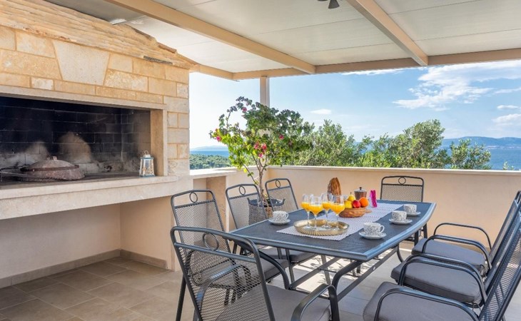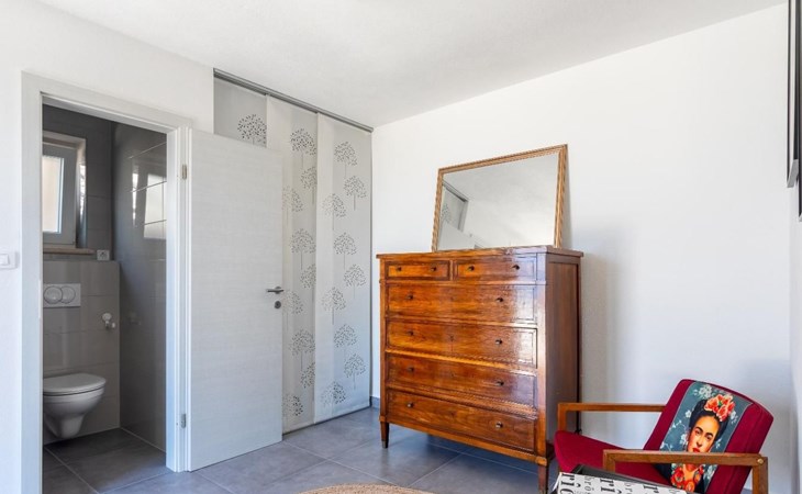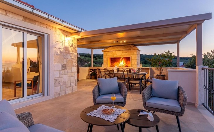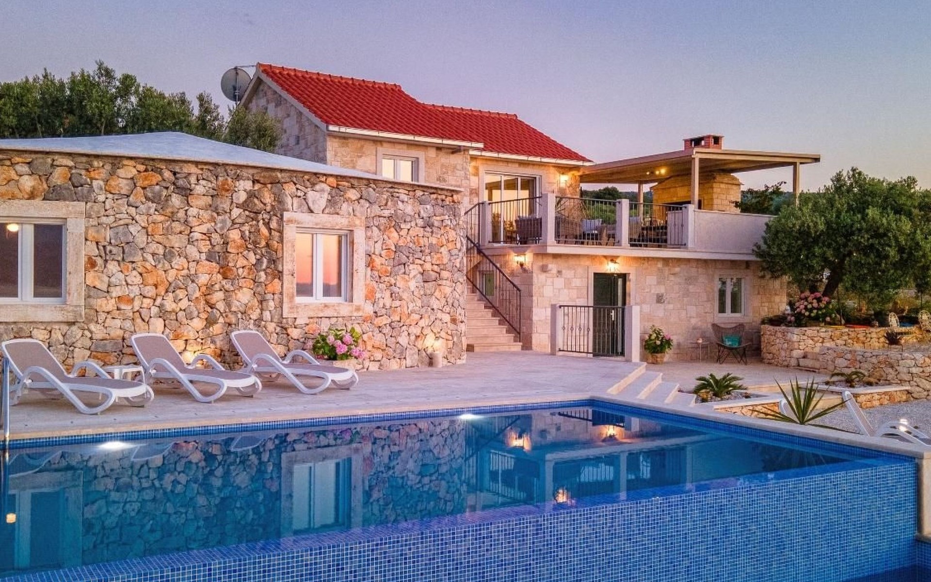The outside area is not only filled with so many things, but also beautiful to look at. The entire villa is finished with stone cladding, which is very typical for the island of Brač, which is famous for its natural stone production. A pool is waiting for you if you don't feel like a beach holiday. There is no great pool without loungers and parasols, and there is even an outdoor shower here.
