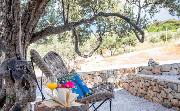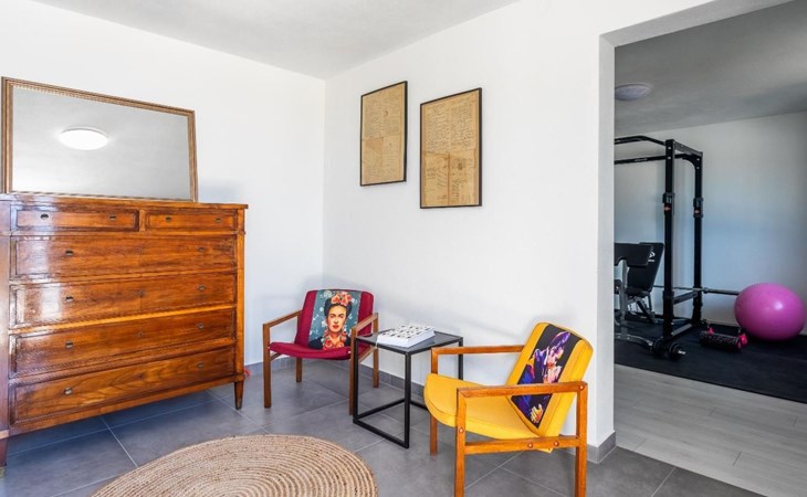 The villa has 3 spacious bedrooms, all with en-suite bathrooms. Two bedrooms have double beds and one bedroom has a double bed and a single bed. Perfect if you are travelling with children. The living room is large and spacious, filled with a collection of movies and books for cosy autumn nights. This villa gives you the choice if you enjoy cooking; You can prepare your meals in an outdoor or indoor kitchen. There is also a barbecue and a stone house with a fireplace next to the outdoor kitchen.
