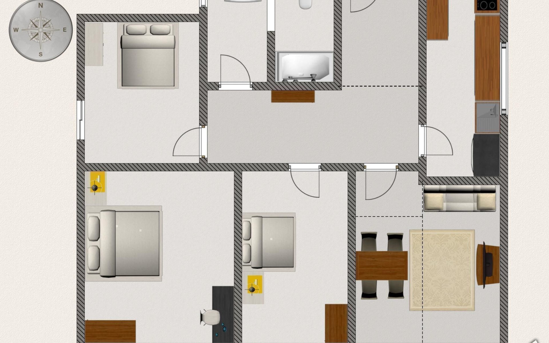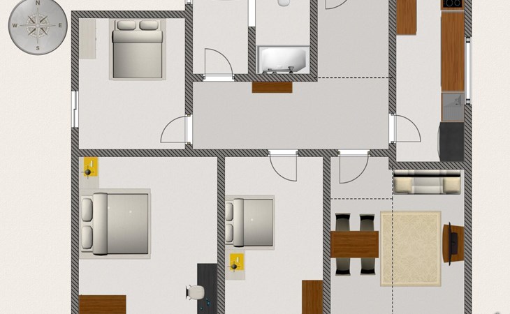 The apartment with the ground-plan of 80 square meters is equipped for four till six adult people. The apartment consists of four rooms: Three spacious bedrooms each with a double bed. In the modern well equipped kitchen you’ll find a coffee appliance, a large refrigerator with freezer, electric stove, electric and gas cooker. In the living room with an extra double - bedded sofa is also a TV sets with satellite programs, hi-fi, DVD, Wii-Fi, fire-place available. The modern bathroom is equipped with shower and toilet. All the rooms have air - conditioning.