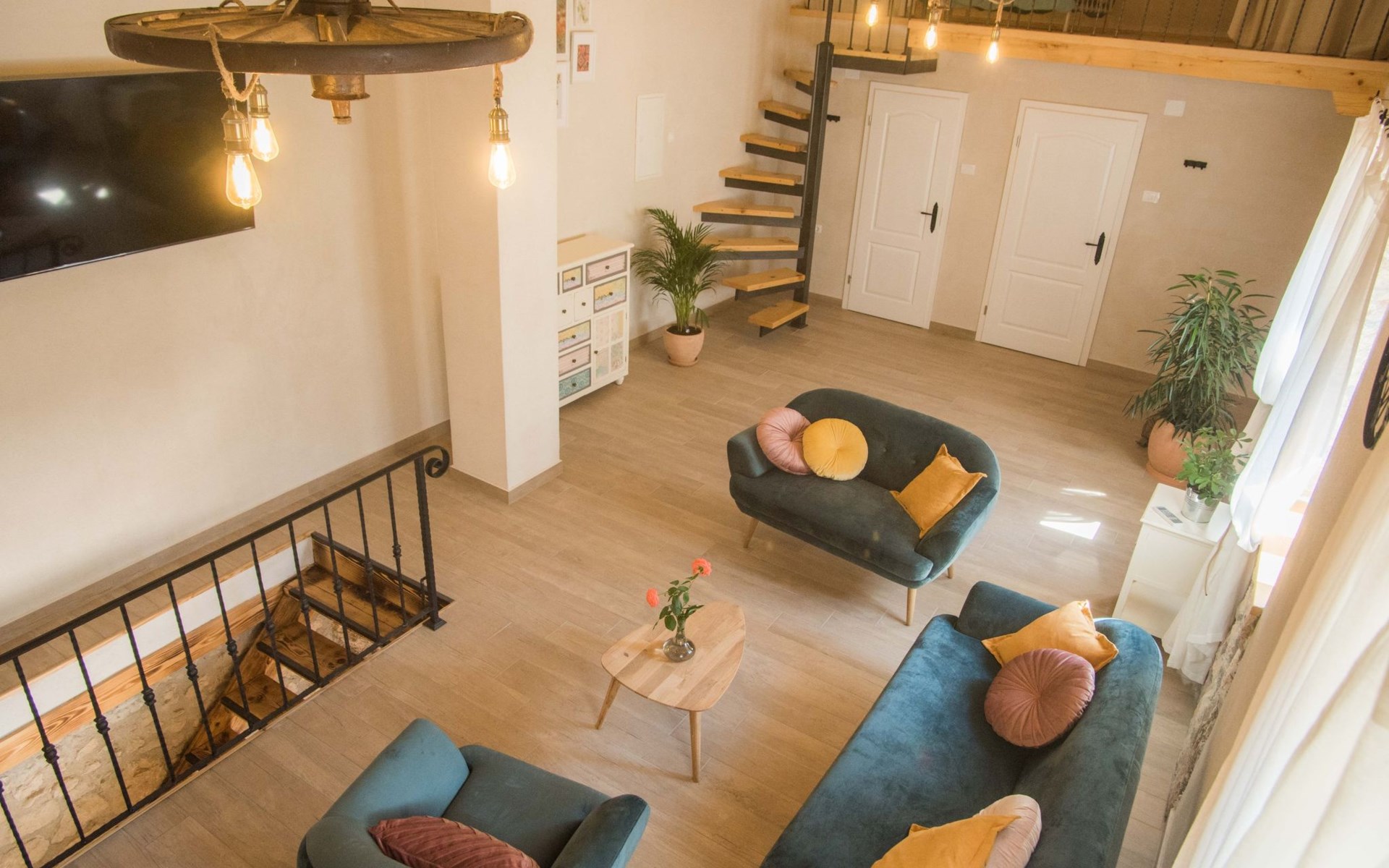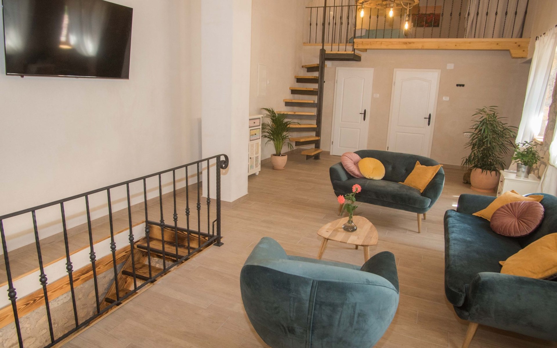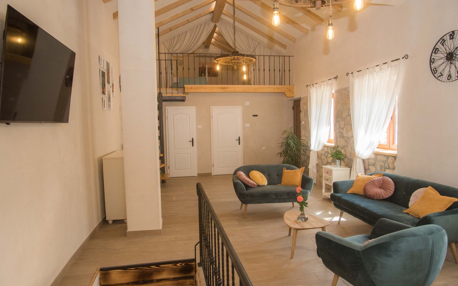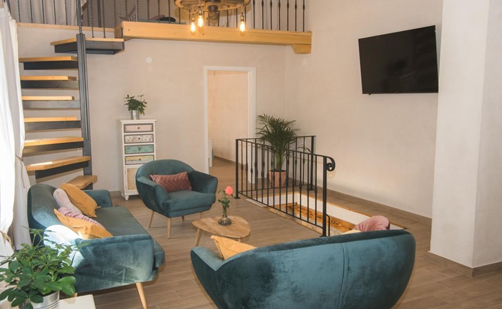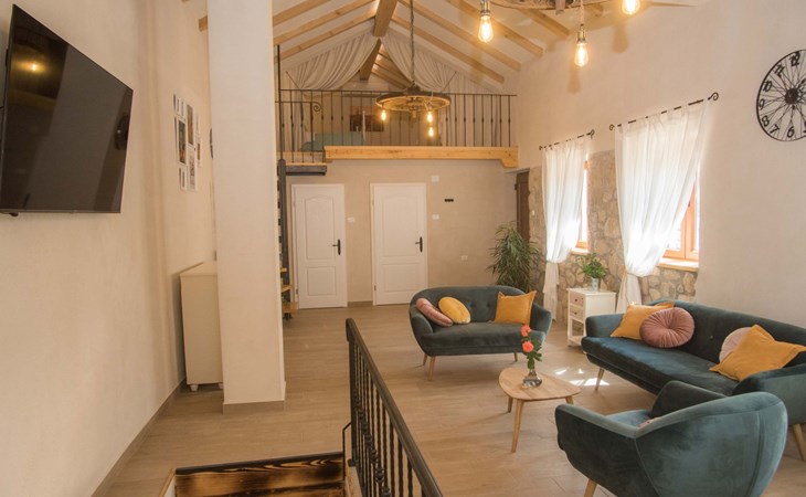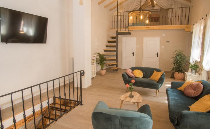 On the first floor there is spacious living room with TV and access to the outdoor terrace and stairs to groundfloor. Also there are two bathrooms and one bedroom on the first floor. Other two bedrooms are in the loft.