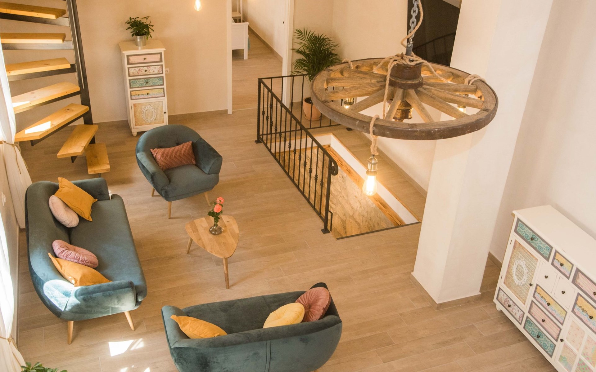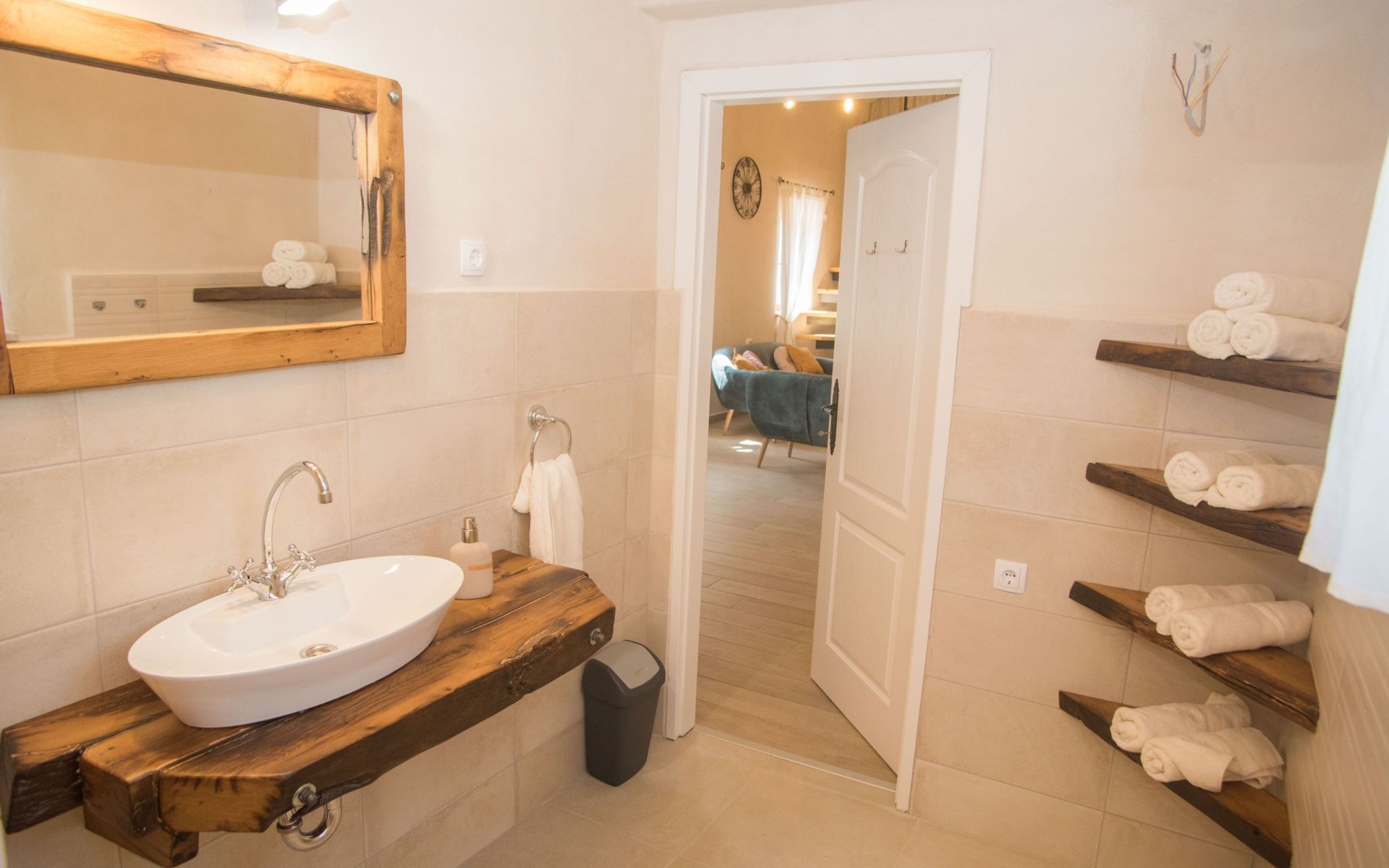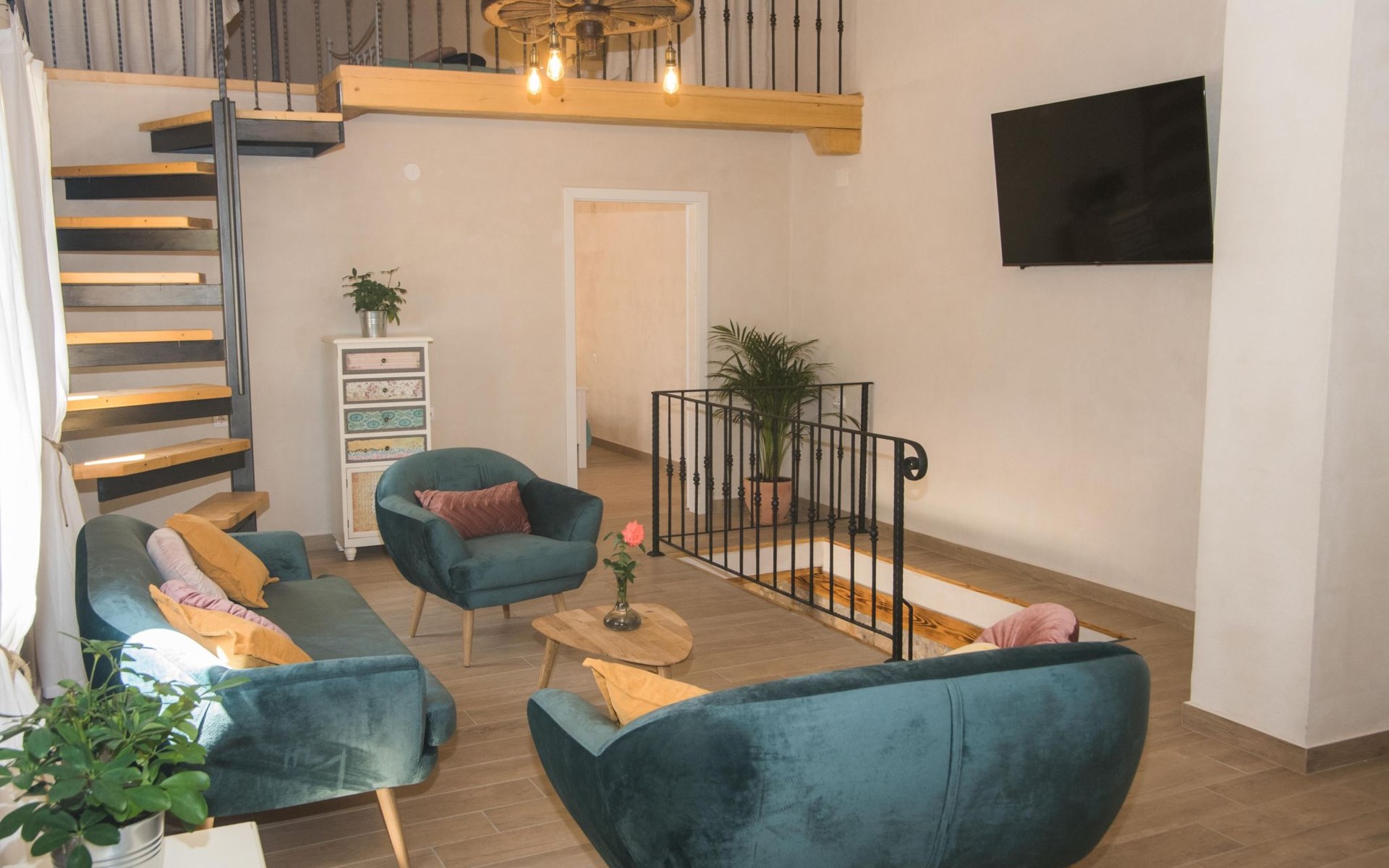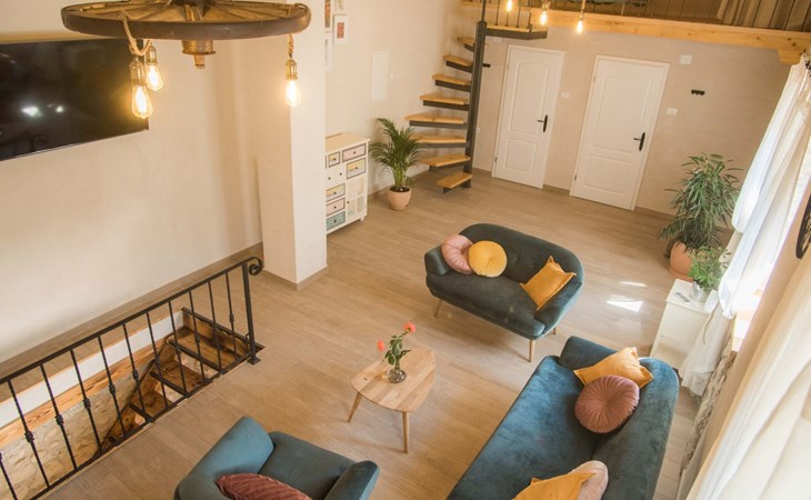 On the first floor there is spacious living room with TV and access to the outdoor terrace and stairs to groundfloor. Also there are two bathrooms and one bedroom on the first floor. Other two bedrooms are in the loft.