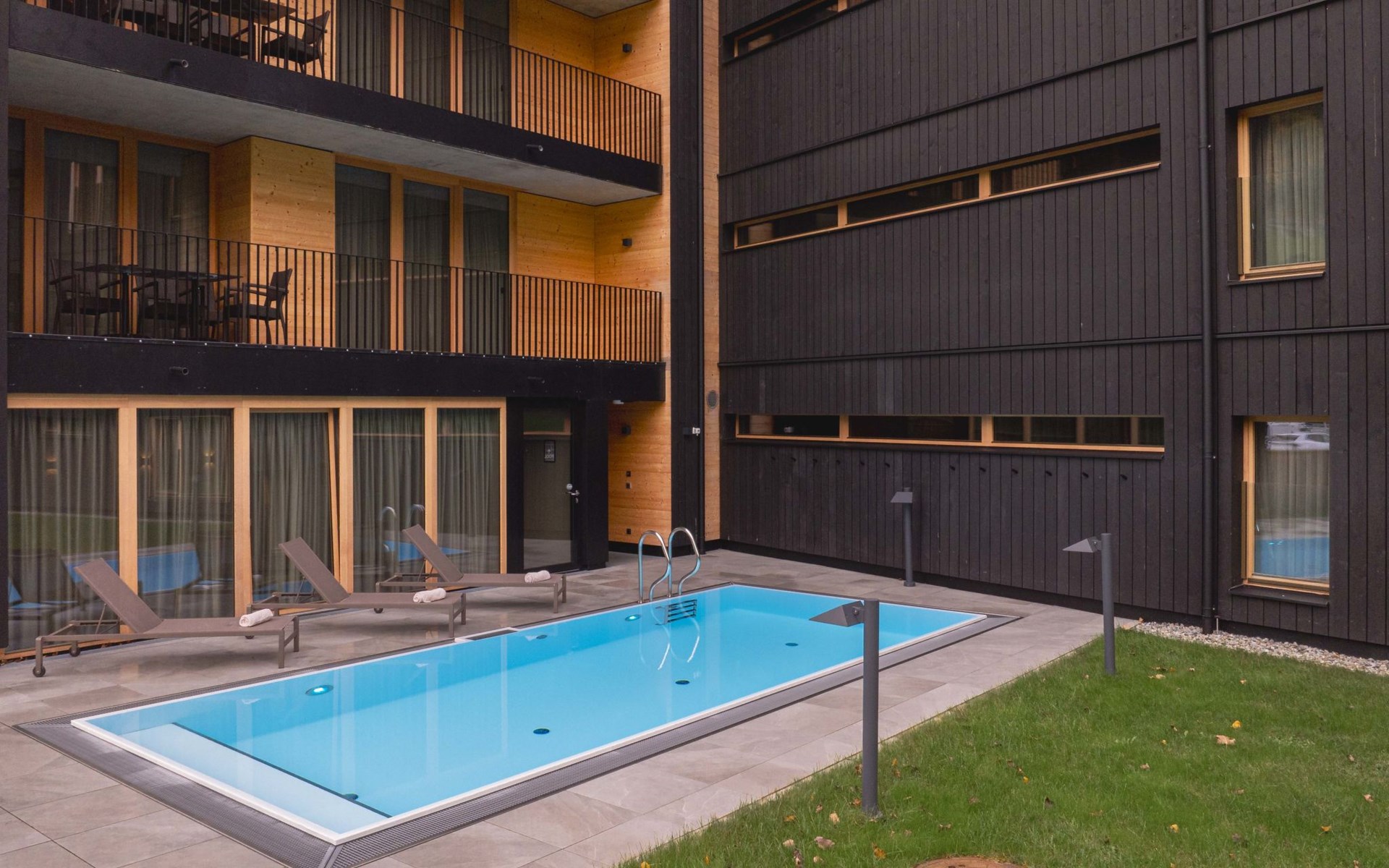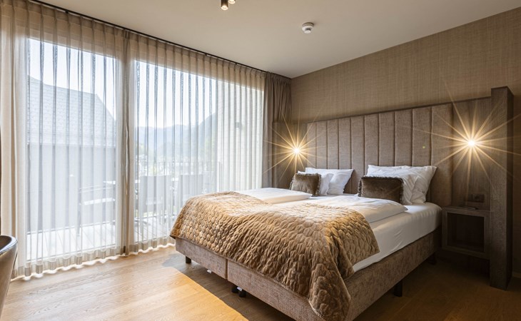 Schruns: Luxurious resort "Montafon Suites by AlpsResort". In the centre of Schruns, 100 m from the skiing area. For shared use: swimming pool heated (seasonal availability: 01.Jan. - 31.Dec.). In the complex: sauna, steam room (all included), relaxation room, spa area, storage room for bicycles, storage room for skis, central heating system. Parking at the house, communal covered parking. E-charging station. Supermarket 450 m, bus stop "Schruns" 450 m, railway station "Schruns" 450 m, outdoor swimming pool 1300 km. Golf course (9 hole) 3.3 km, skisport facilities 100 m. Nearby attractions: Alpenbad Montafon 1.3 km. Well-known ski regions can easily be reached: Skilift Hochjoch/Silvretta Montafon 100 m. Well-known lakes can easily be reached: Bodensee 50 km. Hiking paths: Silvrettahochalpenstrasse, Bielerhöhe. The photo is just an example.