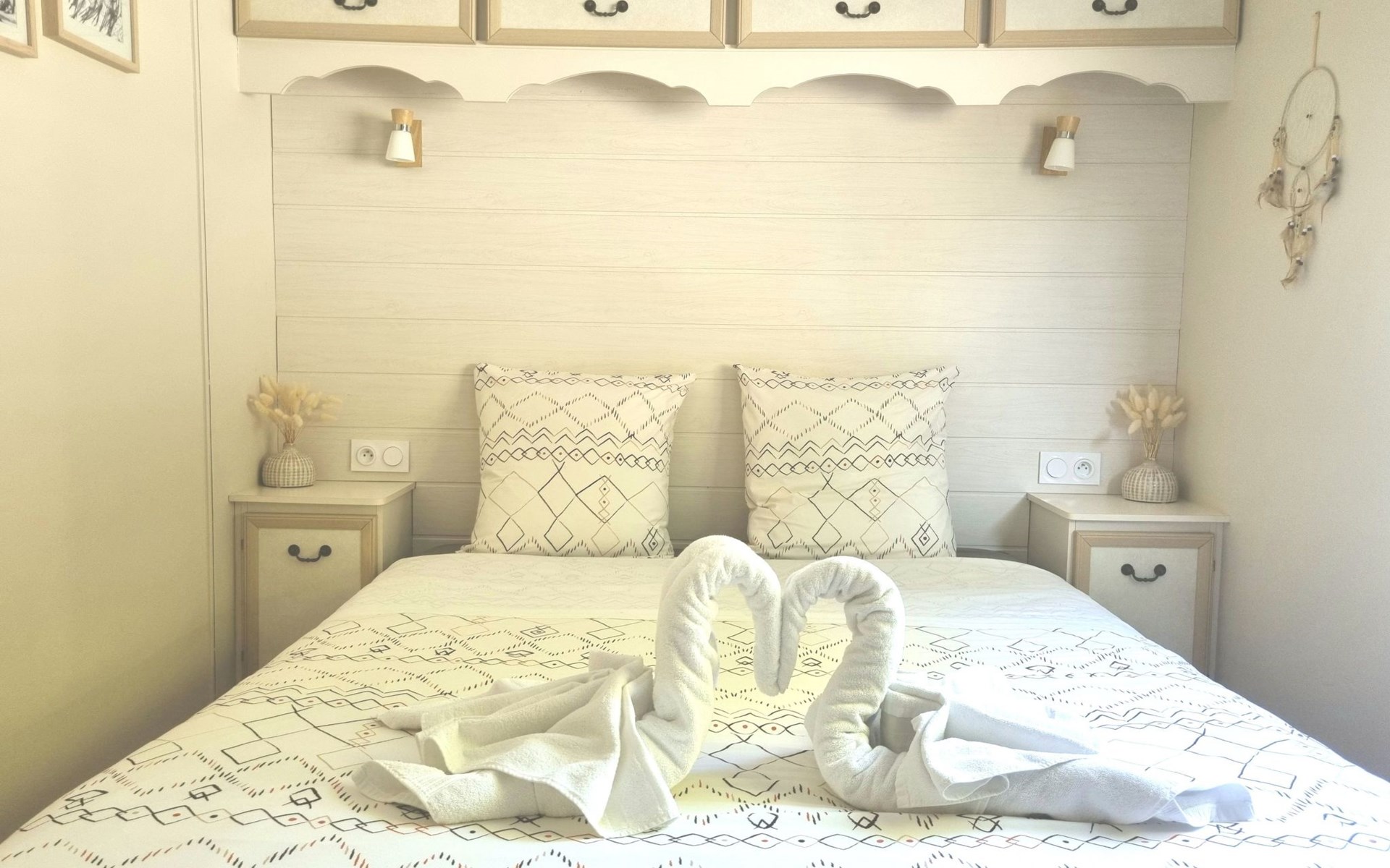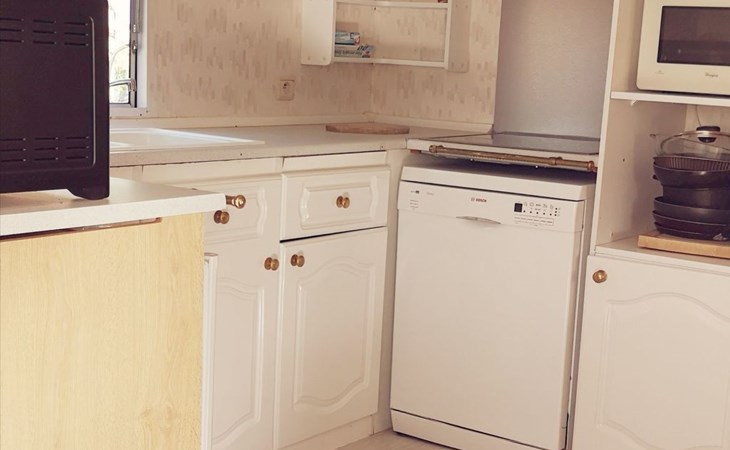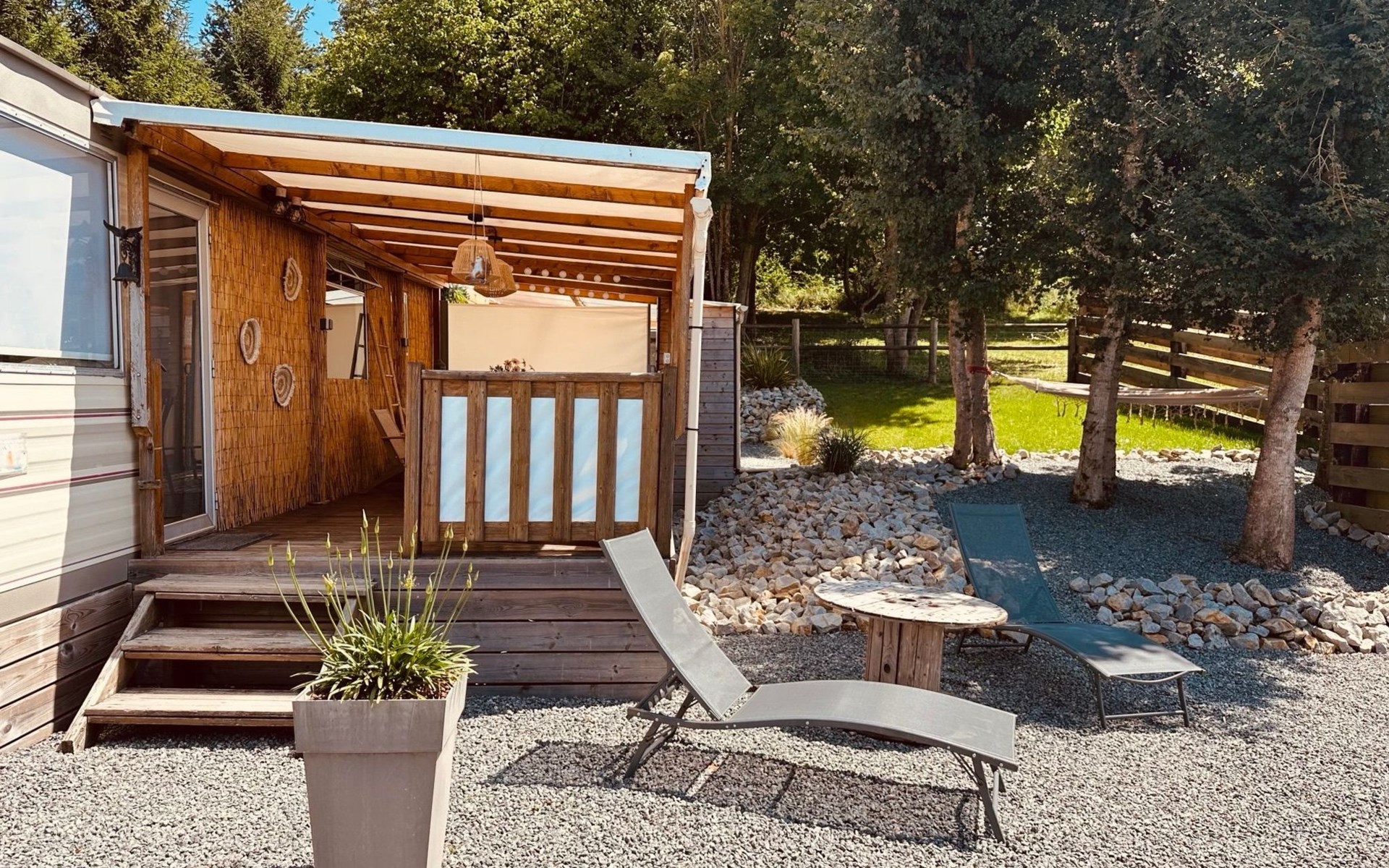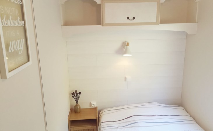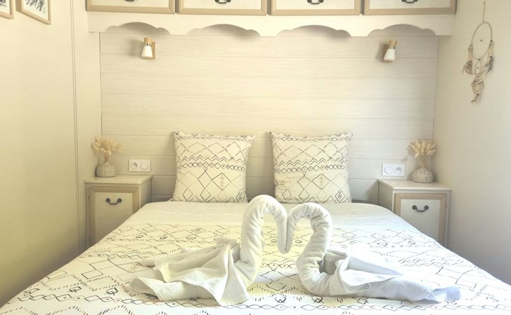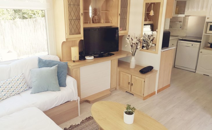 The interior of this mobile home is equipped to meet your needs during your stay. The kitchen is well equipped with a ceramic hob, a dishwasher, a coffee maker with soft pods, an electric kettle and a mini-oven to prepare and enjoy your meals with ease. A washing machine for private use in the accommodation also ensures your comfort. Relaxation is guaranteed with a connected TV, so you can keep up to date with your favourite series and films.