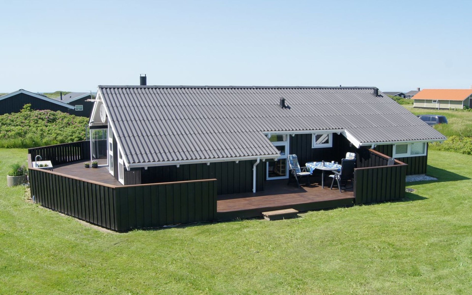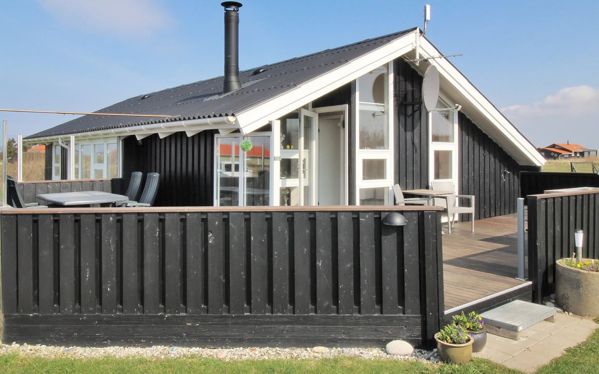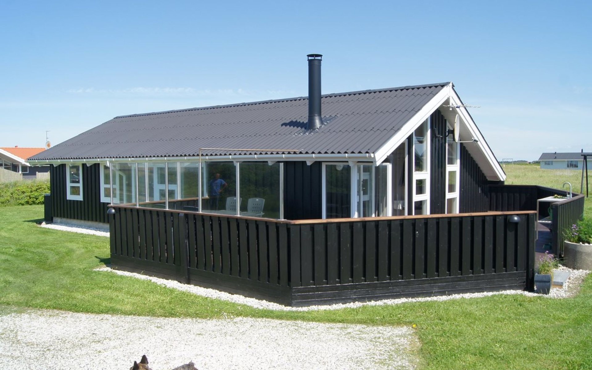 Single-family house, built in 1994. 300 m from the sea. Private: natural state property 2'500 m2. Terrace (50 m2), children's playground (swing). In the house: sauna, washing machine. Parking at the house. Grocery 1 km. The owner does not accept any youth groups.