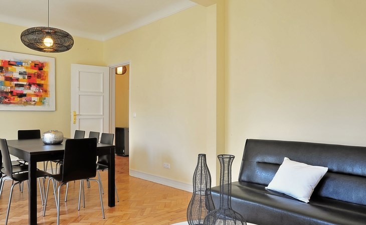The outdoor space of this apartment is just as inviting. Guests can enjoy the charming balcony, offering a quaint spot to sip a morning coffee or unwind after a day of exploration. While grilling is not permitted, the balcony serves as an idyllic nook for relaxation and taking in the ambience of the bustling avenue below.