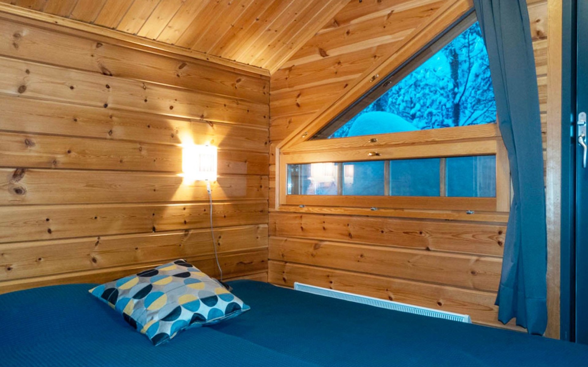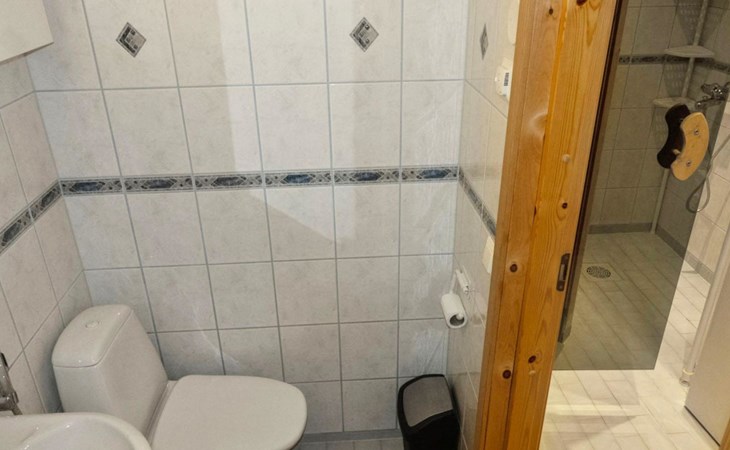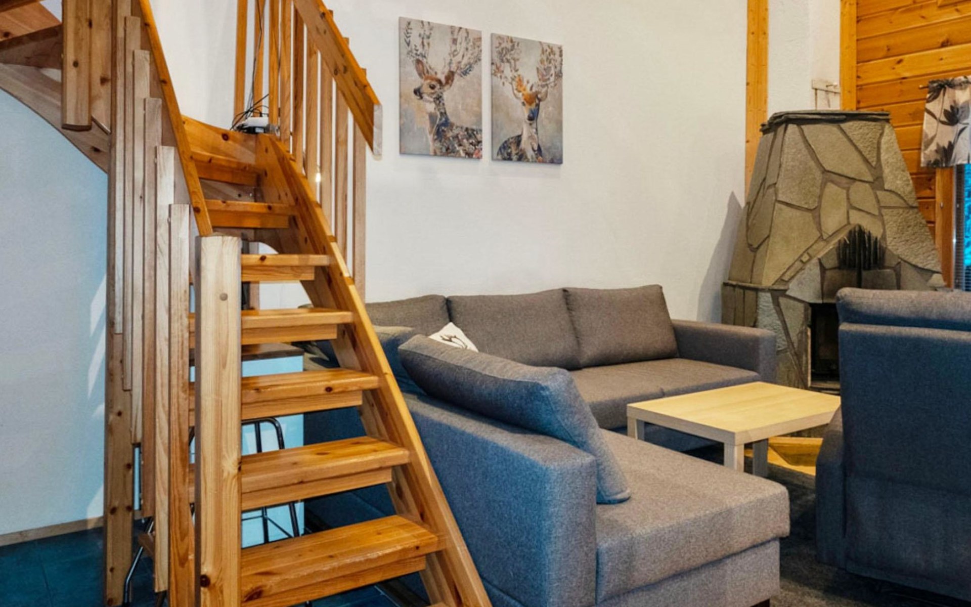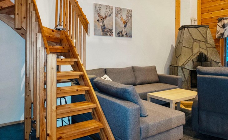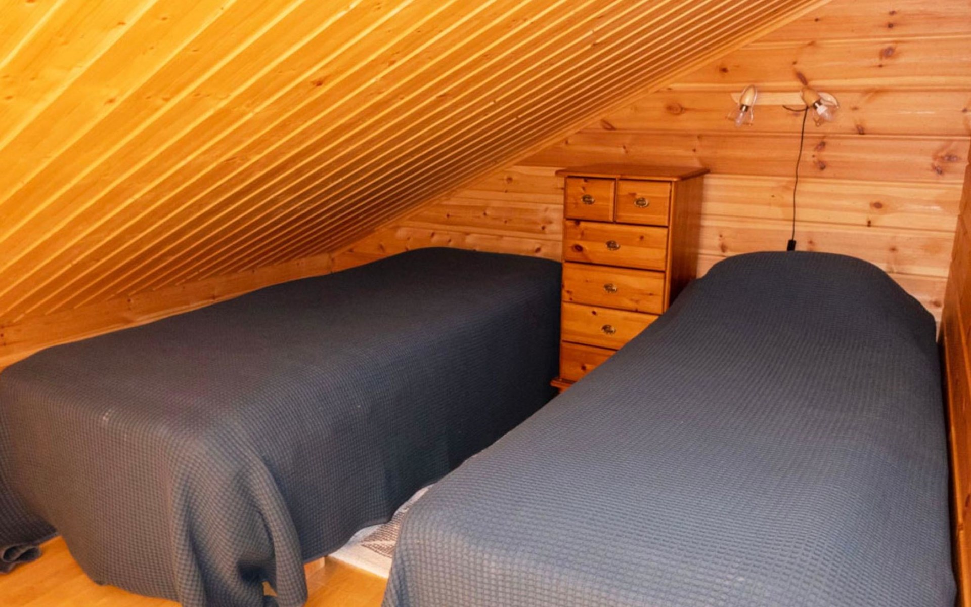 Living room/kitchen, double bed in the bedroom (so-called Yankee bed), 2 beds in the upper floor bedroom, access to the balcony from the bedroom, 2 beds in the loft, sauna, washroom, WC, covered terrace.