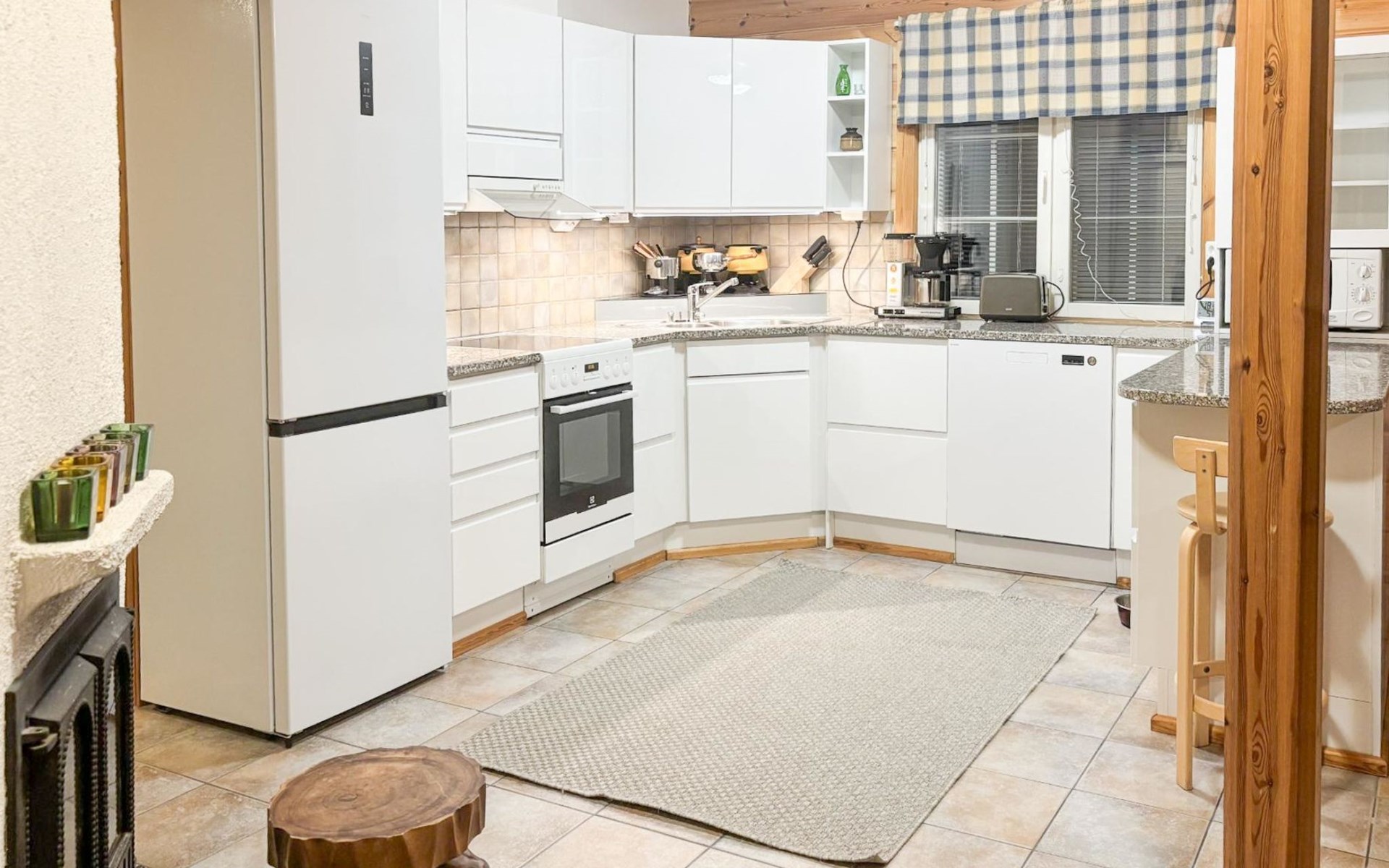 The apartment was built in 2000, downstairs warm entrance hall, spacious living room / kitchen, bedroom with 2 beds, dressing room / utility room, washroom (2 showers), toilet, terrace. Upstairs 3 bedrooms with 2 beds each and a separate toilet. There is also a second fridge in the hallway.