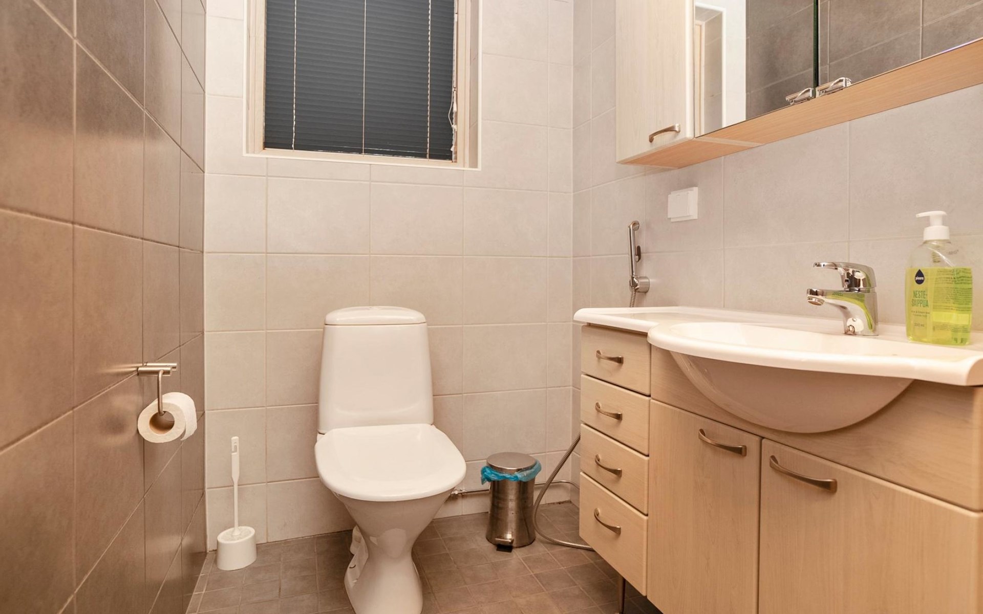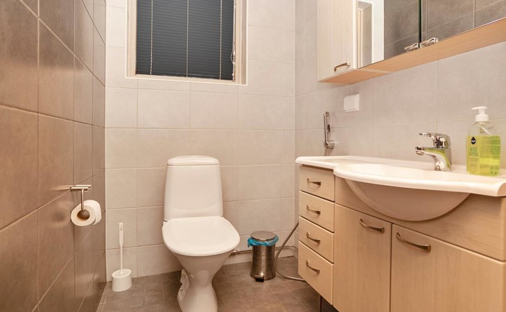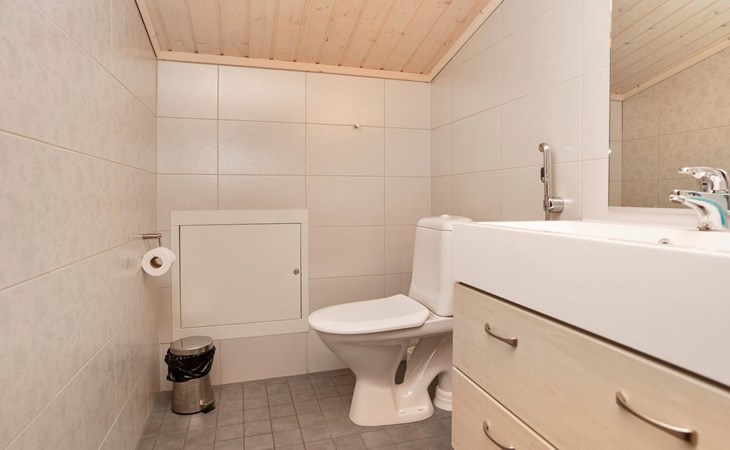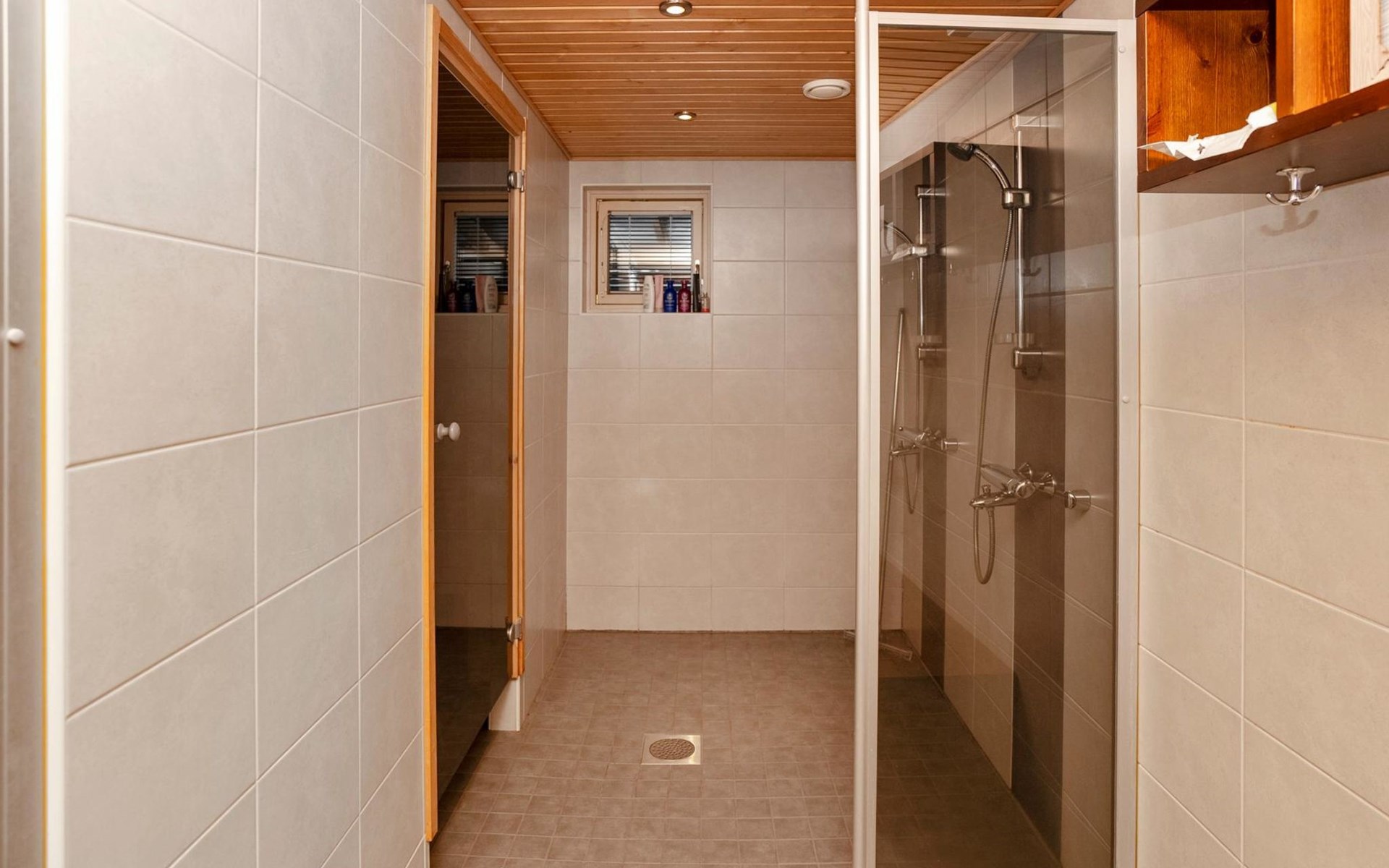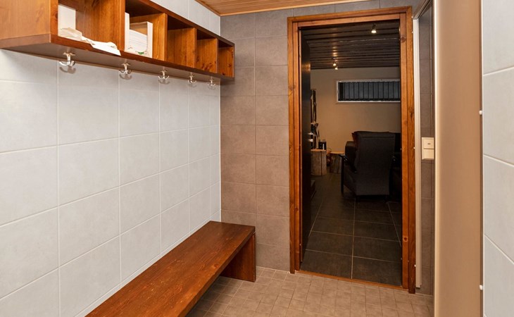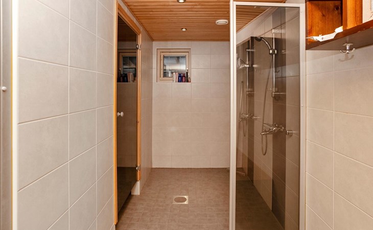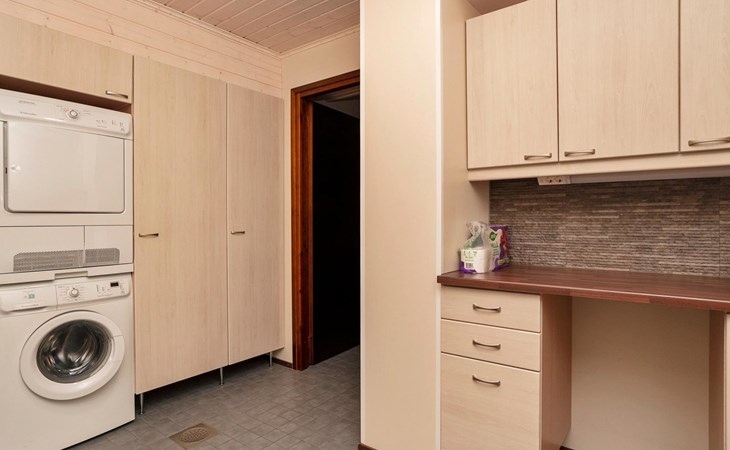 Downstairs fireplace room with convertible sofa for 2 persons and karaoke equipment, utility room, shower room, electric sauna, terrace, second fridge / freezer, 2 drying cupboards for clothes, dryer for clothes and WC.