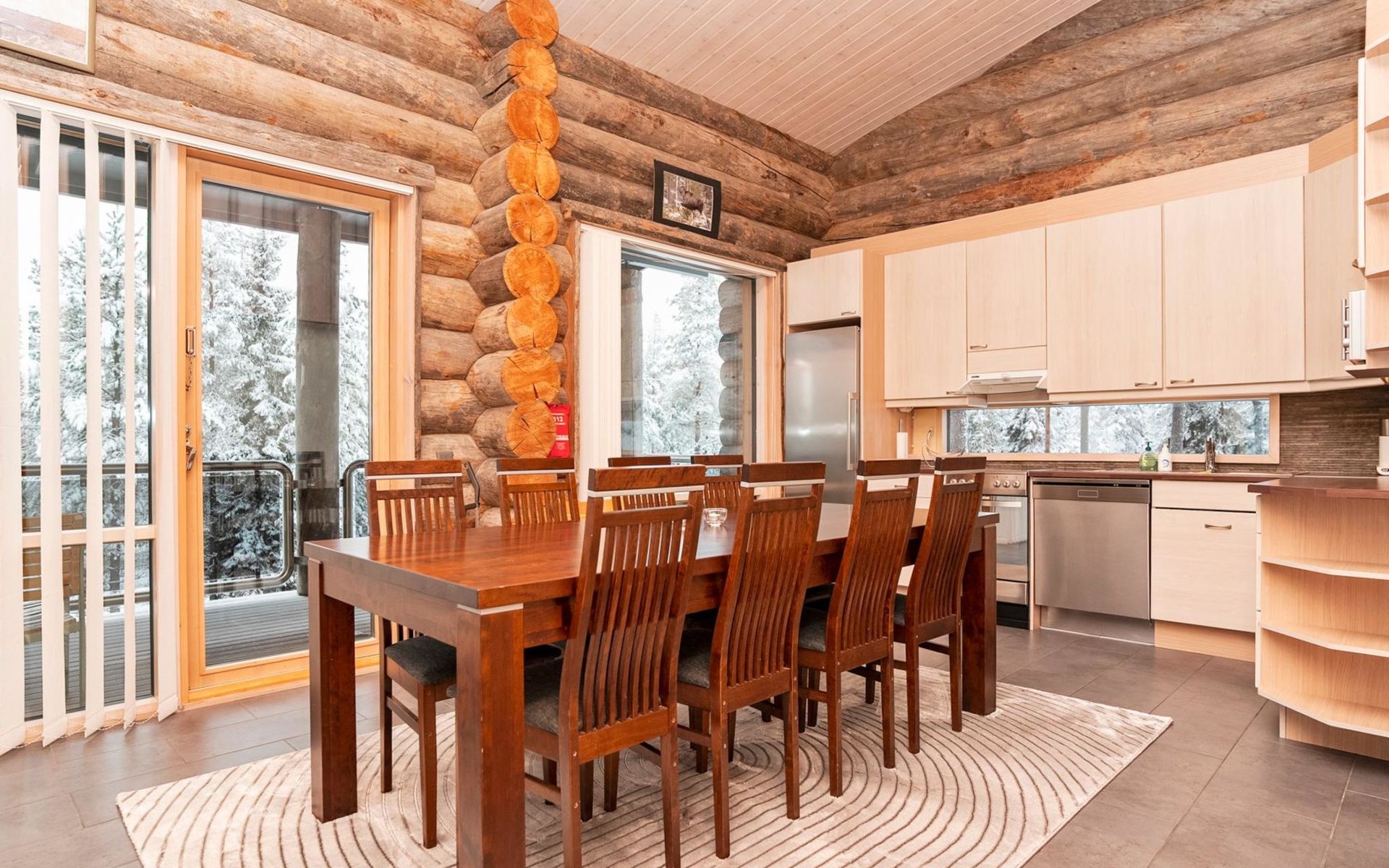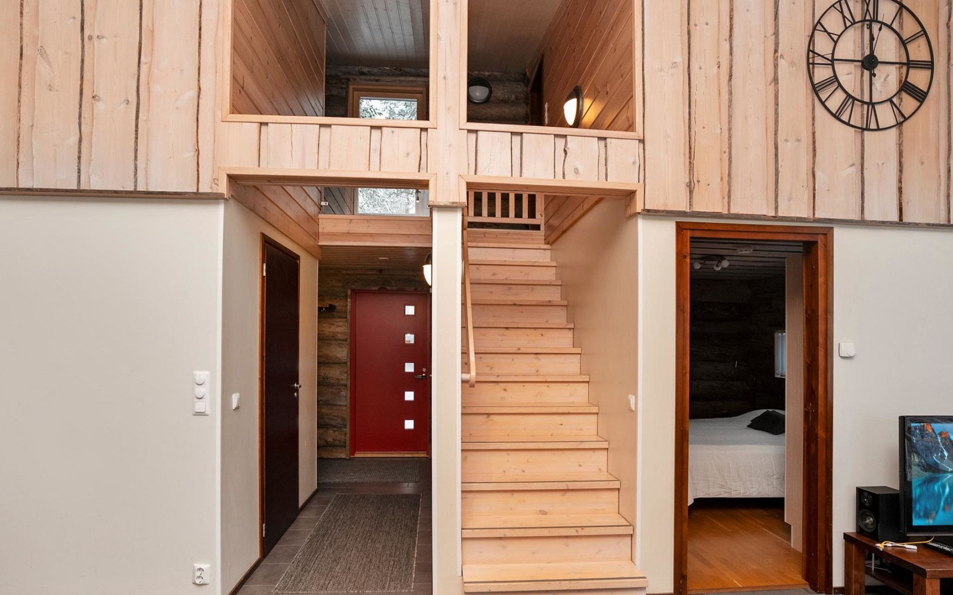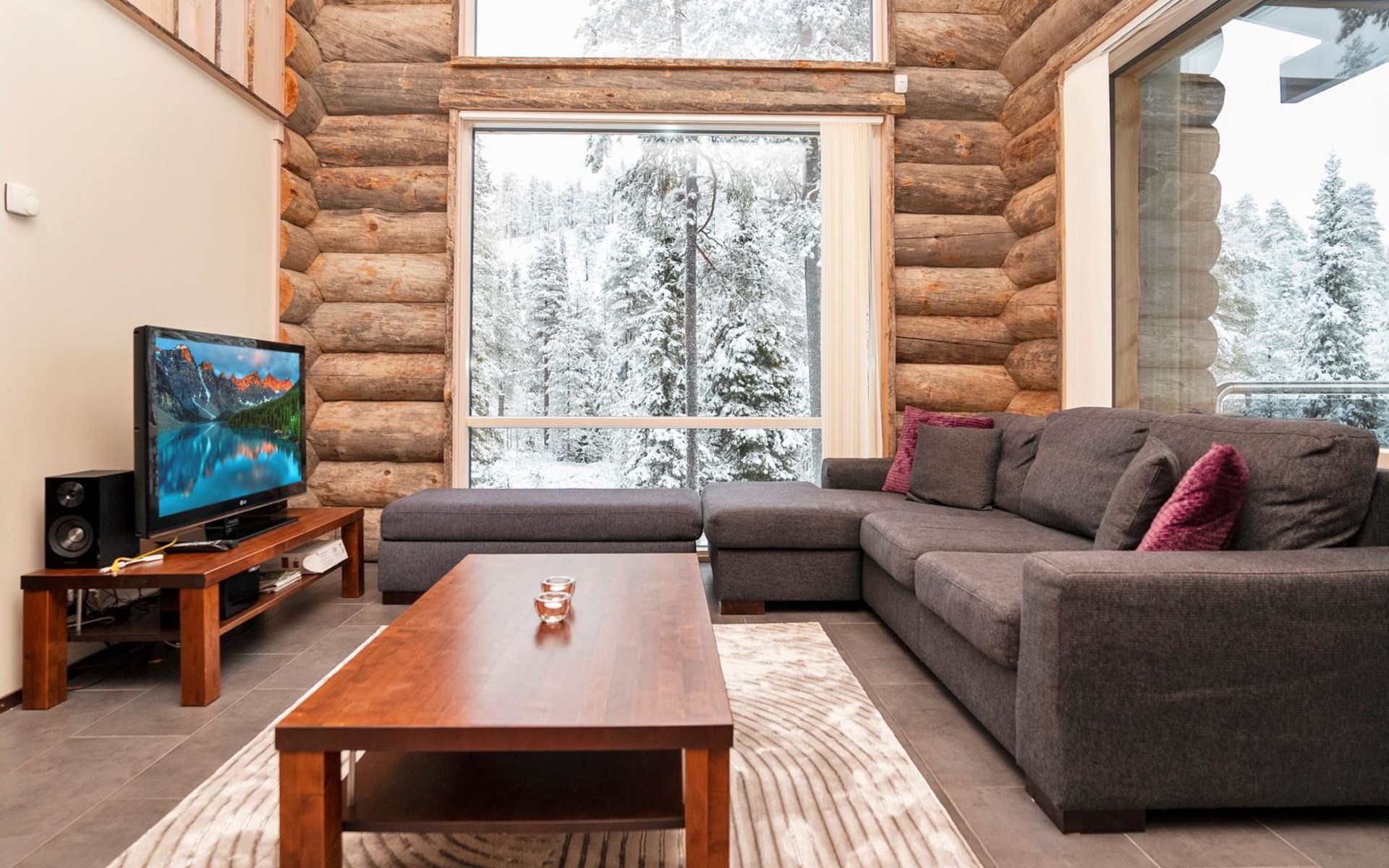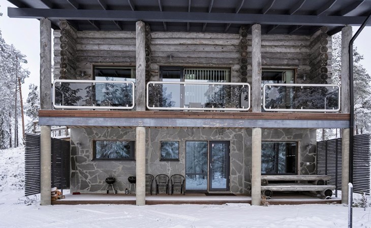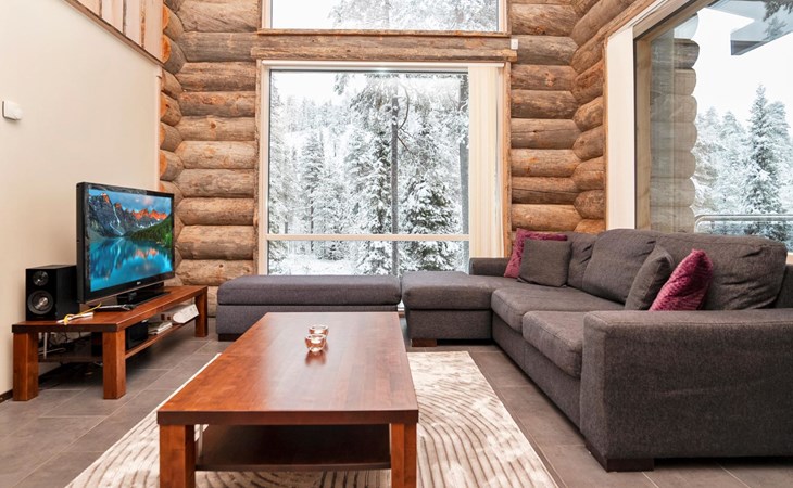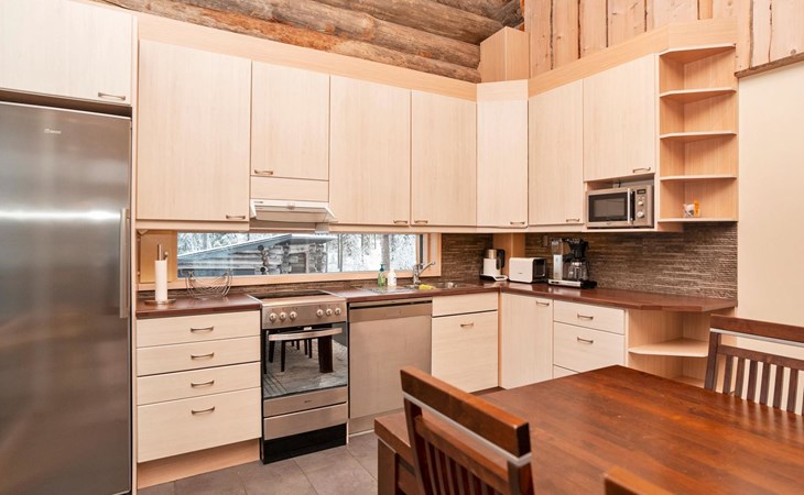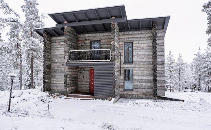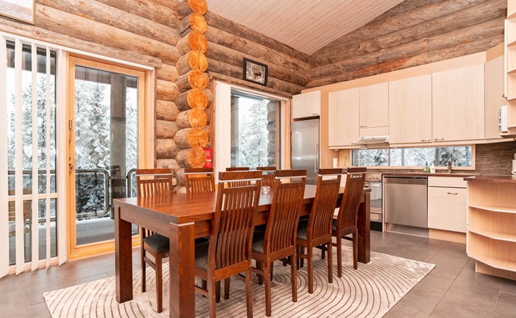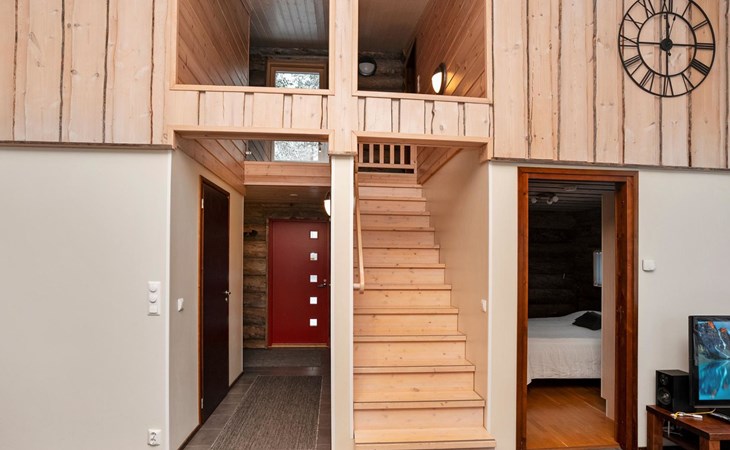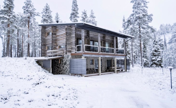 If customer has a pet, we will charge a pet fee/pet which will be added to reservation. Note! Pets aren´t allowed to stay in upstairs. Spacious and modern log cottage in a peaceful area in the north side of Ruka. Suitable especially for families and firms. Ski trail is near. Entrances on middle floor and downstairs.