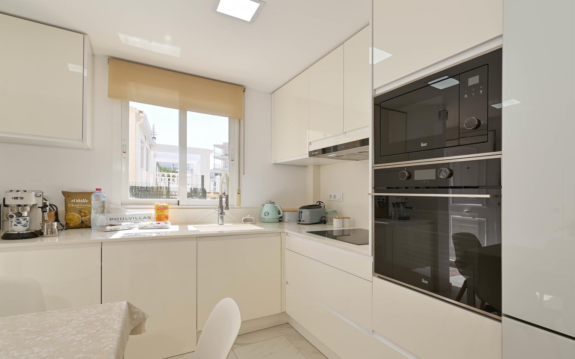 - open kitchen with electric hob, electric oven, microwave, dishwasher, refrigerator-freezer, coffee machine, electric kettle, mixer and toaster