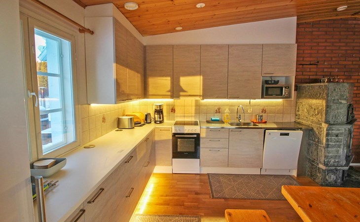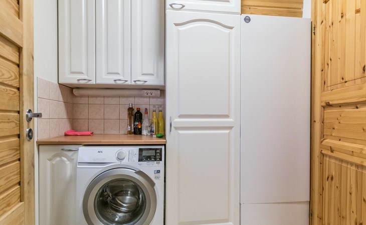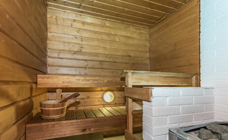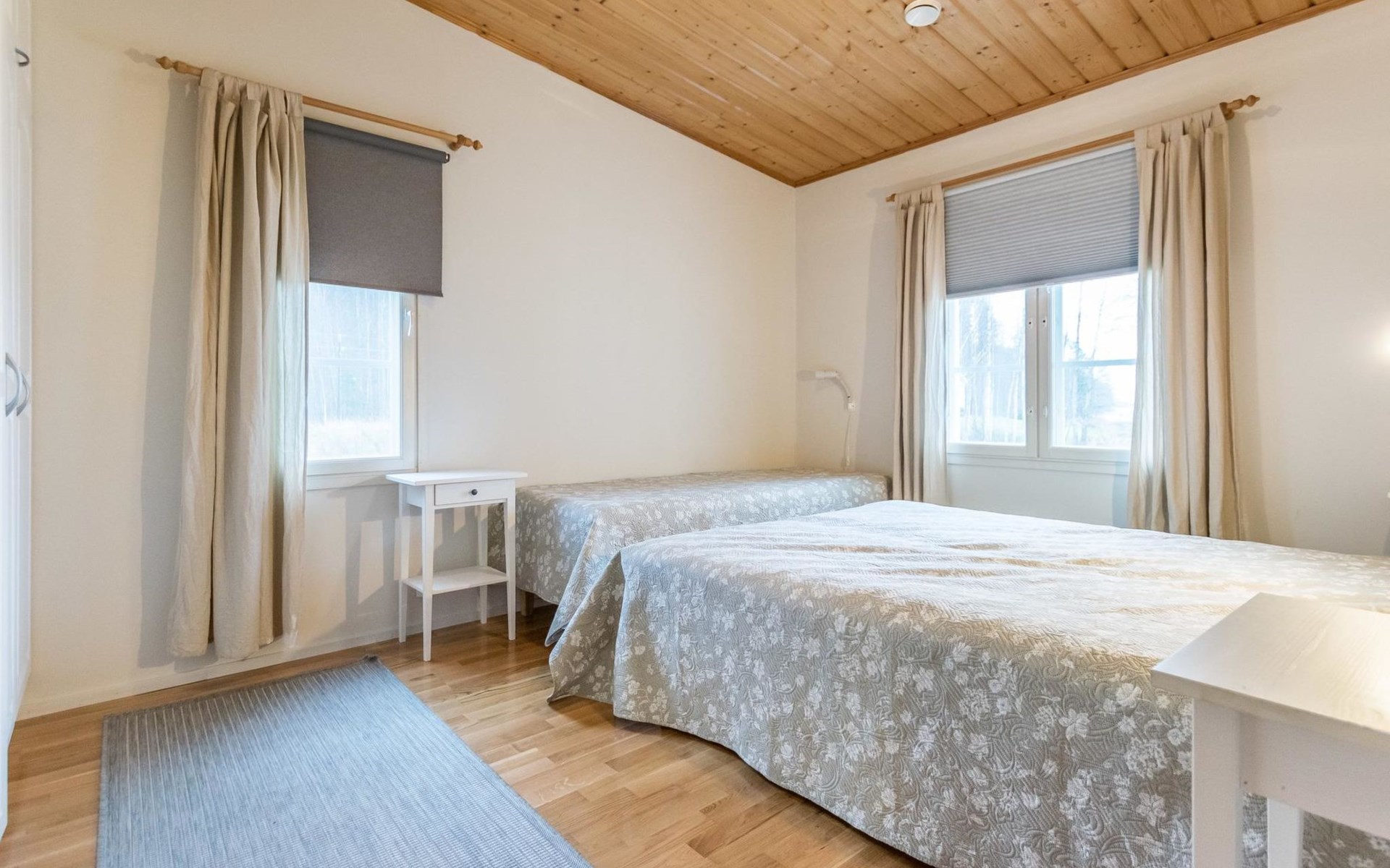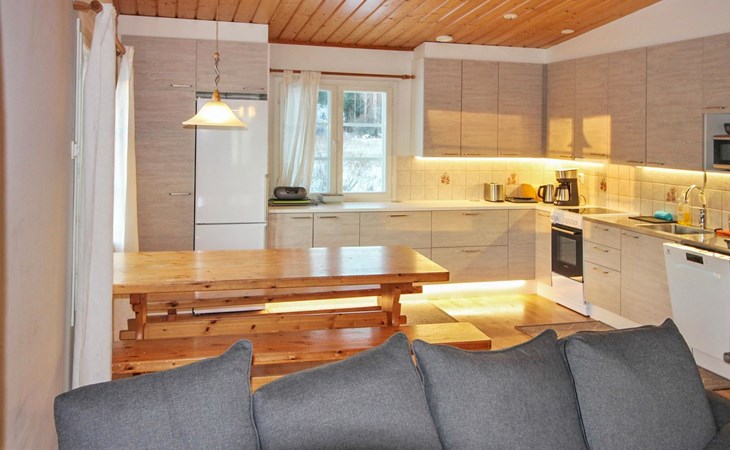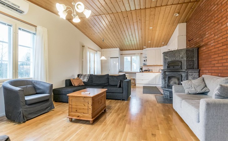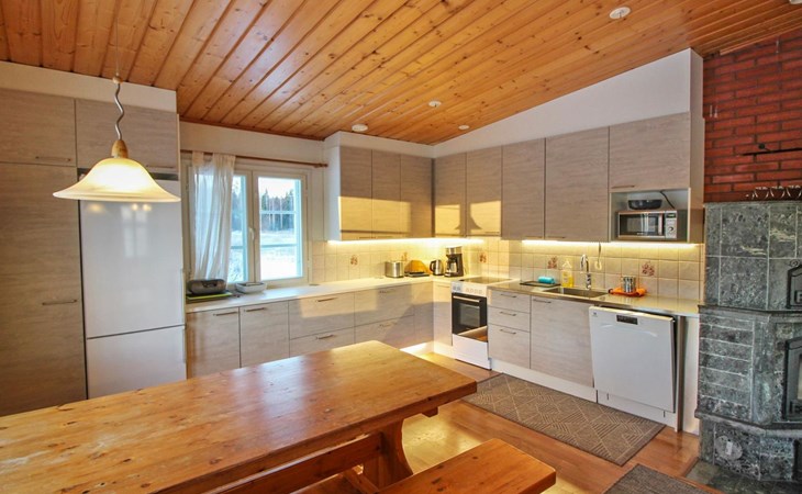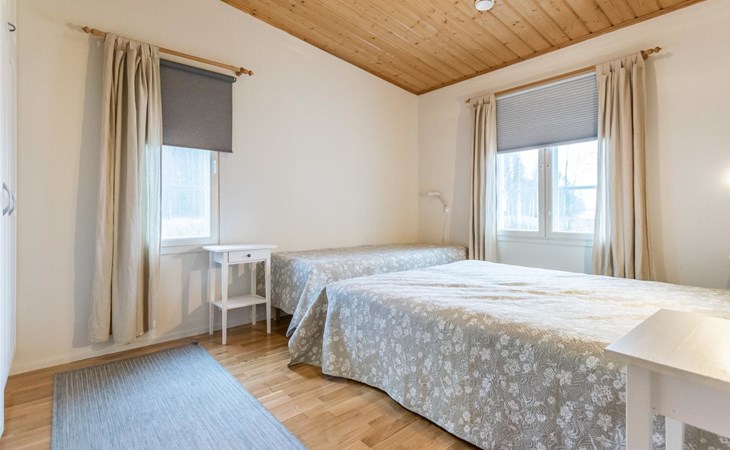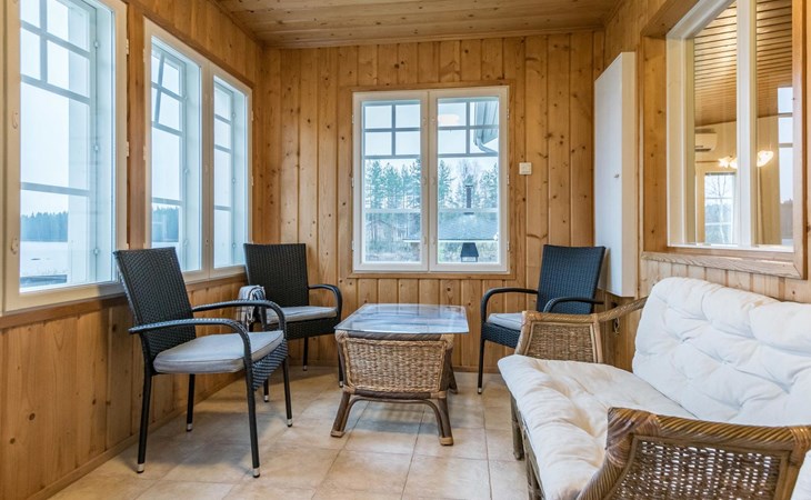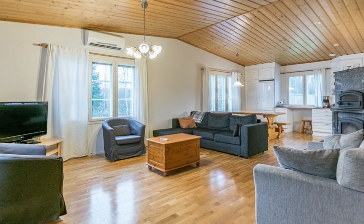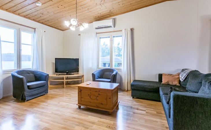 Well-equipped and spacious wooden cabin with boarded outer walls (2004), spacious living room (sofa bed 140x200 cm, bed for two) and living room/kitchen with well-equipped kitchen facilities. Two bedrooms, bedroom 1: three beds, bedroom 2: three beds, separate WC, washroom with two showers, sauna (wood-burning sauna stove).