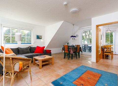 The maisonette with under-floor heating can accommodate up to four people. It has a separate bedroom with a double bed (180 x 200cm). The modern, open living and dining room is also on the first floor. The living room provides a sofa bed with a sprung mattress and a flatscreen TV. This floor also has a bathroom with a walk-in shower and a towel radiator. Stairs in the hallway lead up to the generous, open sleeping gallery on the second floor suitable for children. It also has a pull-out sofa. Children have also been taken into consideration and a travel cot, highchair and bottle warmer are available free of charge. The second floor can be secured by a gate. The apartment has been classified as three-star by the DTV.
