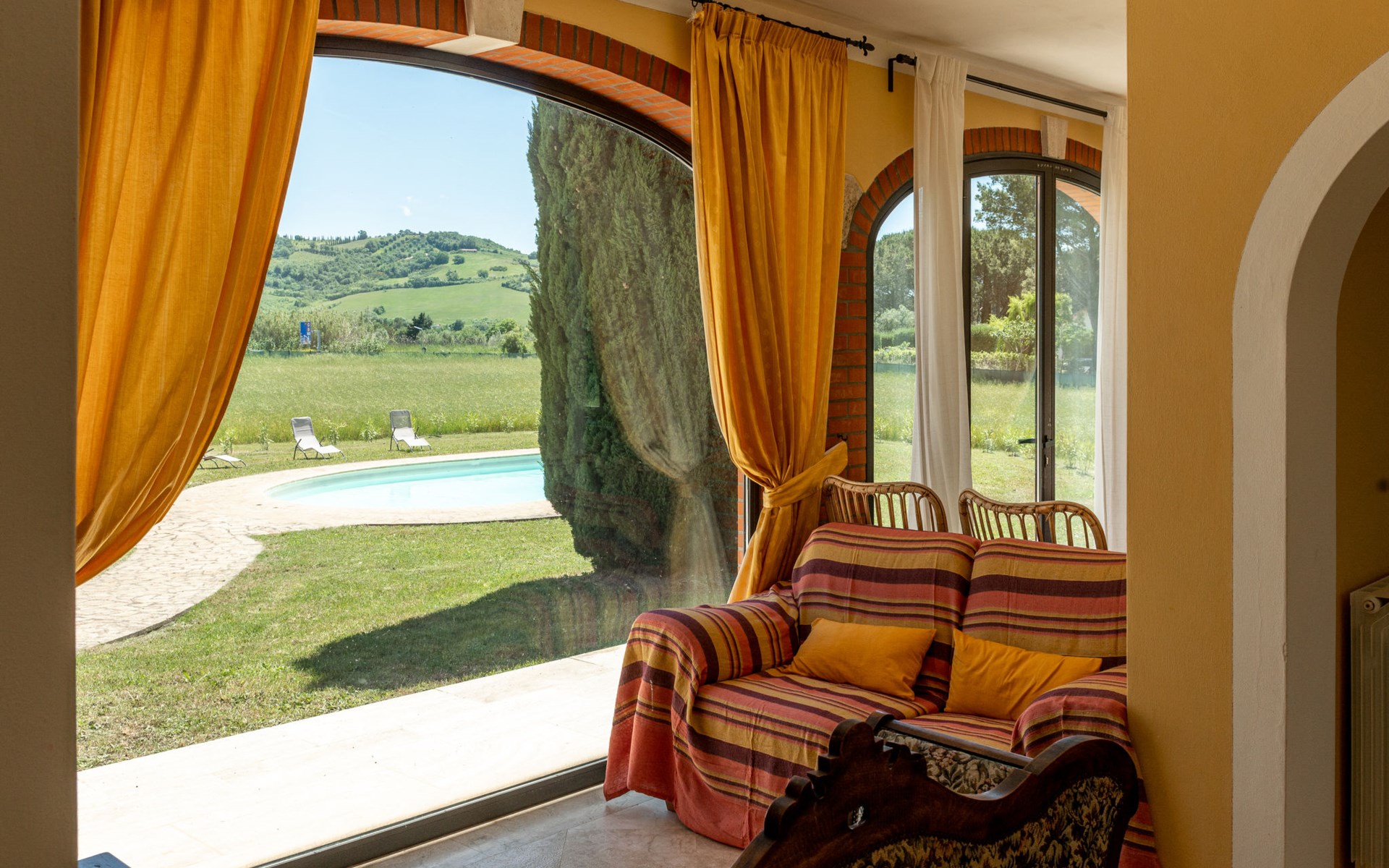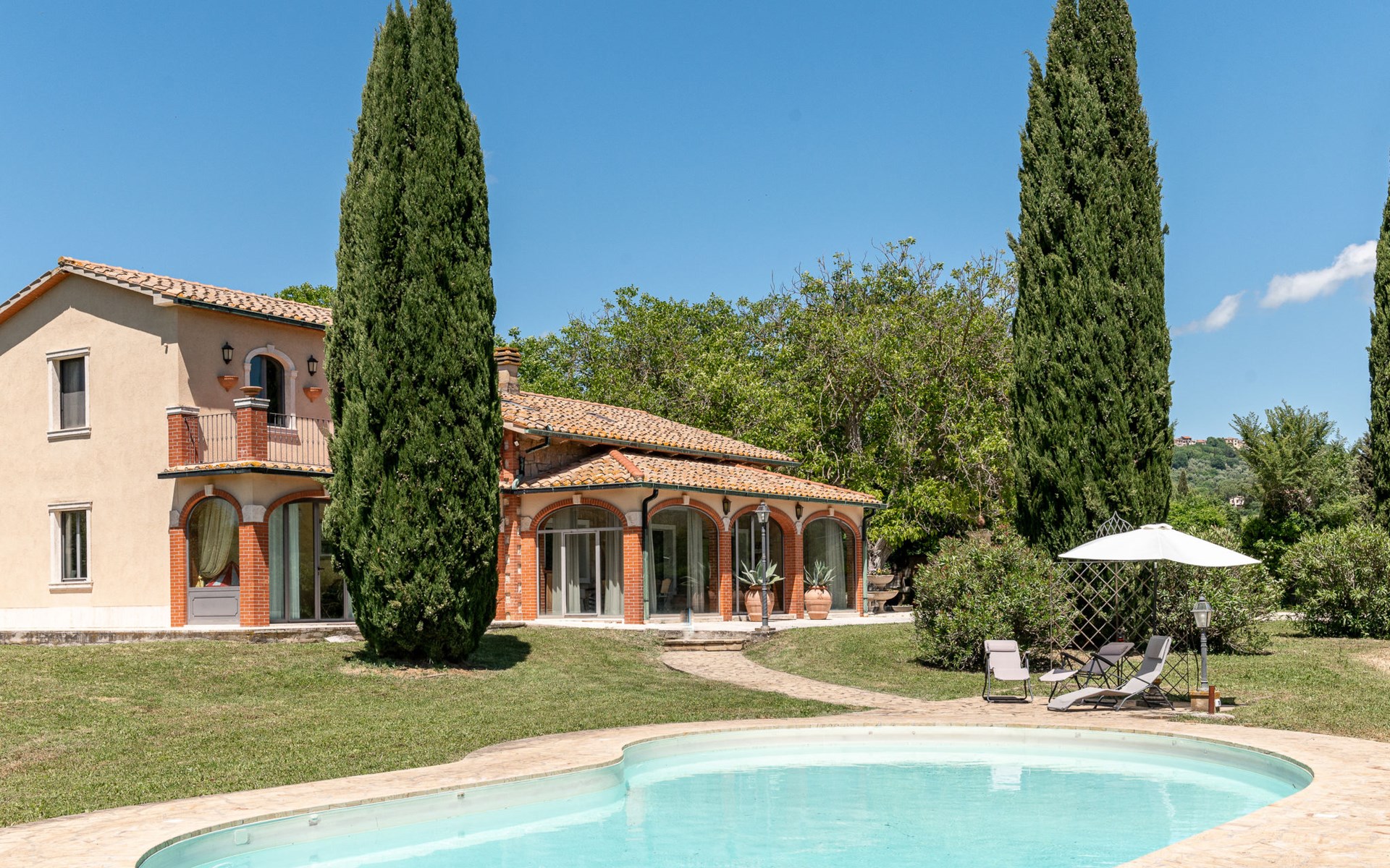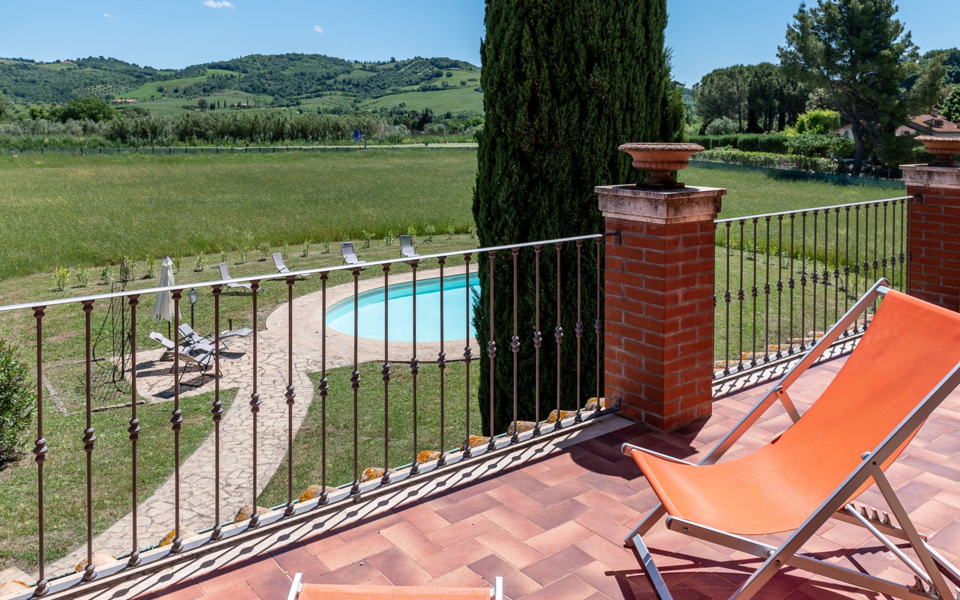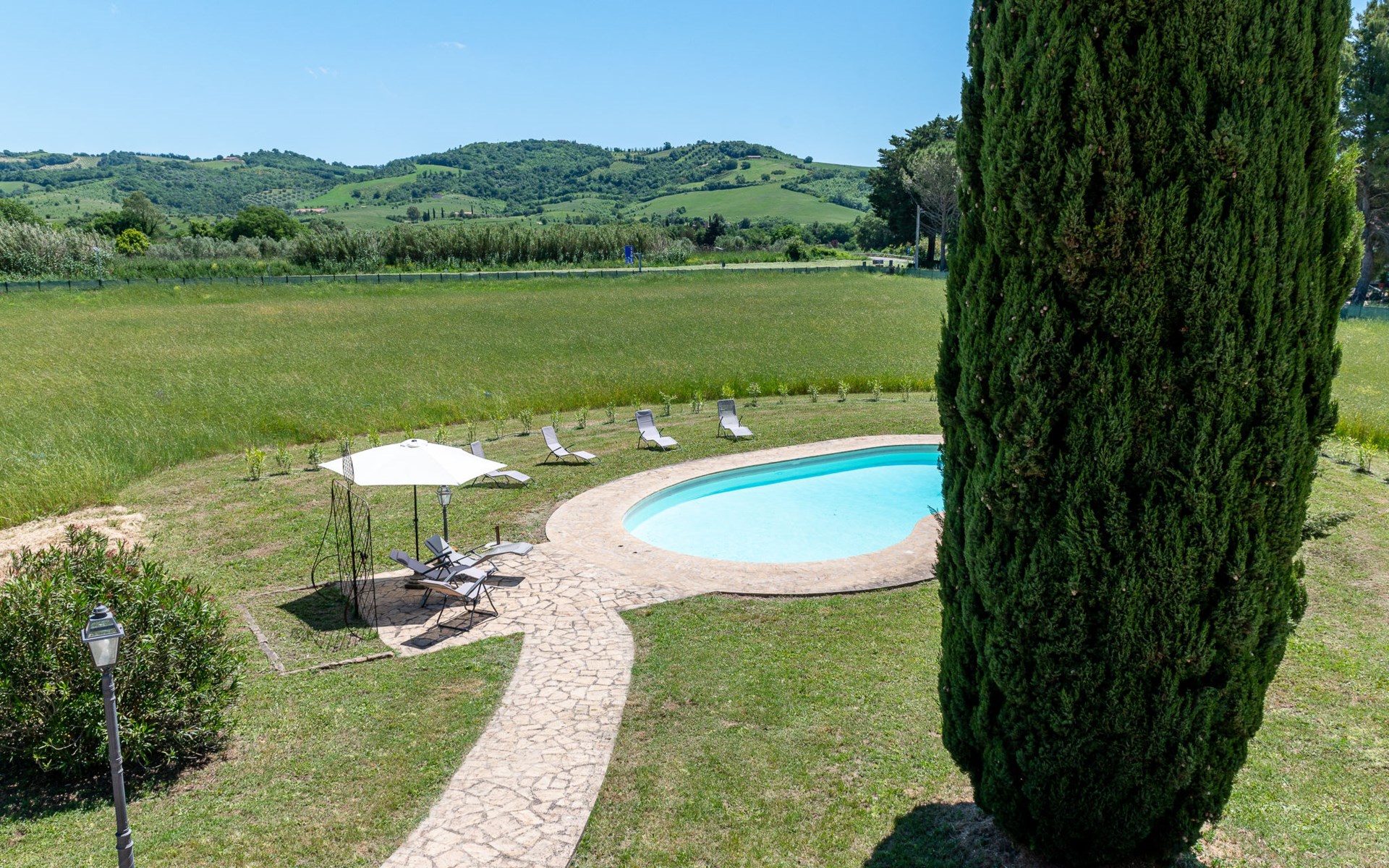Located in a strategic position to fully enjoy the Terme di Saturnia, the most important spa in the Maremma and to visit the picturesque villages of southern Tuscany and the Agrentario sea. Beautiful, cosy villa "Le Cascate", 2 storeys, surrounded by meadows and fields. 2 km from the centre of Saturnia, 12 km from the centre of Manciano, in a secluded, sunny position, 45 km from the sea, 45 km from the beach, in the countryside. Private: property 15'000 m2 (fenced) with lawn and wildlife garden, swimming pool (12 x 5 m, depth 140 - 190 cm, seasonal availability: 15.May. - 30.Sep.). Terrace, garden furniture, barbecue. In the house: washing machine, heating available only from 15.Oct. - 15.Apr.. Parking at the house. Grocery 2 km, supermarket 12 km, restaurant 1 km, bicycle rental 750 m, sandy beach "Argentario" 50 km, thermal baths "Cascate naturali del Gorello" 200 m. Golf course (18 hole) 1.3 km, tennis 1.3 km, walking paths from the house 500 m. Nearby attractions: Montemerano 7 km, Pitigliano/Sovana 23 km, Scansano 28 km, Grosseto 54 km, Bolsena 50 km. Please note: car recommended.