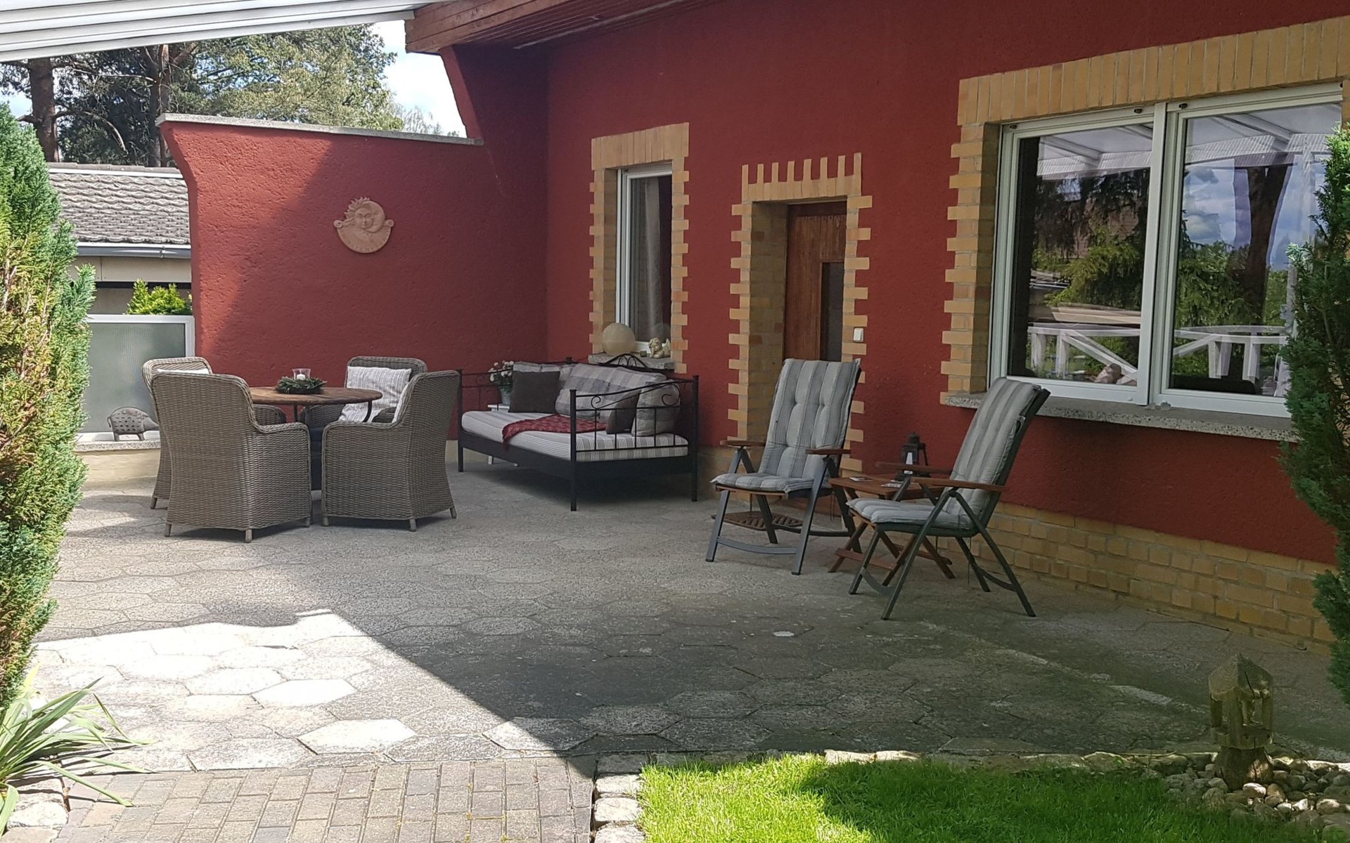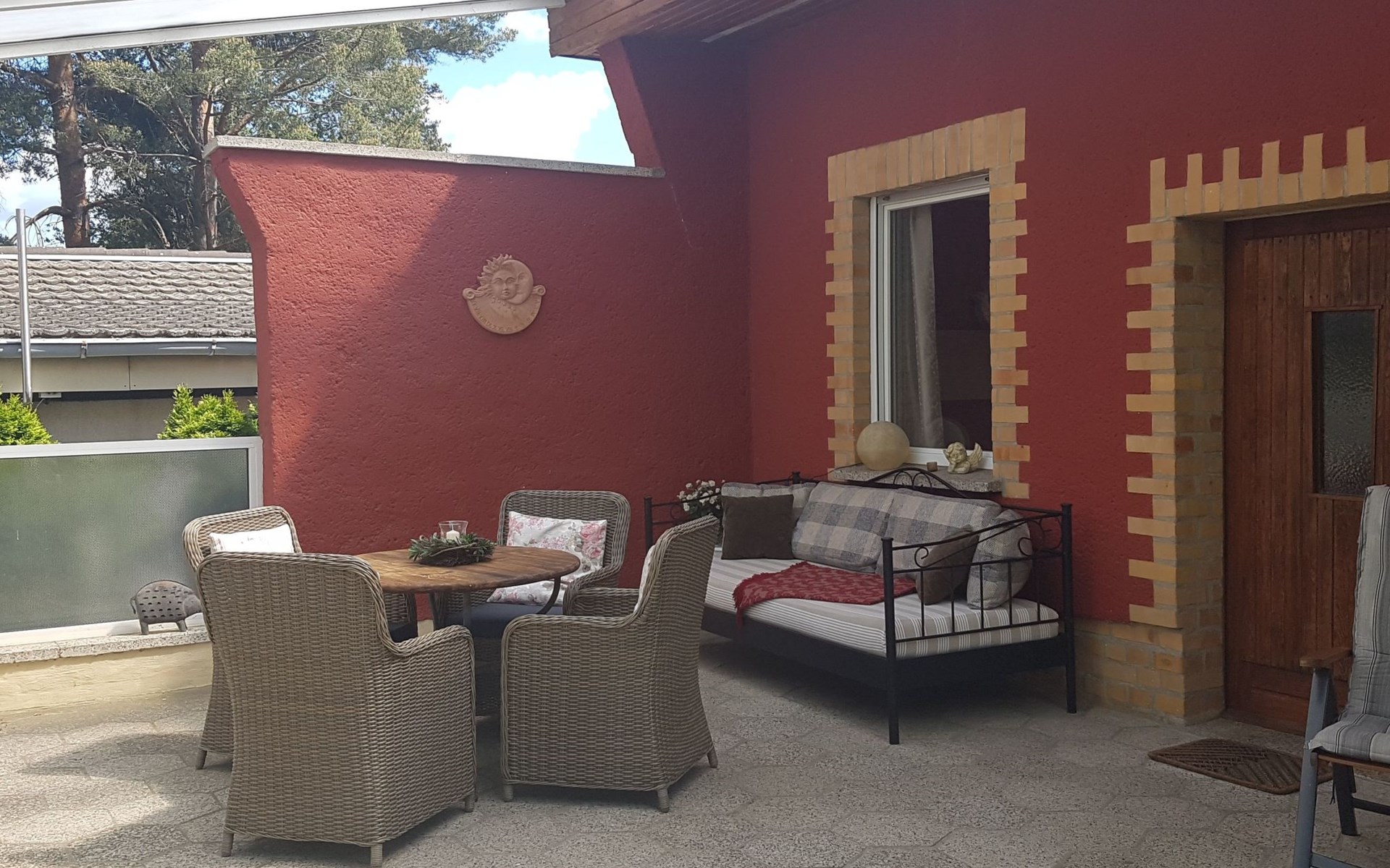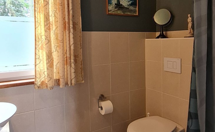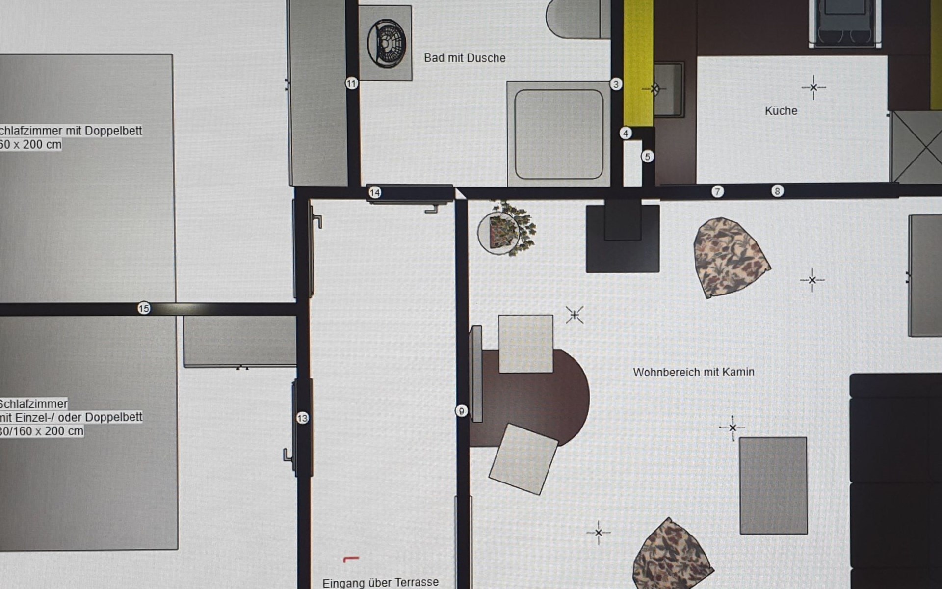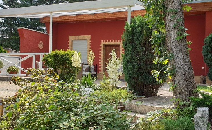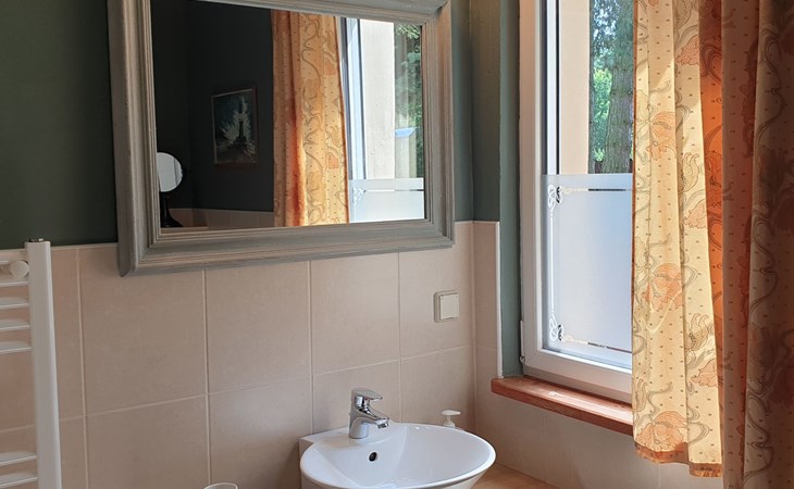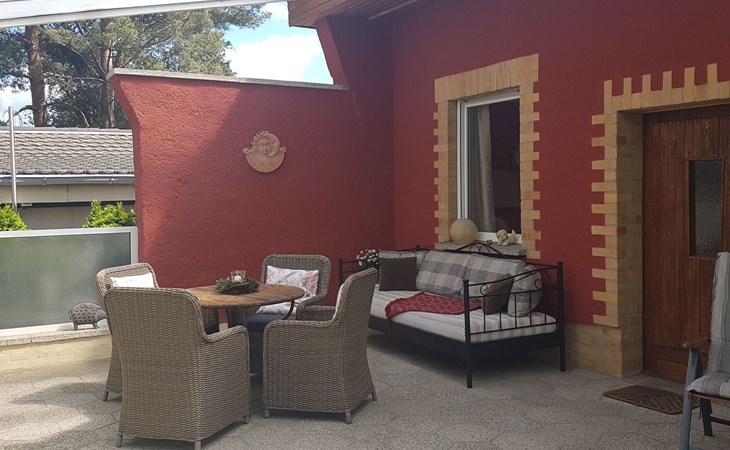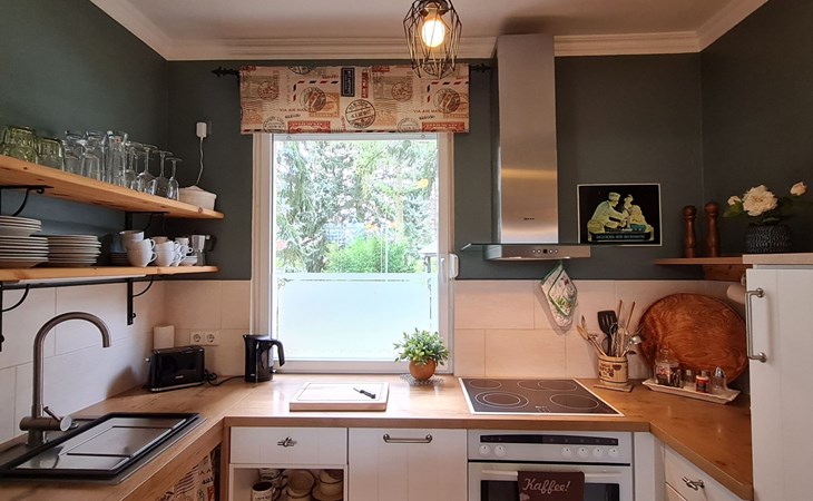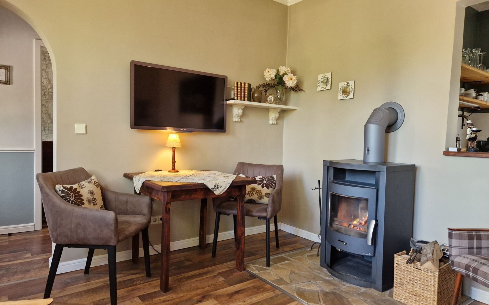 The house is furnished in a modern country house style, the colours are harmoniously coordinated and thus create a pleasant feeling of living that allows you to quickly and easily relax and unwind. The living room with its 16 m² offers enough space to make yourself comfortable. On cooler days, a wood-burning stove provides cosiness. The house can also be heated electrically. The bedrooms have a double bed 160x200cm and a single bed 80x200cm, which can be extended into a double bed. Both rooms are equipped with ceiling fans. The kitchen is well equipped - dishwasher, oven with ceramic hob, extractor fan, microwave, fridge with freezer compartment, coffee machine, espresso maker, tea towels and washing-up liquid are provided