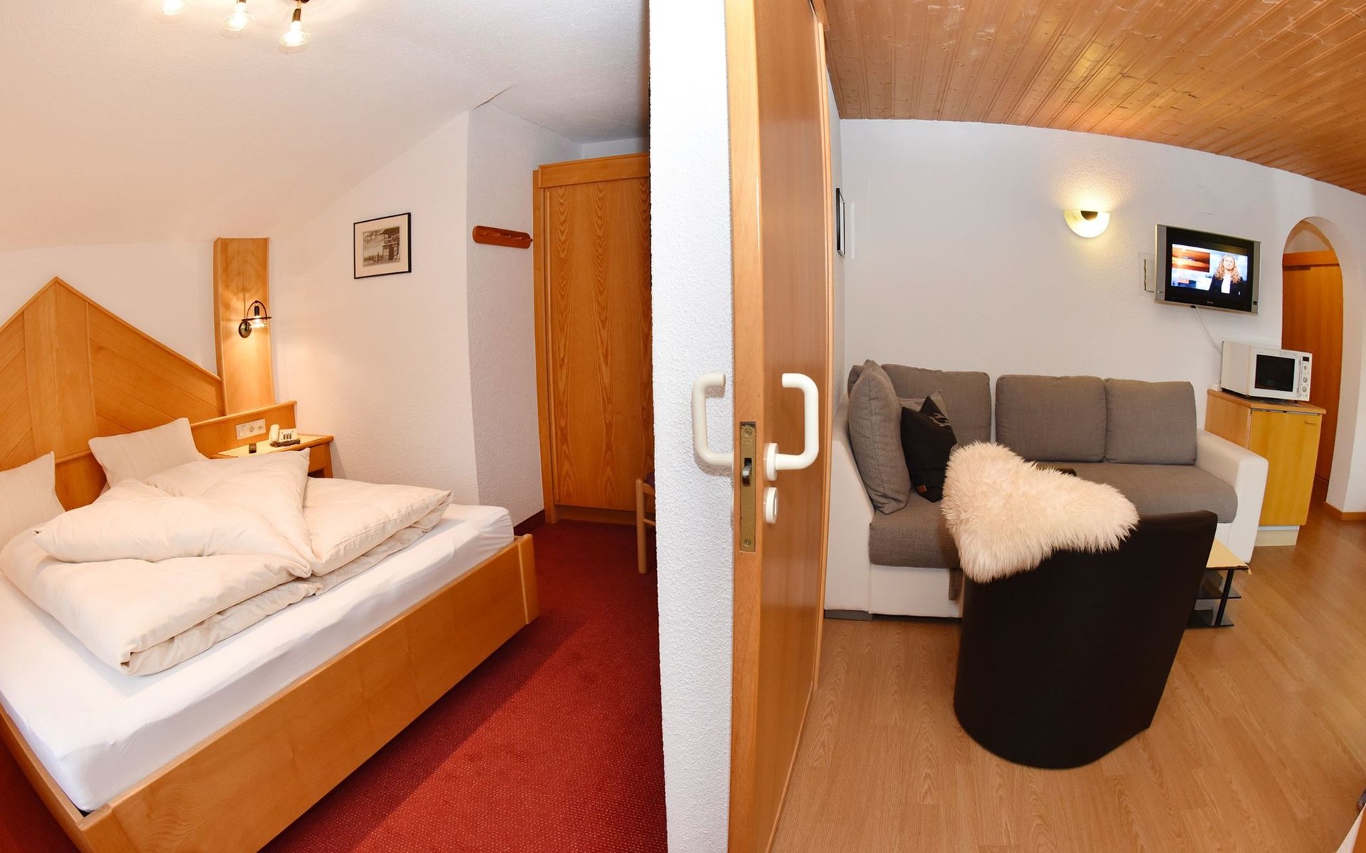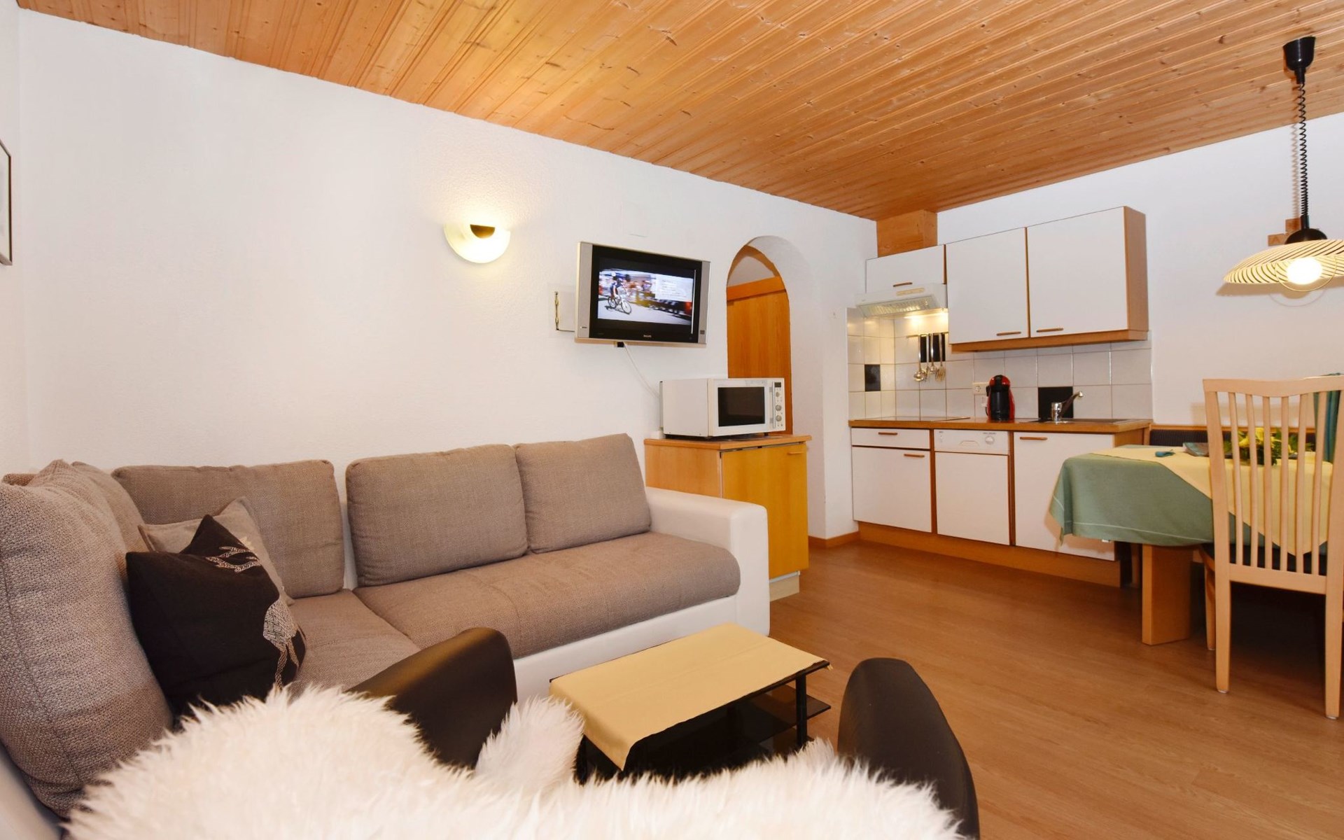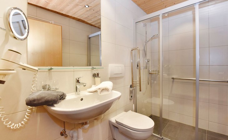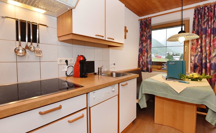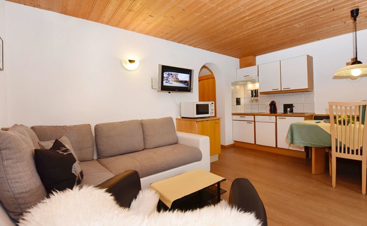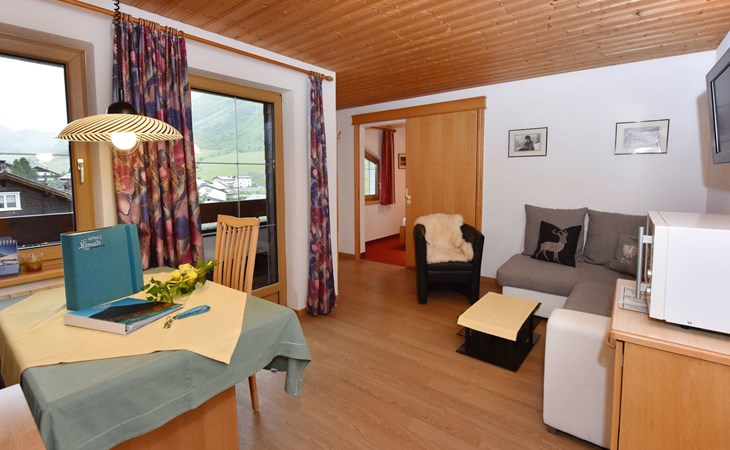Apartment Panorama is ideal for 2 - 4 persons. In this top equipped apartment, you´ll never miss a thing. The two-room apartment (barrier-free apartment) with one double bedroom, a bathroom with shower and toilet, a living kitchen, a sofa bed as well as a balcony (west sided) will offer you a homelike atmosphere. At the dining area with panorama window you can enjoy your breakfast with a fantastic view on the surrounding mountains.