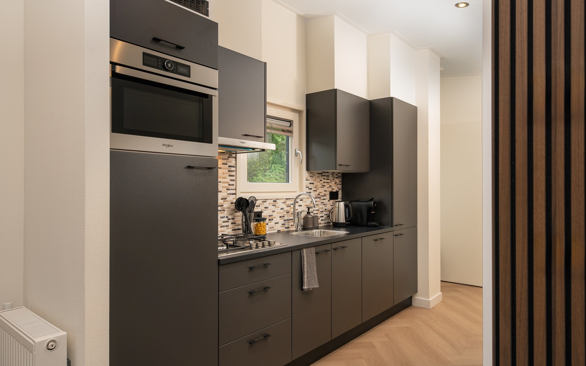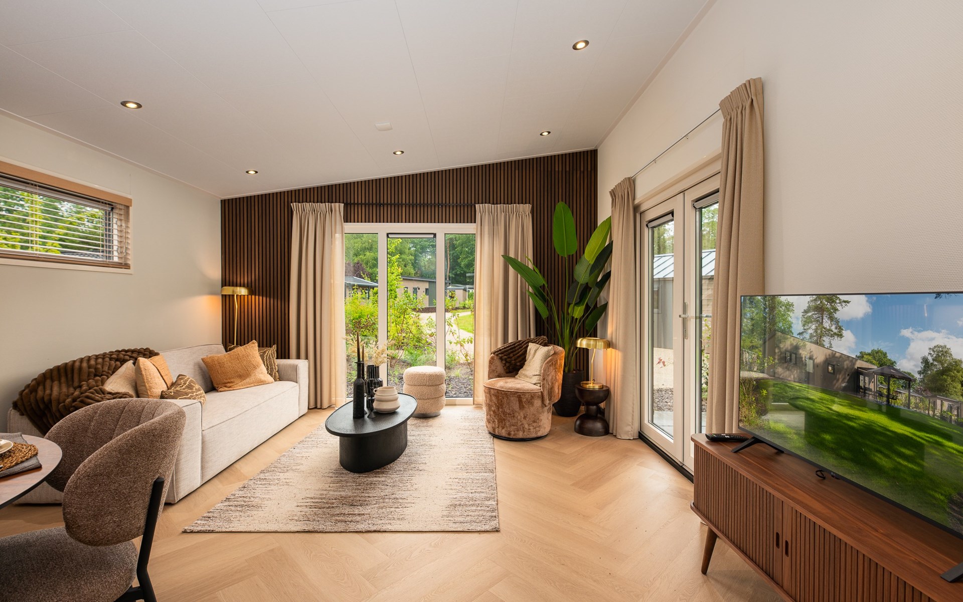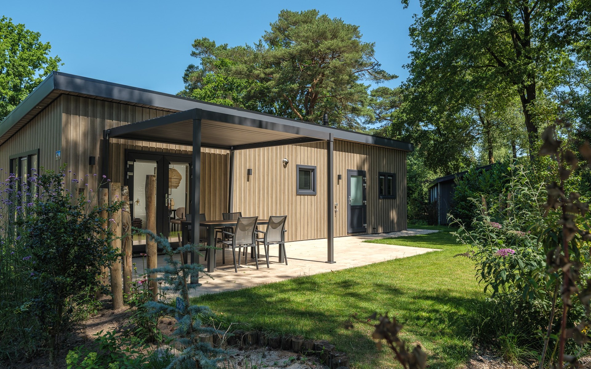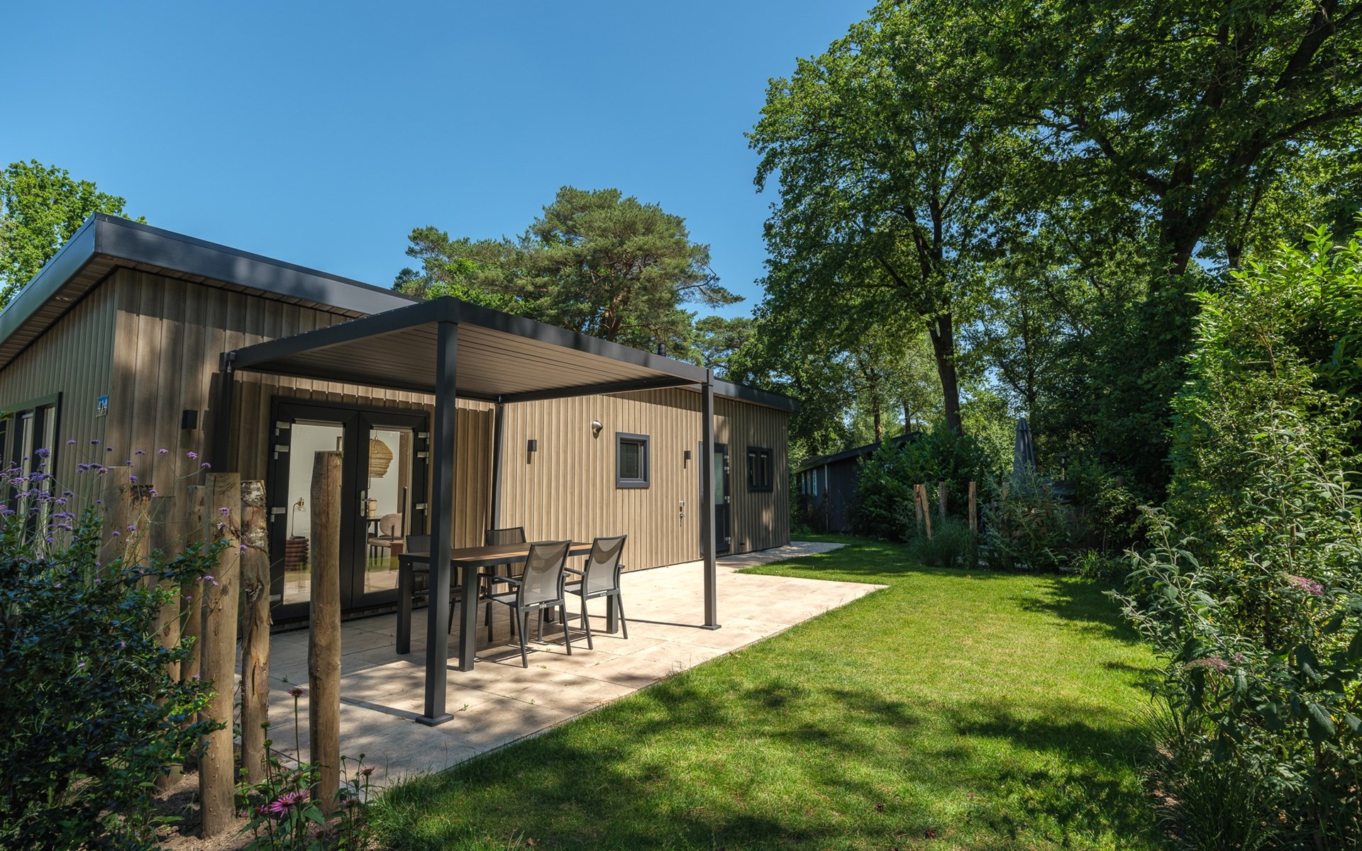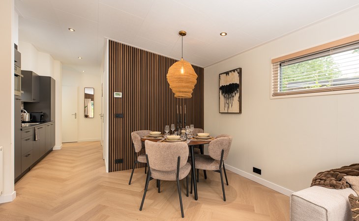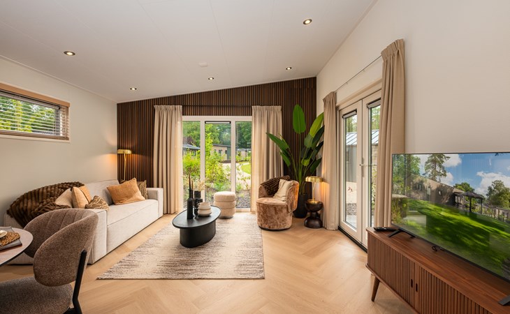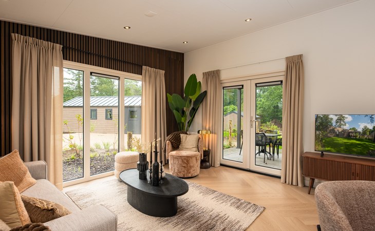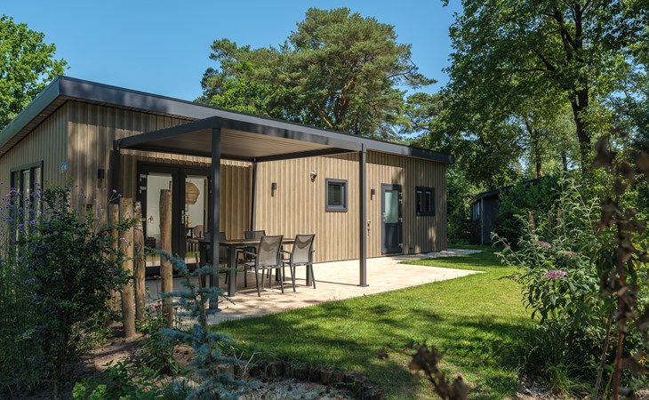 In addition to its stylish interior, the lodge also offers extra comfort with air conditioning that can both heat and cool, ensuring an optimal indoor climate in every season. Outside, you can enjoy the luxury pergola, allowing you to sit outside comfortably even on warm days or during a light rain shower.