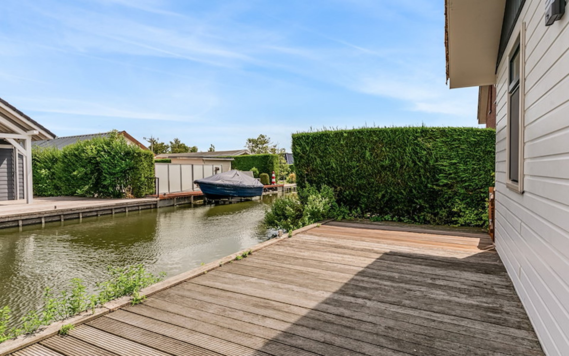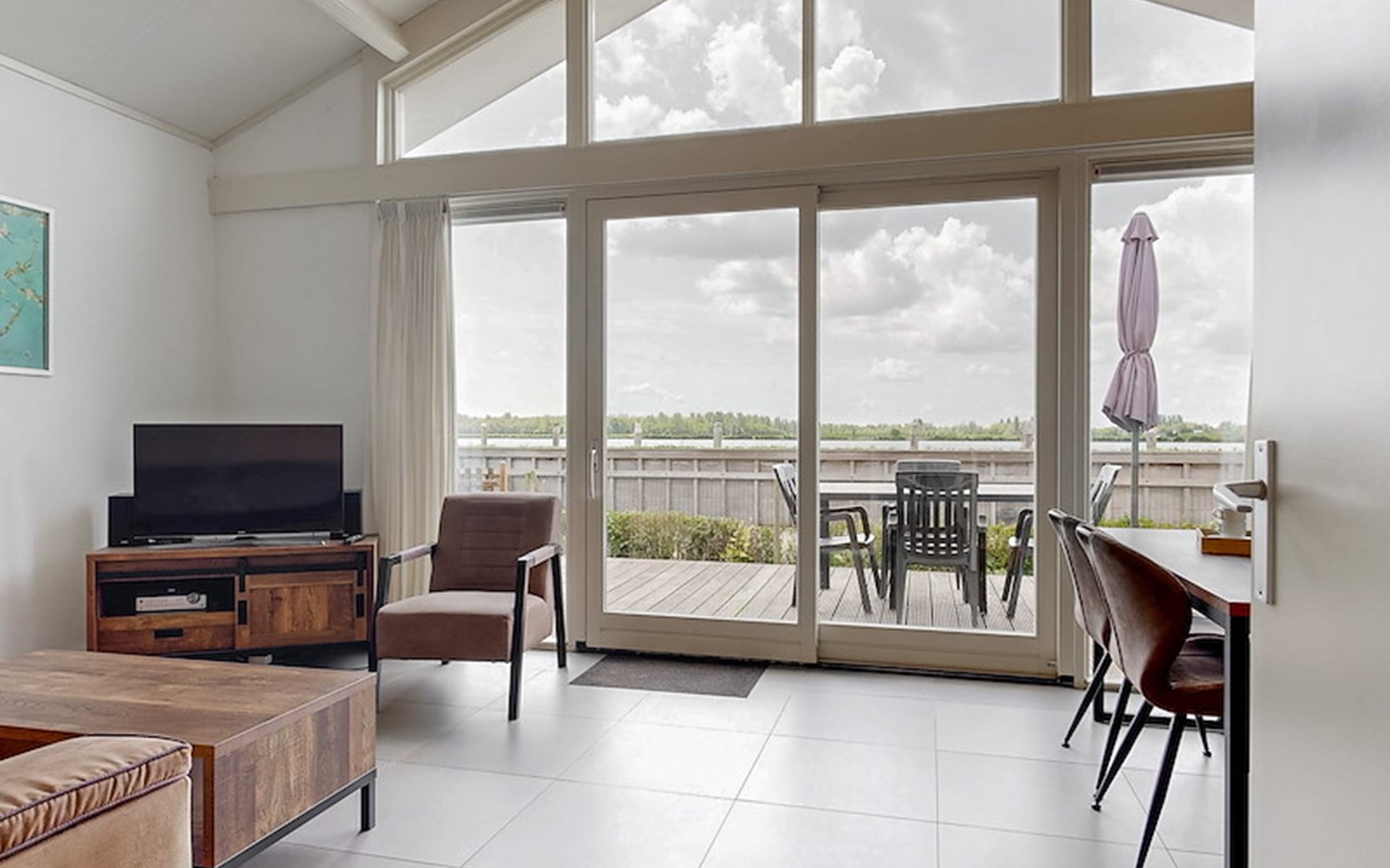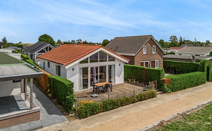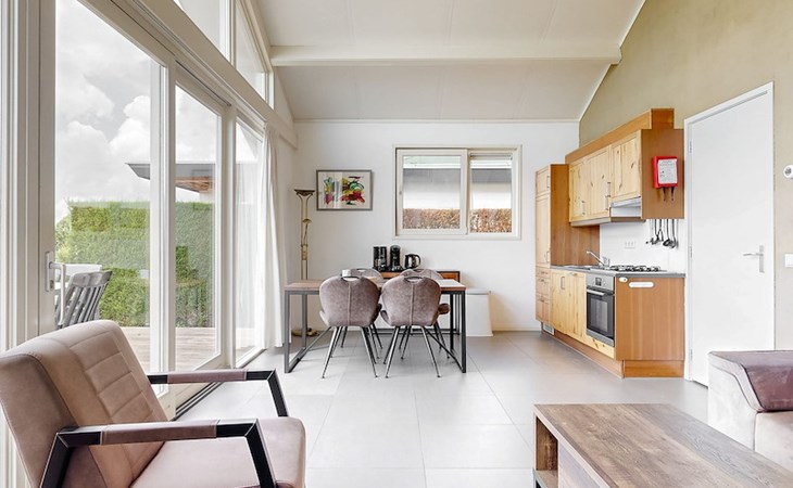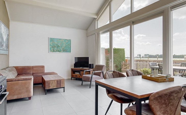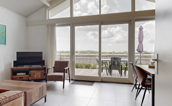The Wilgenroos is a chalet of approximately 65–70 m², suitable for up to 4 persons. The garden is enclosed and features a jetty at the rear, located behind the fence, directly on the open water connected to the inland lake De Groote Vliet. At the front of the chalet, there is a terrace with a view over the Groote Vliet.