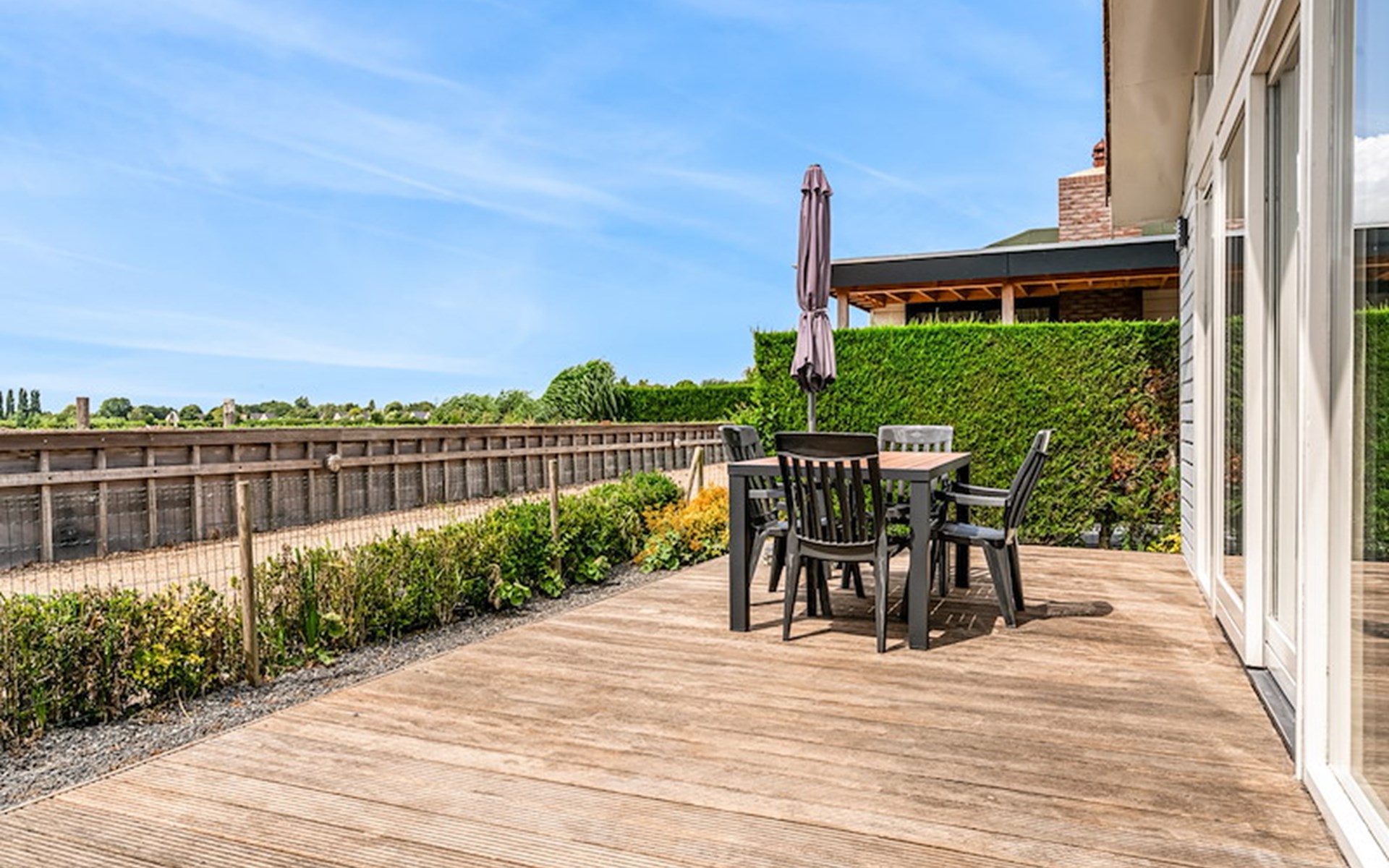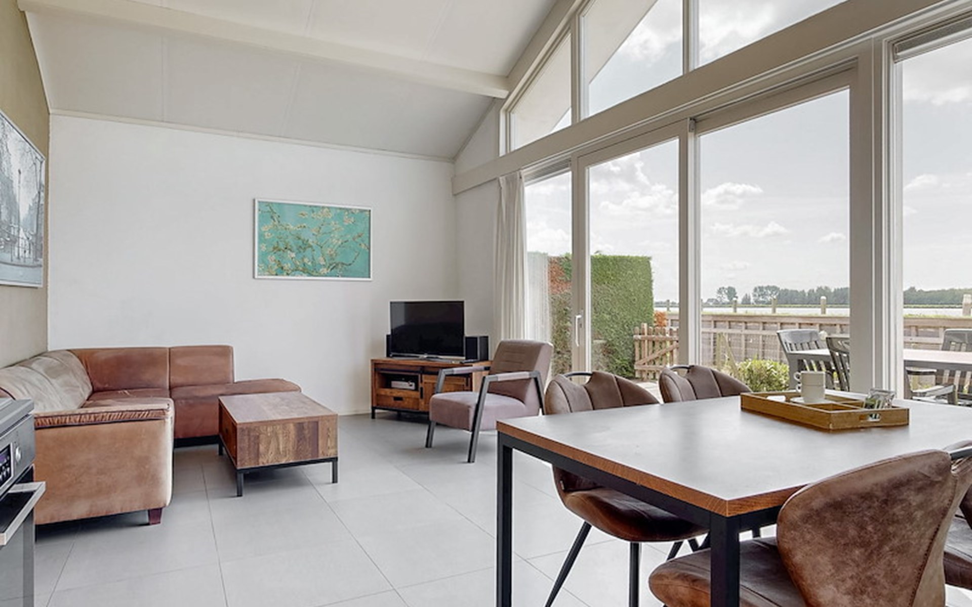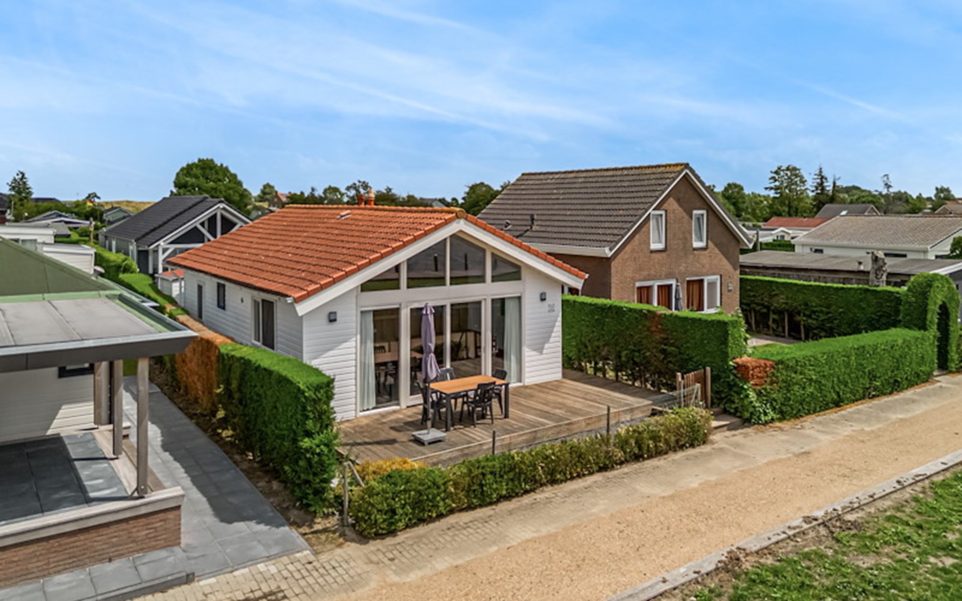 The Wilgenroos is a chalet of approximately 65–70 m², suitable for up to 4 persons. The garden is enclosed and features a jetty at the rear, located behind the fence, directly on the open water connected to the inland lake De Groote Vliet. At the front of the chalet, there is a terrace with a view over the Groote Vliet.