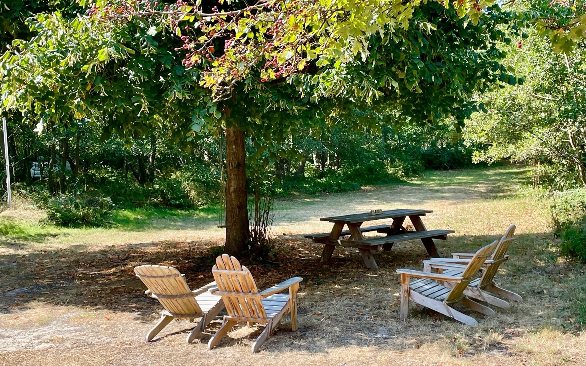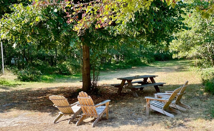 Das Ferienhäuschen liegt wunderschön in einem kleinen Wald am Ende der Straße. Es ist schön ruhig ohne Durchgangsverkehr, von dort führt eine kleine Anlieger-Straße direkt zum Strand. Der Garten ist groß, genug Platz für die beiden Hunde.