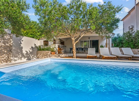 The vacation house is located in the village Ratac near Slano and is ideal for a vacation with the family. It consists of two housing units with access from the outside and is located in the first row to the sea. There are three bedrooms, two bathrooms, kitchen with dining room and a living room. From the living area you can access the large terrace with barbecue. Here you can also enjoy a magnificent view of the sea. The beach, which is accessible only to guests, is located just in front of the house. Dubrovnik is only about 20 km away, there you will find many cultural and activity opportunities. The parking place is located on the property above the house.