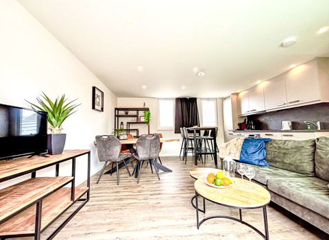 Two bedrooms, one of which has access to the bathroom through a sliding door. This (care) bedroom has a high-low bed and a hoist. The second bedroom has a double bed. In the living room there is a 2-person sofa bed where a 5th and 6th guest can sleep.