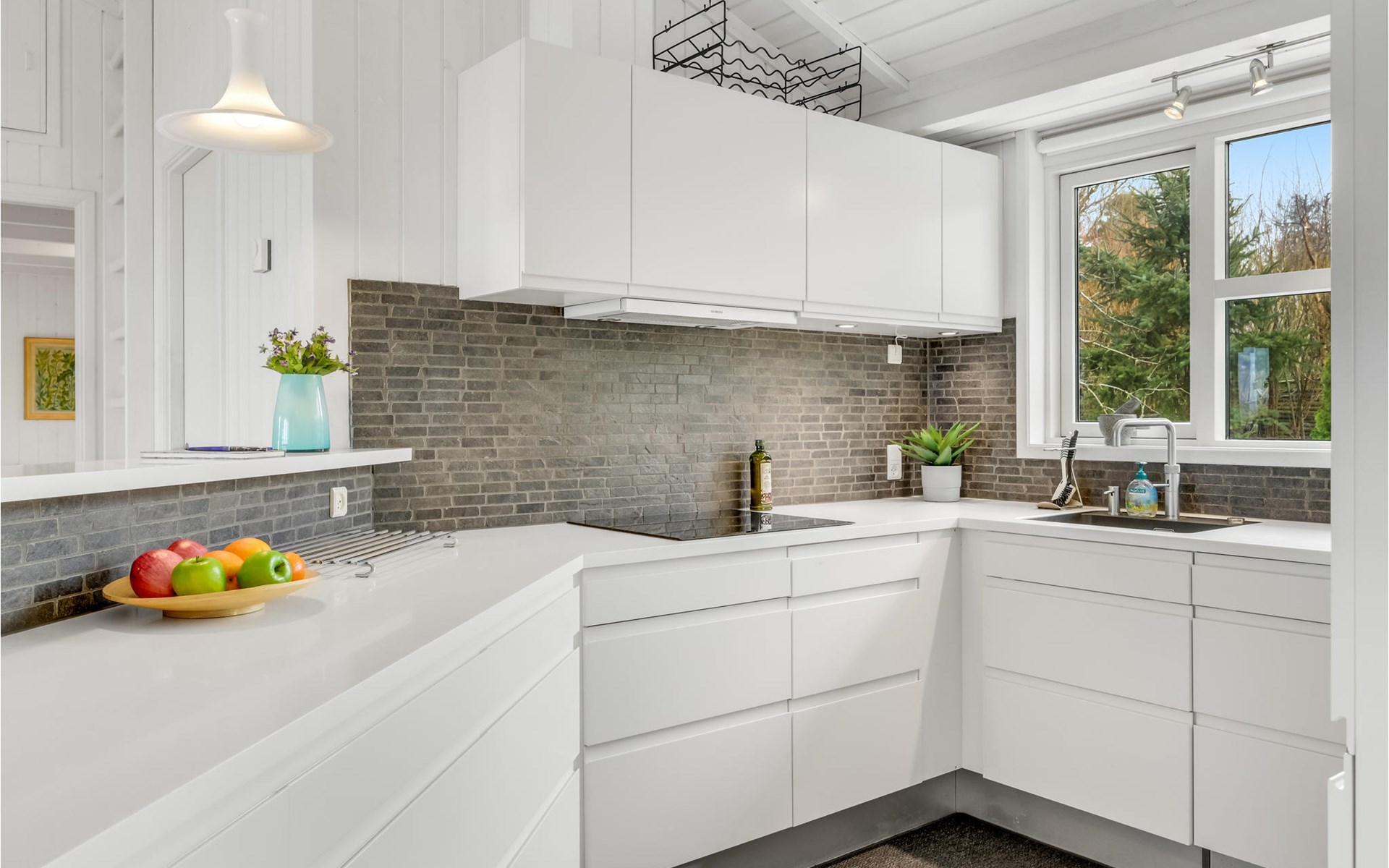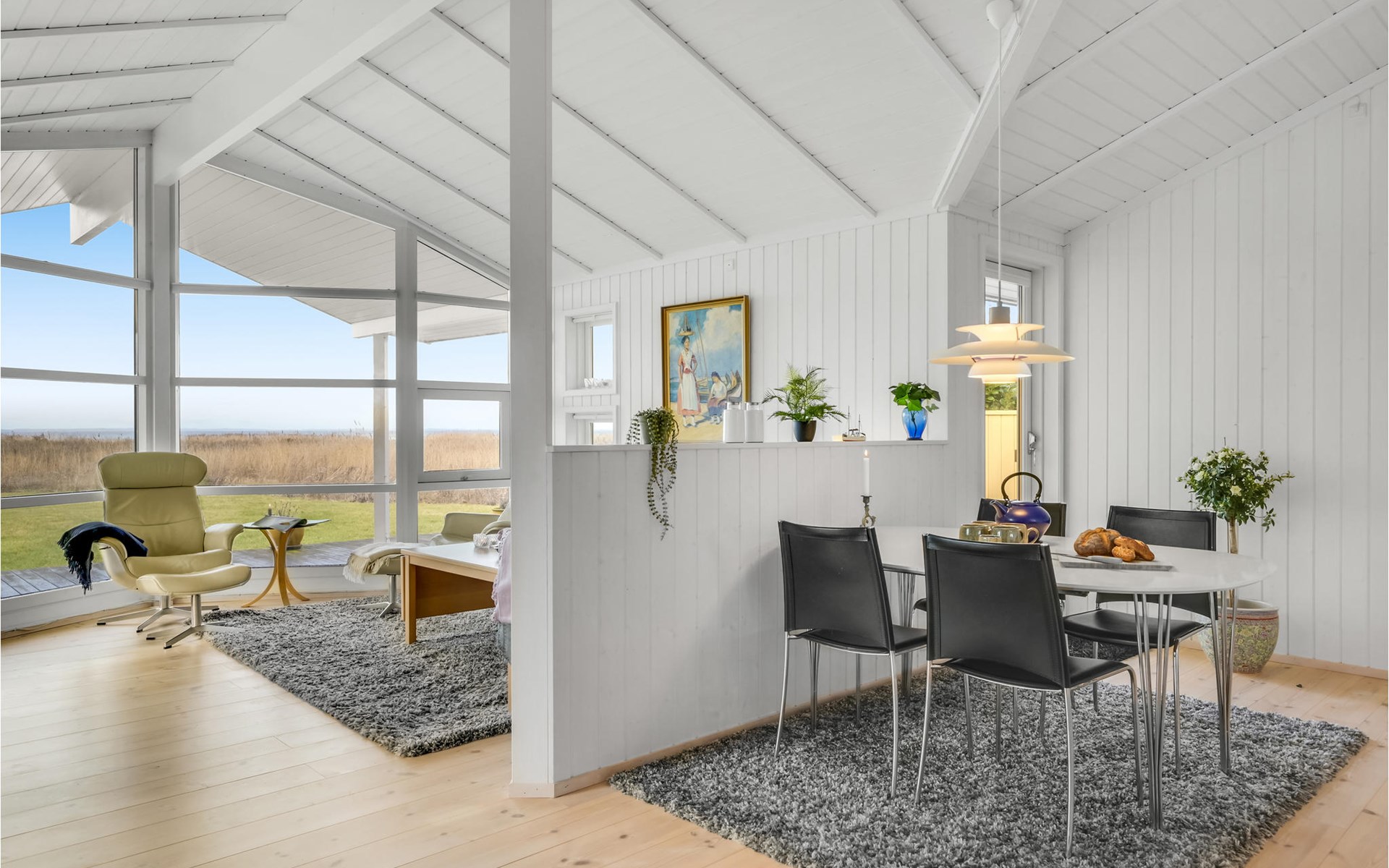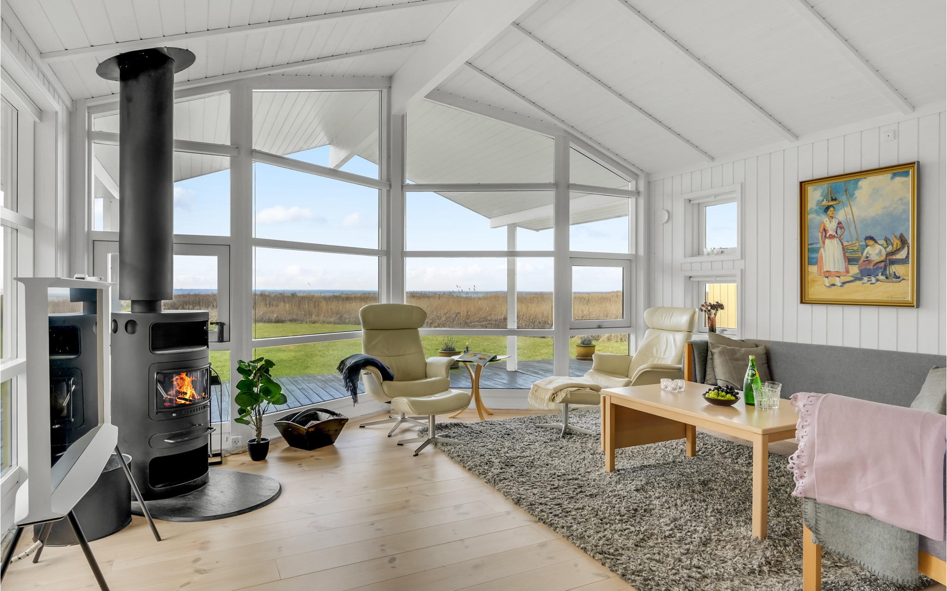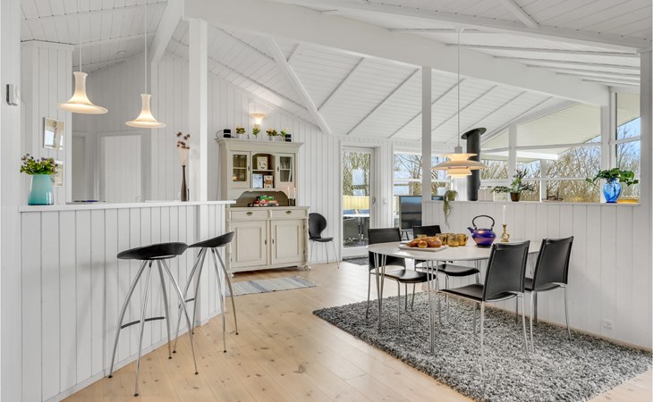 The house welcomes you in a beautiful location. In the bright rooms you can unwind and enjoy your time together in a stylish setting. Through the large window front, a lot of daylight enters the interior of the house, enjoy the beautiful view of the fjord and the surrounding landscape when you relax together on the sofa. In the evening, light the fire in the stove, which exudes cozy warmth and provides a cozy atmosphere.