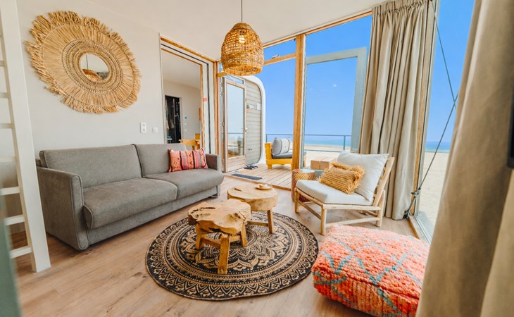 Strandhuisjes zijn luxe ingericht met vaatwasser, magnetron, luxe badkamer en tv. Er zijn 2 terrassen zodat je altijd in de zon of uit de wind kan zitten. Slaapbank, 2 persoon bed met opbergruimte en een stapelbed. Onze strandhuisjes hebben een oppervlakte van +/- 45m2.