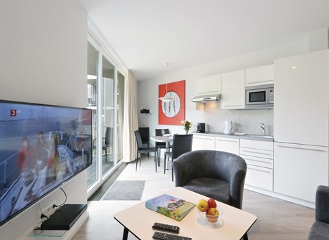 Je feelgood appartement is ingericht met een tweepersoonsbed en maakt indruk met een elegante inrichting in een moderne landhuisstijl, gezellige natuurlijke materialen en maritieme details.