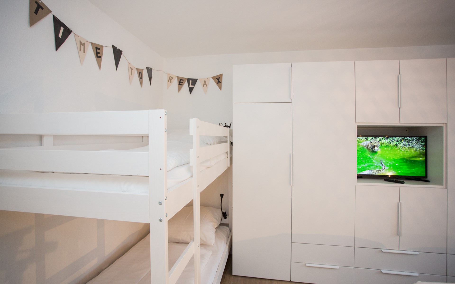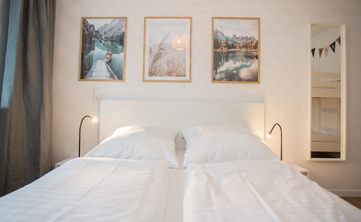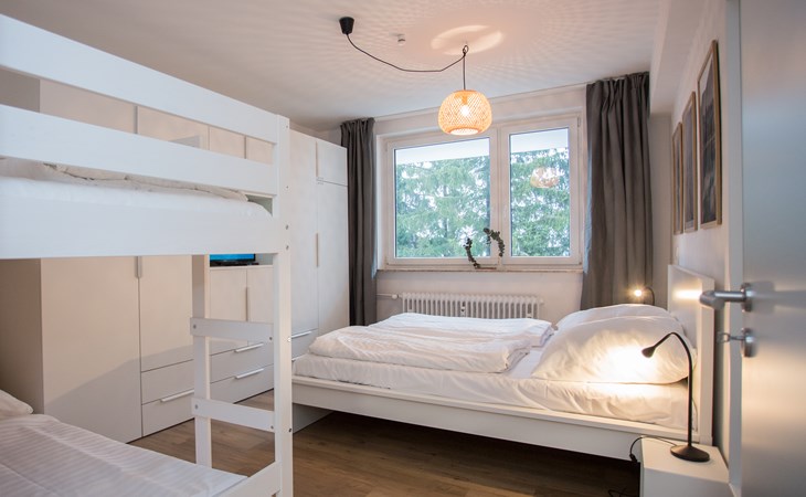 Het appartement heeft één slaapkamer en biedt slaapmogelijkheden voor vier personen. De kamer is ingericht met een tweepersoonsbed (160x200 cm), een stapelbed (90x200 cm) en nachtkastjes. Voor een goede nachtrust hoef je je geen zorgen te maken want de slaapkamer is voorzien van verduisterende raambekleding. Je kunt in alle rust genieten van de vakantie, want door de grote kledingkast in de slaapkamer en de ruime opbergkast in de woonkamer kun je alle kleding en spullen netjes opbergen.