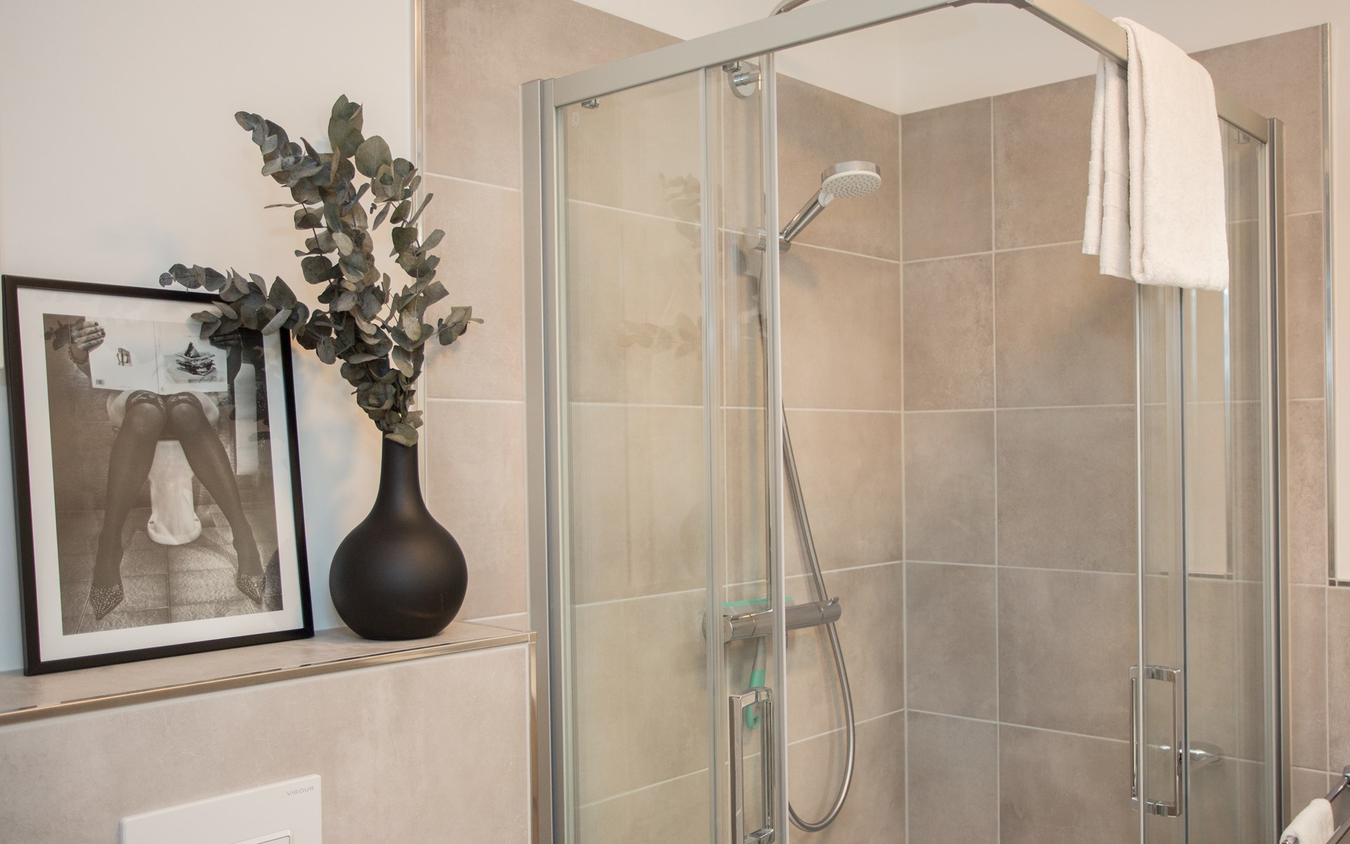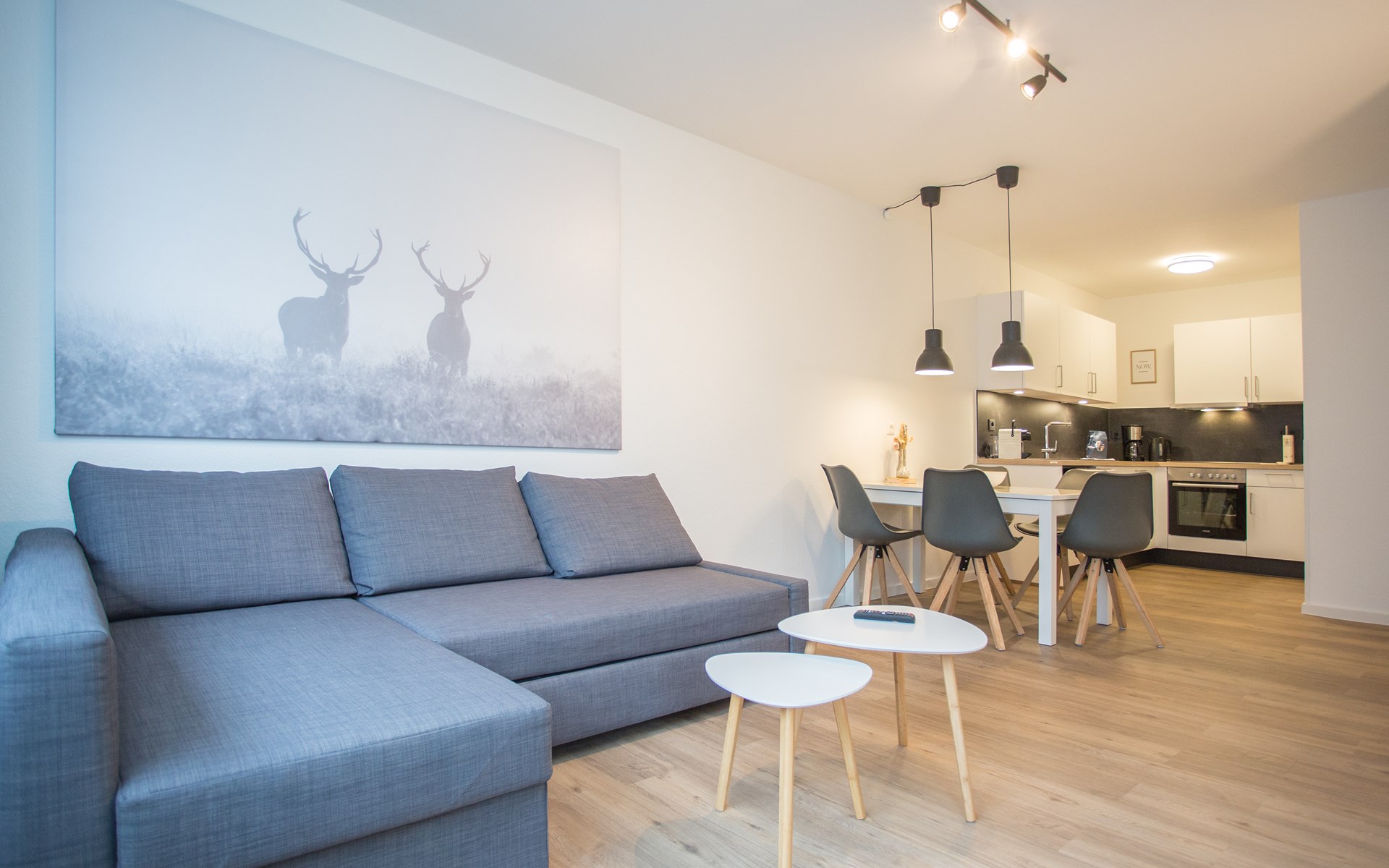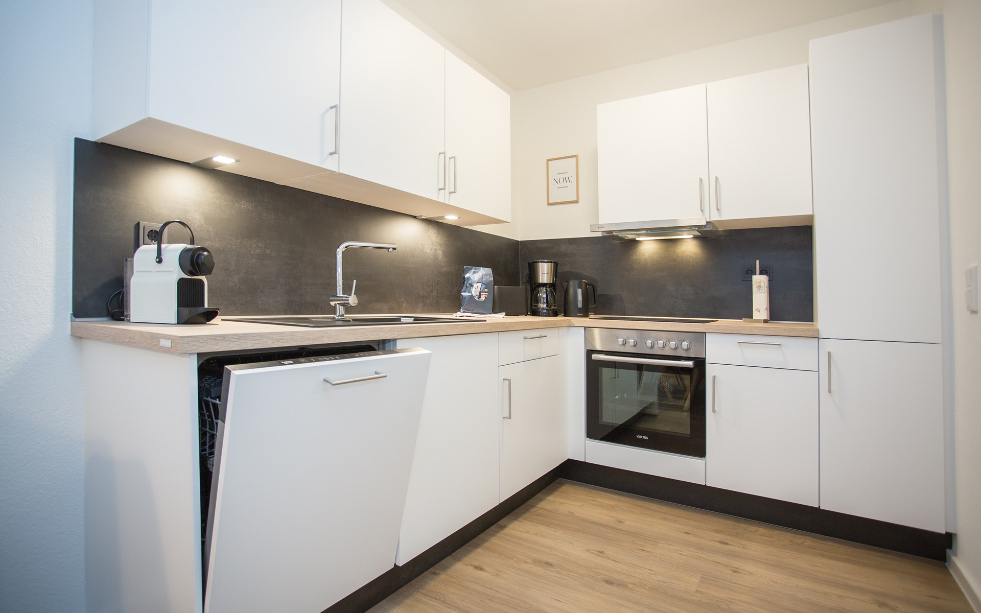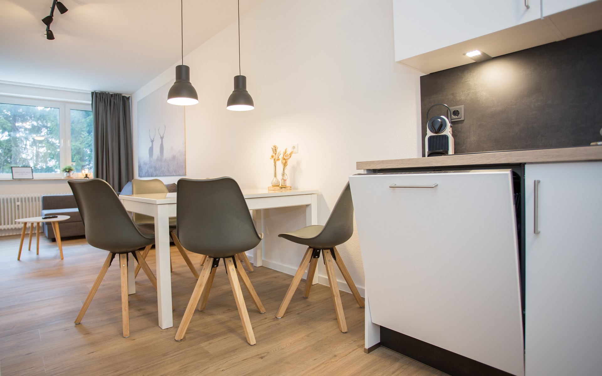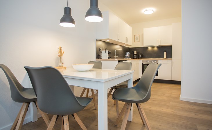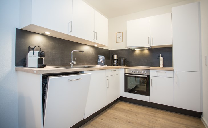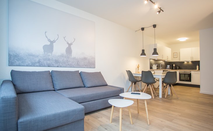 Het appartement bevindt zich op de 3e etage: je komt binnen in de hal die je toegang geeft tot de verschillende vertrekken van het moderne appartement. Het woongedeelte is opgedeeld in een zithoek, eethoek en ruime open keuken. De zithoek is voorzien van een hoekbank met smart televisie, tijdens het verblijf kun je gebruik maken van de wifi. De eethoek is geschikt voor vijf personen waar je heerlijk kunt ontbijten, lunchen of dineren. De maaltijden maak je in de moderne keuken welke is uitgerust met 4-pits kookplaat, oven, koelkast (met vriesvakje), vaatwasser, koffiezetapparaat (filter en Nespresso), waterkoker en toaster.