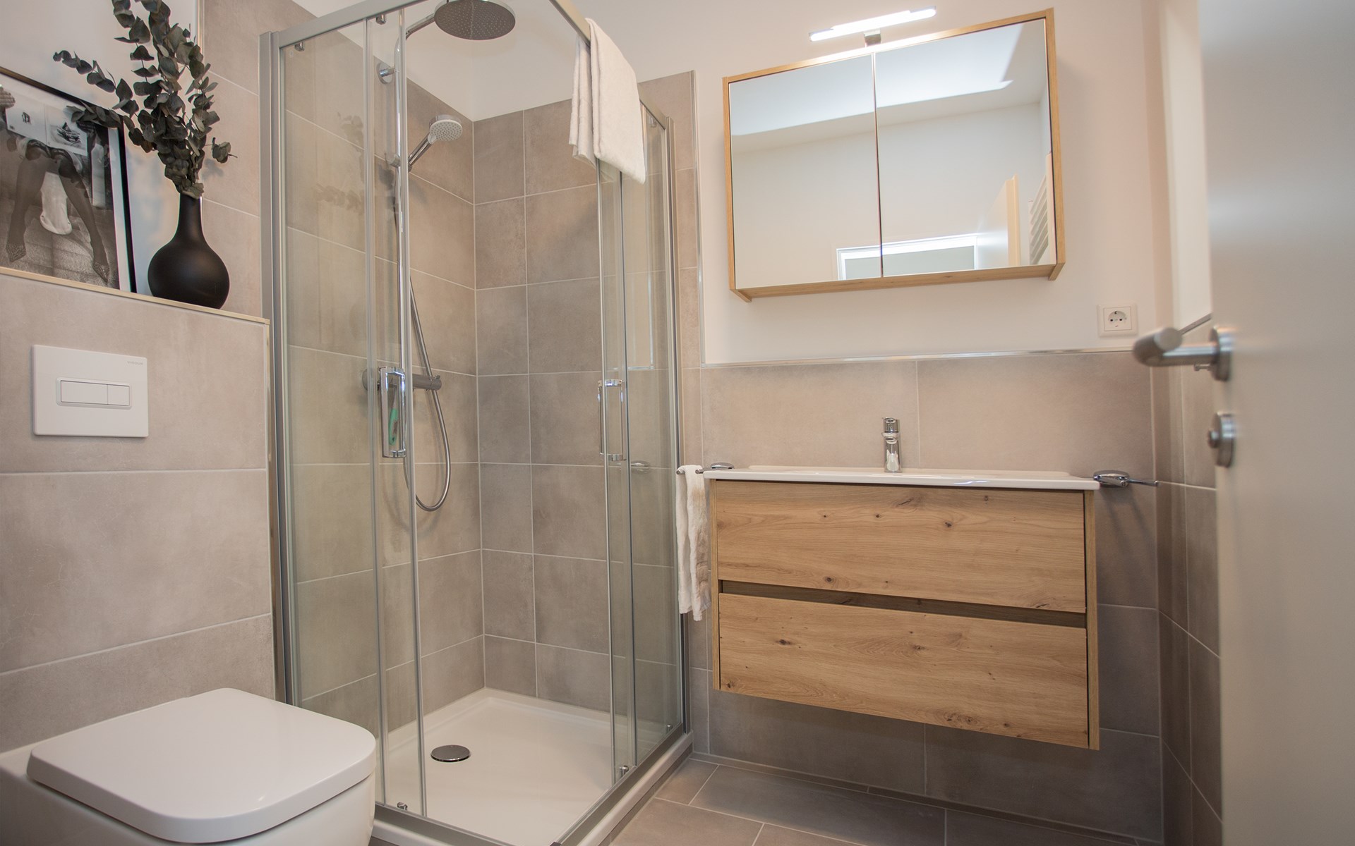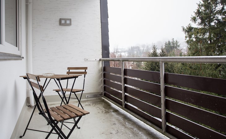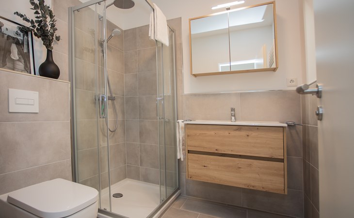 Opfrissen doe je in de nette badkamer. De douchecabine met glazen schuifdeuren heeft een heerlijke regen- en handdouche. Daarnaast is deze sanitaire ruimte voorzien van het toilet een badkamermeubel met wastafel en spiegel. En voldoende ophang- en opbergmogelijkheden. De handdoeken kun je lekker verwarmen en snel drogen door de grote handdoekradiator. Het balkon (6m2) van het appartement heeft een zuidelijke ligging met een prachtig uitzicht en een zitje voor twee personen. Bij de accommodatie behoort ook een ski-/fietsenstalling, een garage van 200 centimeter breed en 190 centimeter hoog. Het is ook mogelijk om de auto buiten de garage te parkeren of (tegen betaling) op openbare parkeerplekken in de buurt.