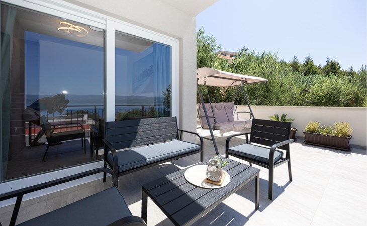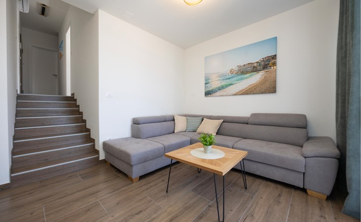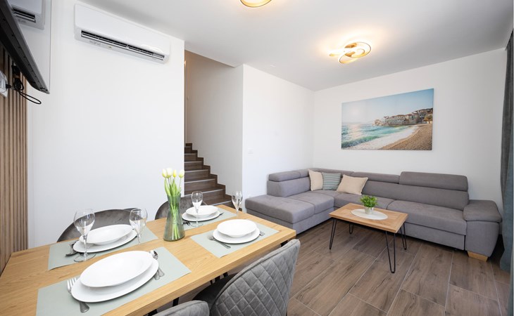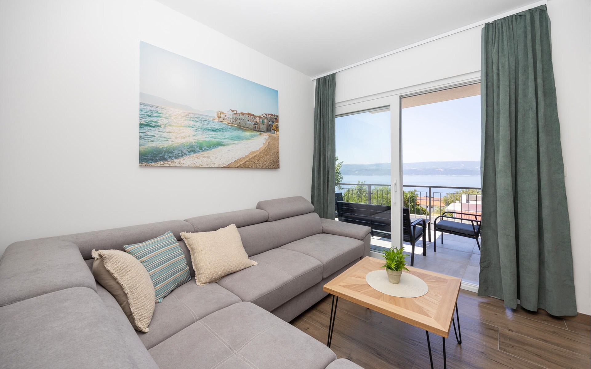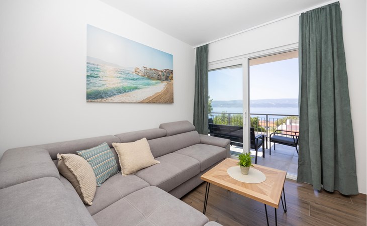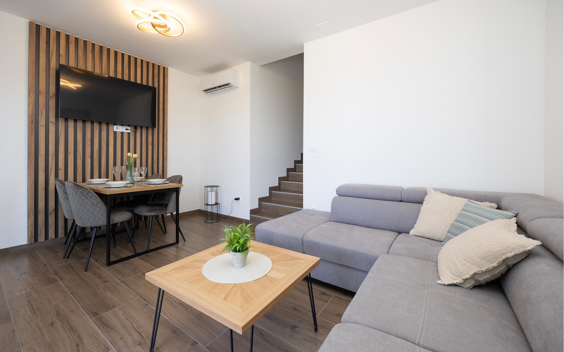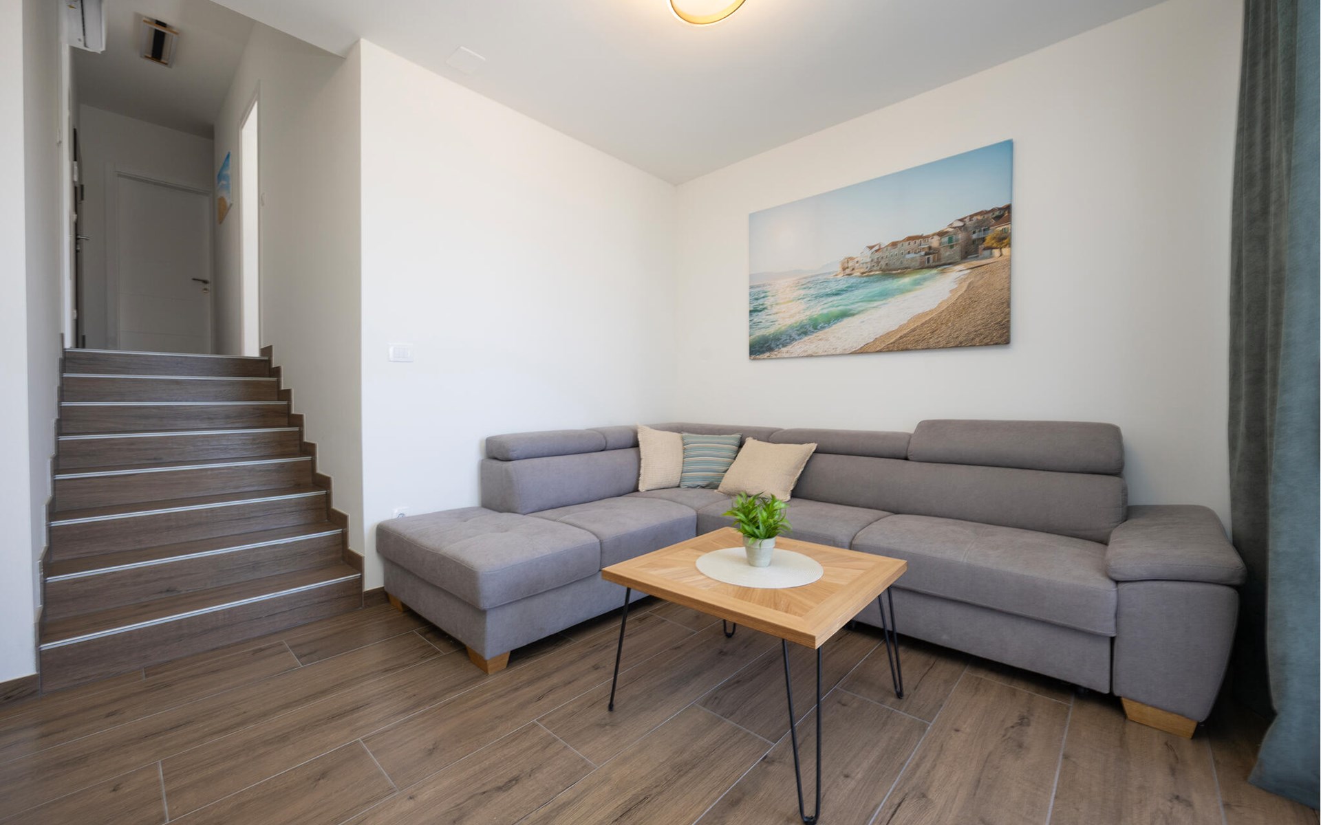 Dit moderne appartement biedt alles wat je nodig hebt voor een comfortabel verblijf. Profiteer van de ideale locatie op slechts een paar minuten lopen van het strand en geniet van de nabijheid van restaurants, cafés en winkels. Maak het jezelf gemakkelijk op de grote bank in de woonkamer, geniet samen van maaltijden aan de eettafel en bereid je favoriete gerechten in de keuken. Het appartement biedt ook directe toegang tot het terras met uitzicht op de Adriatische Zee.
