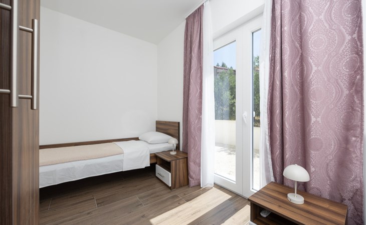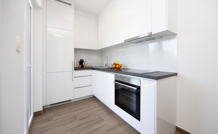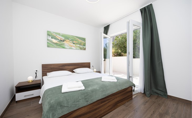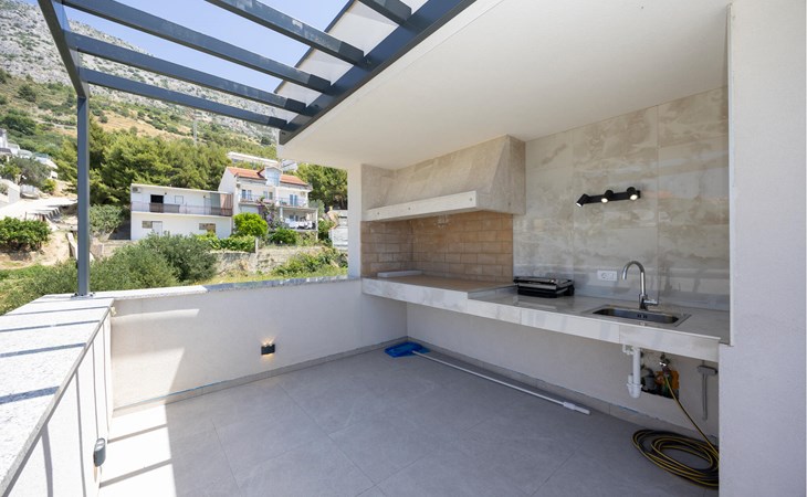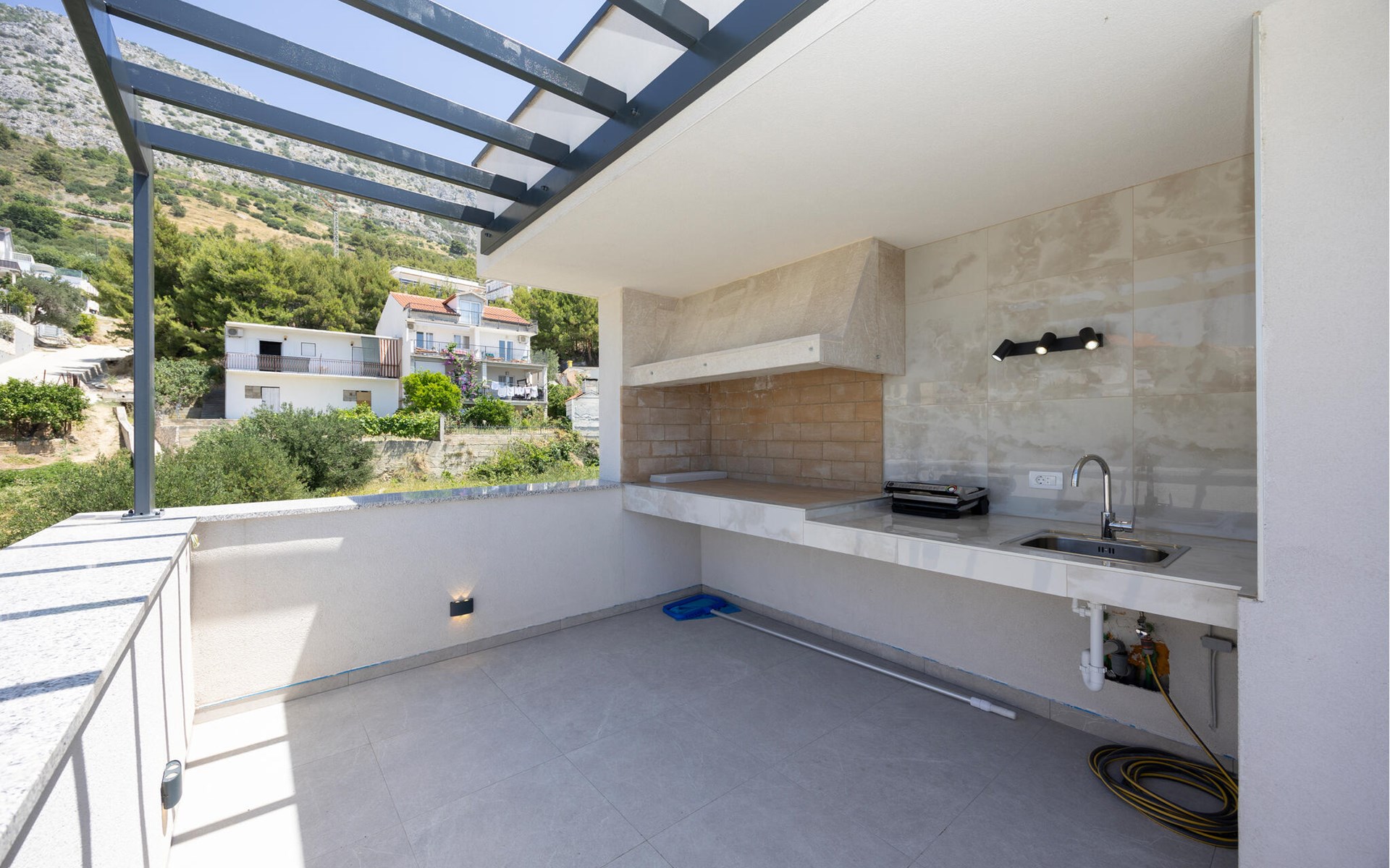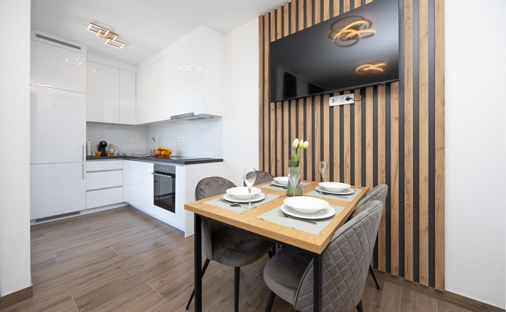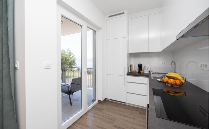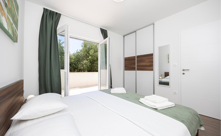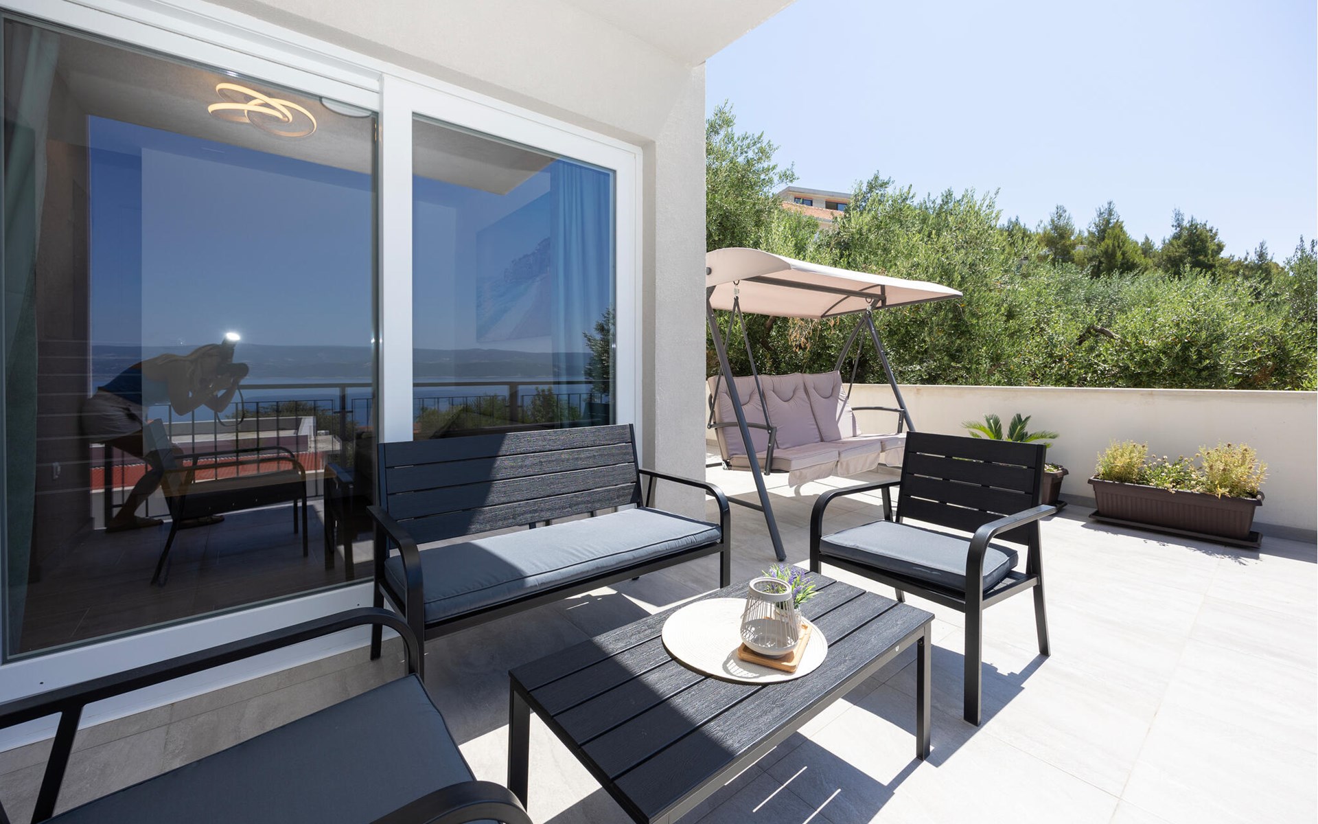 Dit moderne appartement biedt alles wat je nodig hebt voor een comfortabel verblijf. Profiteer van de ideale locatie op slechts een paar minuten lopen van het strand en geniet van de nabijheid van restaurants, cafés en winkels. Maak het jezelf gemakkelijk op de grote bank in de woonkamer, geniet samen van maaltijden aan de eettafel en bereid je favoriete gerechten in de keuken. Het appartement biedt ook directe toegang tot het terras met uitzicht op de Adriatische Zee.