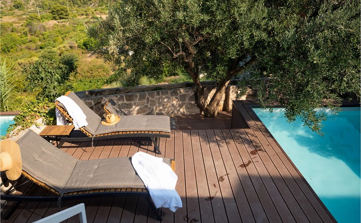 Villa Bea heeft uitzicht op zee vanuit een slaapkamer en het onderste terras. Op het buitenterras zorgt het 21 m2, 1,4 m diepe zwembad voor een aangename verfrissing, met daarnaast een zonneterras met 4 ligstoelen. Er is ook een buiteneettafel waar je tot laat in de avond kunt genieten van een drankje met je geliefden.