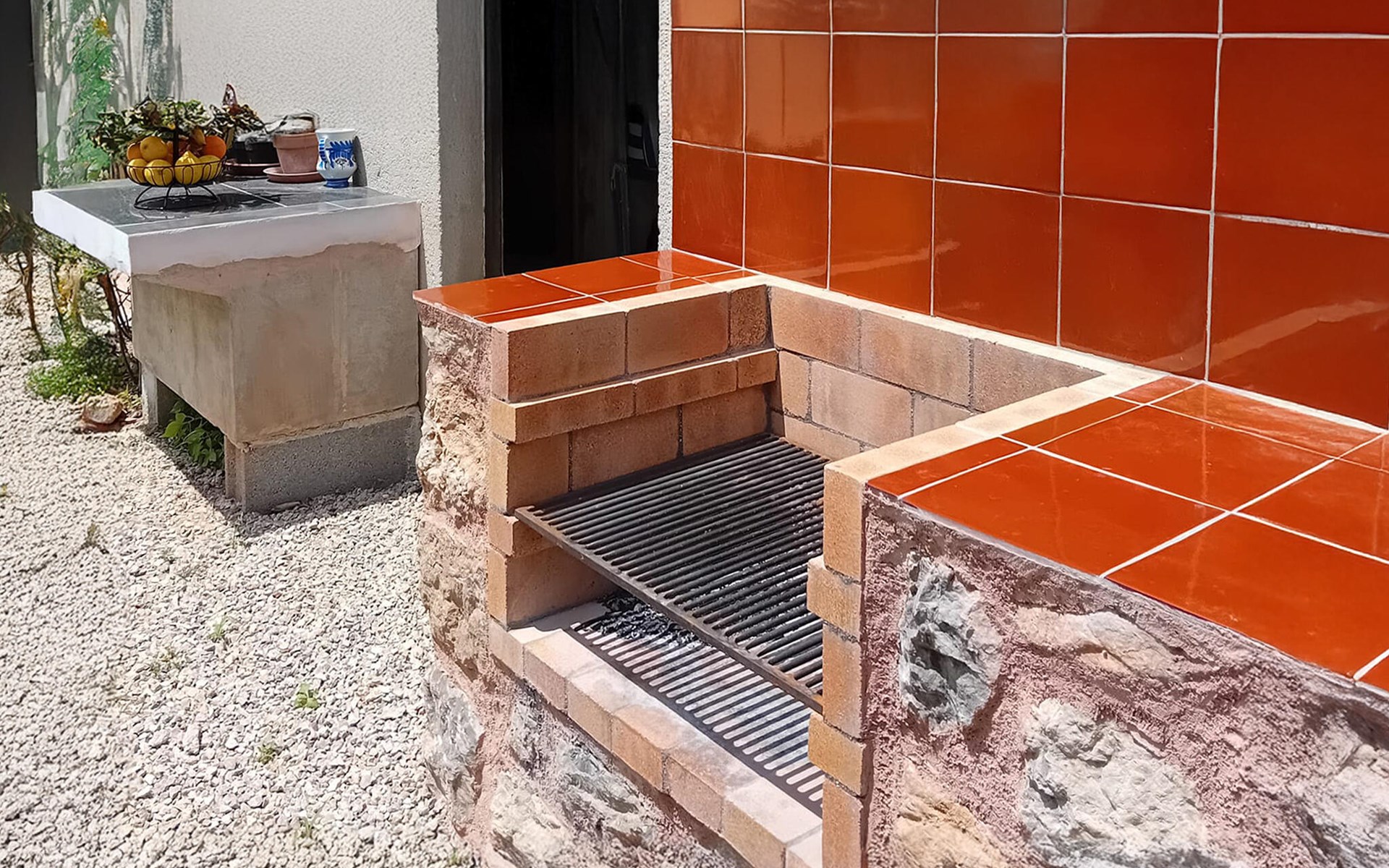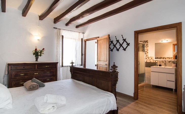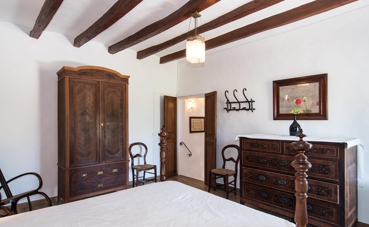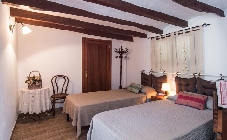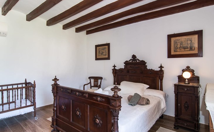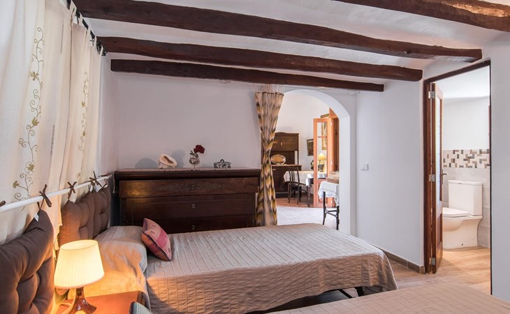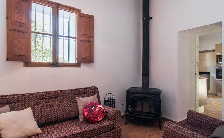 Binnen in het huis vind je een rustieke, gezellige sfeer. Hier leef je net zo authentiek als de lokale bevolking: Een aardkleurige stenen vloer en houten luiken zorgen ervoor dat het aangenaam koel blijft in de zomermaanden. Je kunt de temperatuur ook regelen met het warm/koud airconditioningsysteem in het woongedeelte. De ruime entree leidt naar de woonkamer, die wordt afgescheiden door een dubbele deur en een gezellige zithoek heeft die op koudere avonden kan worden omgetoverd tot een open haard lounge. De moderne, volledig uitgeruste keuken heeft een gas- en keramische kookplaat. Vanaf hier heb je direct toegang tot het overdekte terras, zodat je je maaltijden zonder omwegen kunt serveren. Er is ook een slaapkamer met een eigen badkamer op de begane grond. Op de bovenverdieping vind je de andere twee slaapkamers, die een en-suite badkamer delen. Twee van de drie slaapkamers zijn uitgerust met tweepersoonsbedden (de ene is 1,50 m breed, de andere 1,35 m breed); de derde kamer heeft twee eenpersoonsbedden. Houten balkenplafonds en donkere meubels staan in mooi contrast met de lichtgekleurde gordijnen, die zacht licht binnenlaten. De moderne badkamers hebben inloopdouches en grote wastafels.